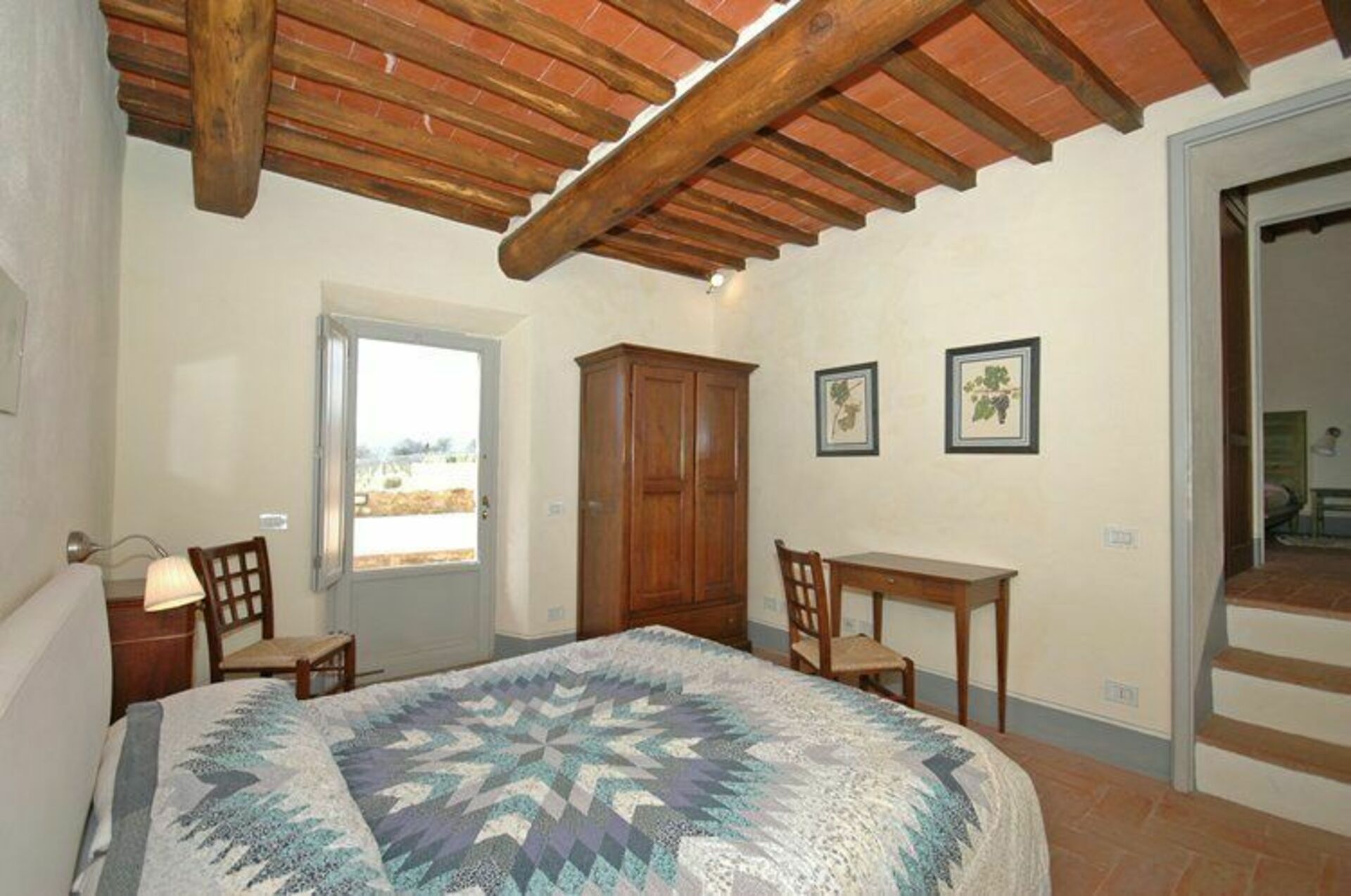 3 Stufen tiefer: Doppelzimmer mit Bad mit Dusche und Zugang zu einer kleinen, privaten Terrasse.