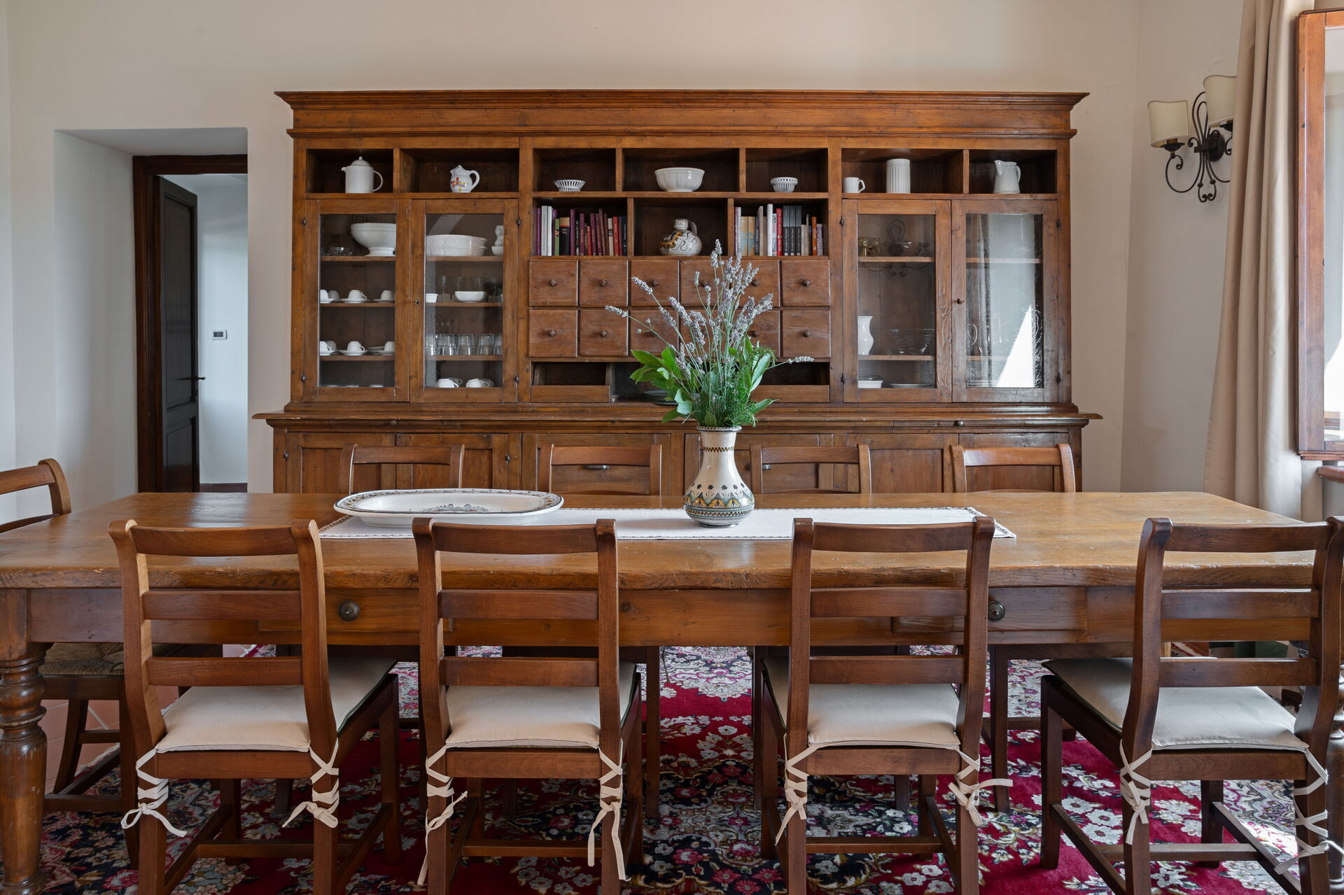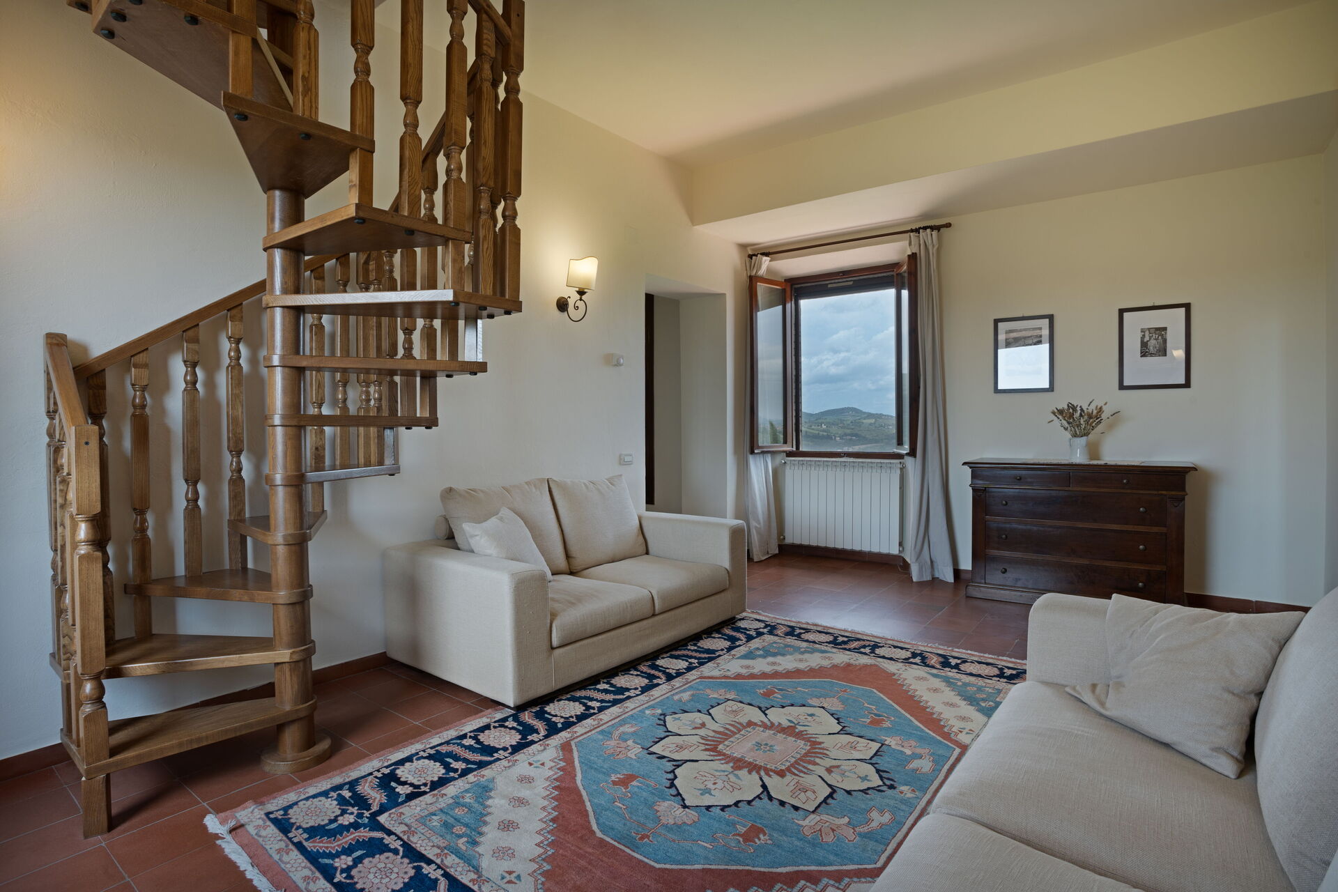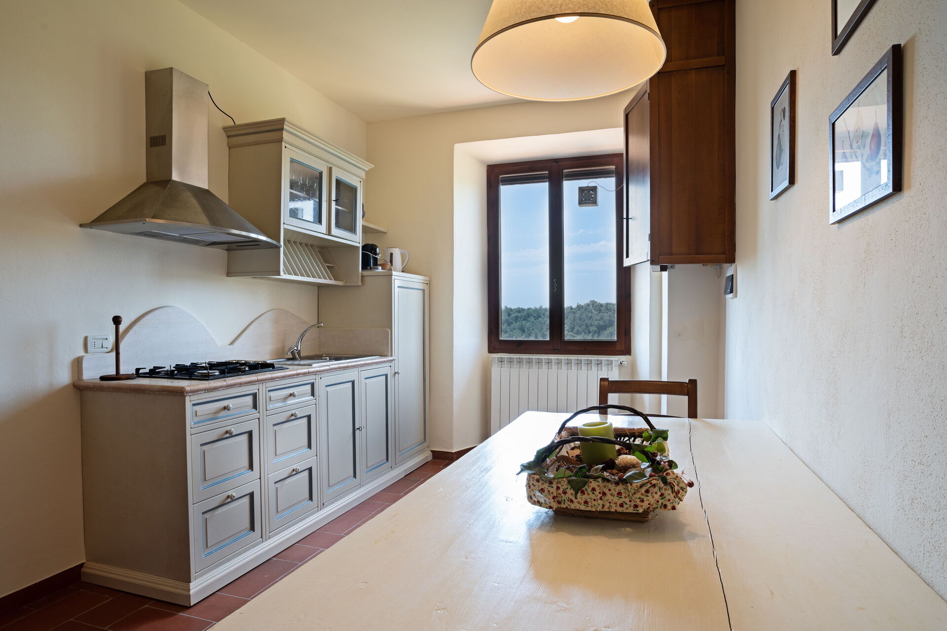 Zweiter Stock: Küche (4 Kochstellen, Kühlschrank, Espressomaschine, Wasserkocher) mit Esstisch, Doppelzimmer mit Ehebett und privatem Bad mit Dusche, Wohnzimmer, Doppelzimmer mit Ehebett, Bad mit Dusche.