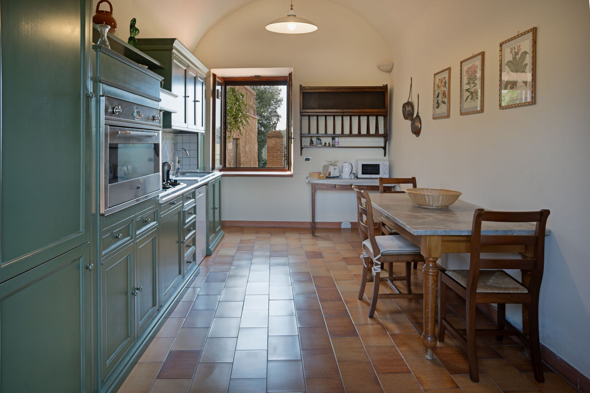 Erdgeschoss: Wohnzimmer (TV und Kamin) mit Essbereich und Zugang ins Freie, Küche (Backofen, Geschirrspüler, Mikrowelle, Wasserkocher, Toaster, Espresso-Maschine, Kühlschrank, Gefrierschrank), WC.
