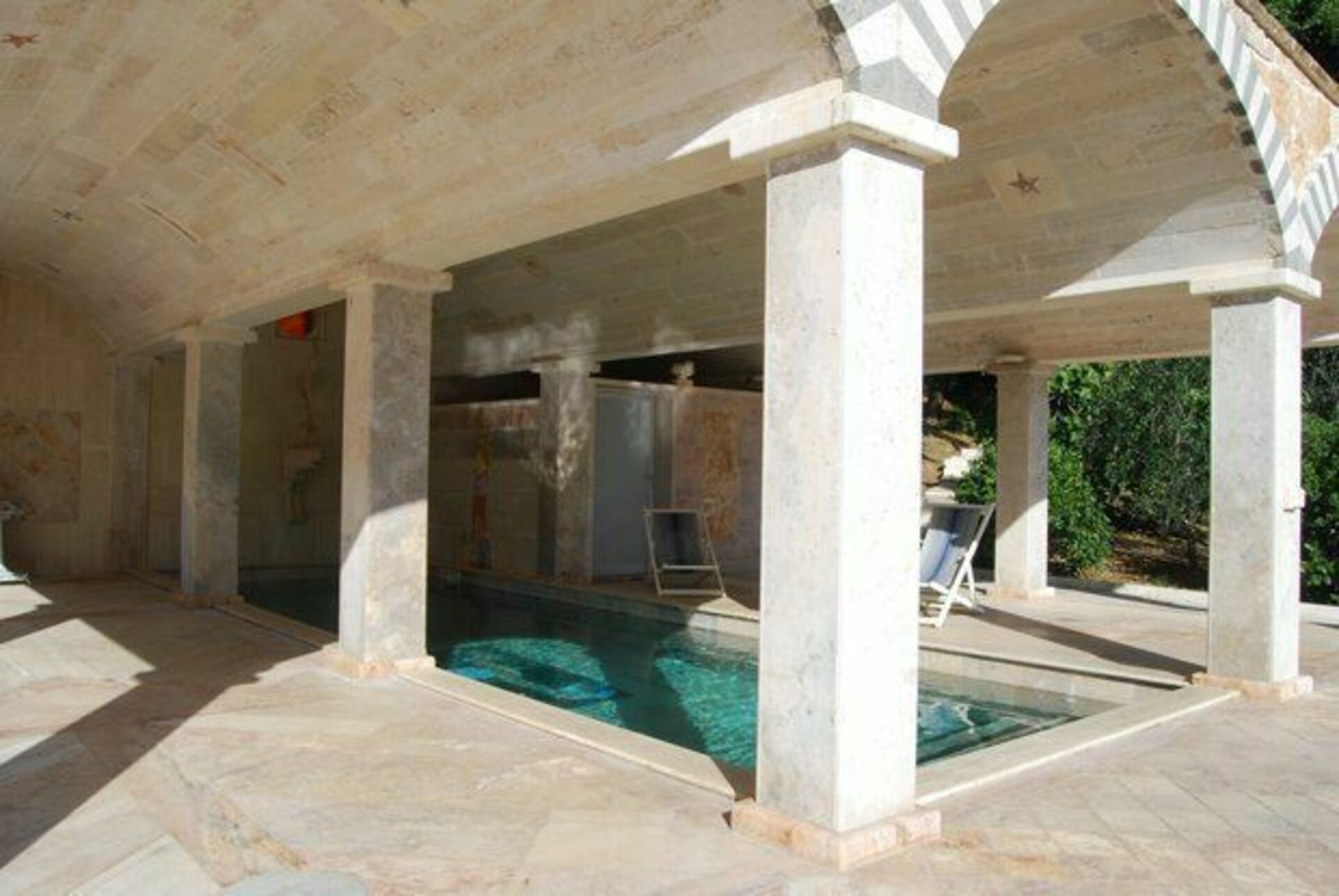 Die Gäste genießen großzügige Außenbereiche, darunter zwei Schwimmbäder: eines im Freien und ein zweites, das von einem wunderschönen Travertindach überdacht ist (ebenfalls im Freien) und dank Erdwärme auf 36 °C beheizt wird. Dieses beheizte Schwimmbad sorgt selbst in den kältesten Jahreszeiten für angenehmes Badevergnügen.