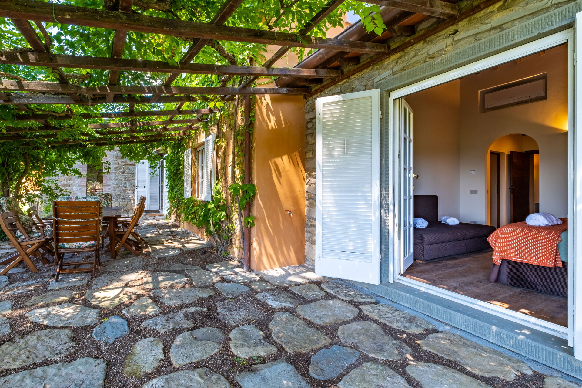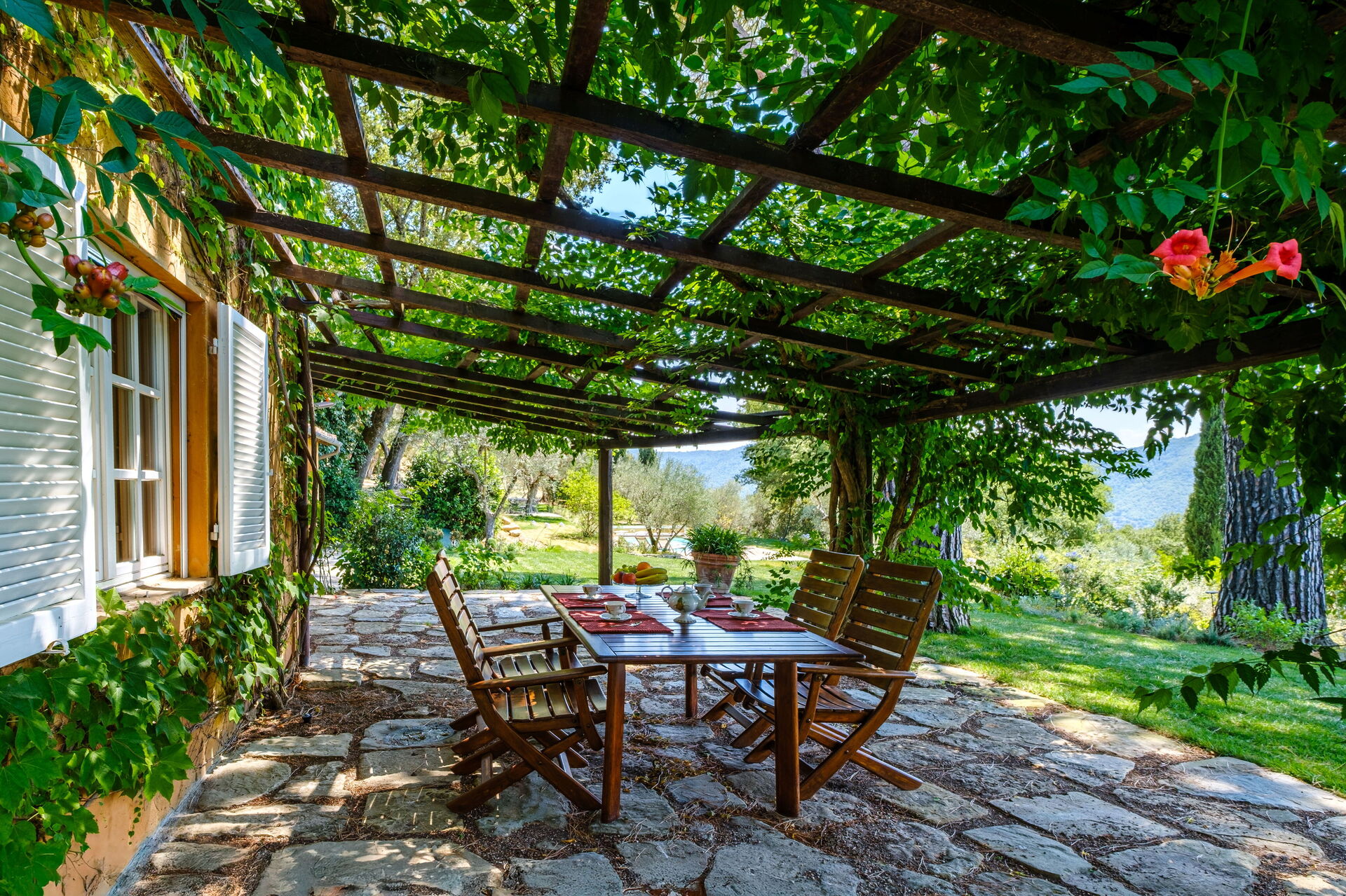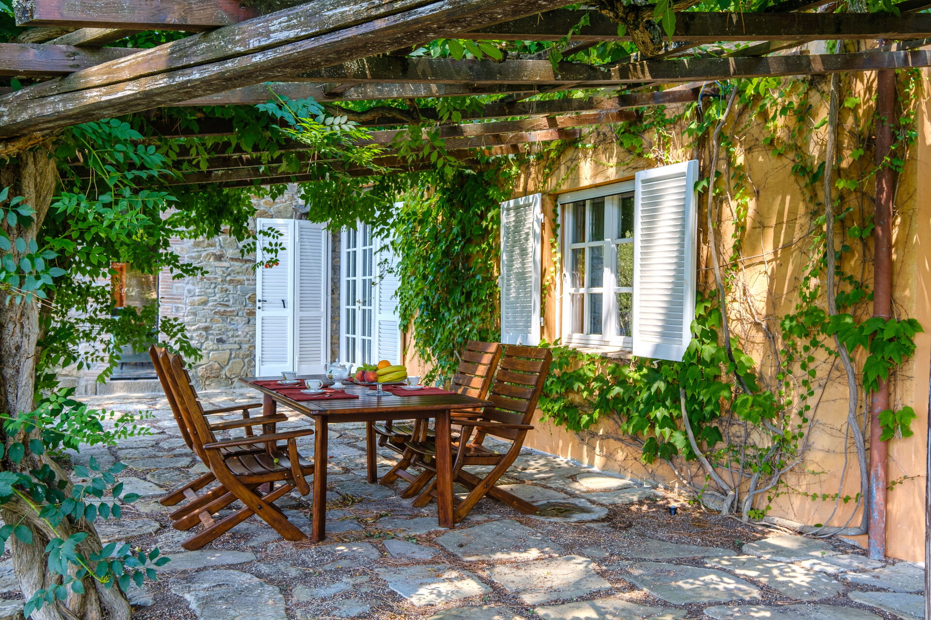 - Veranda mit Holzpergola, ausgestattet für Mahlzeiten im Freien