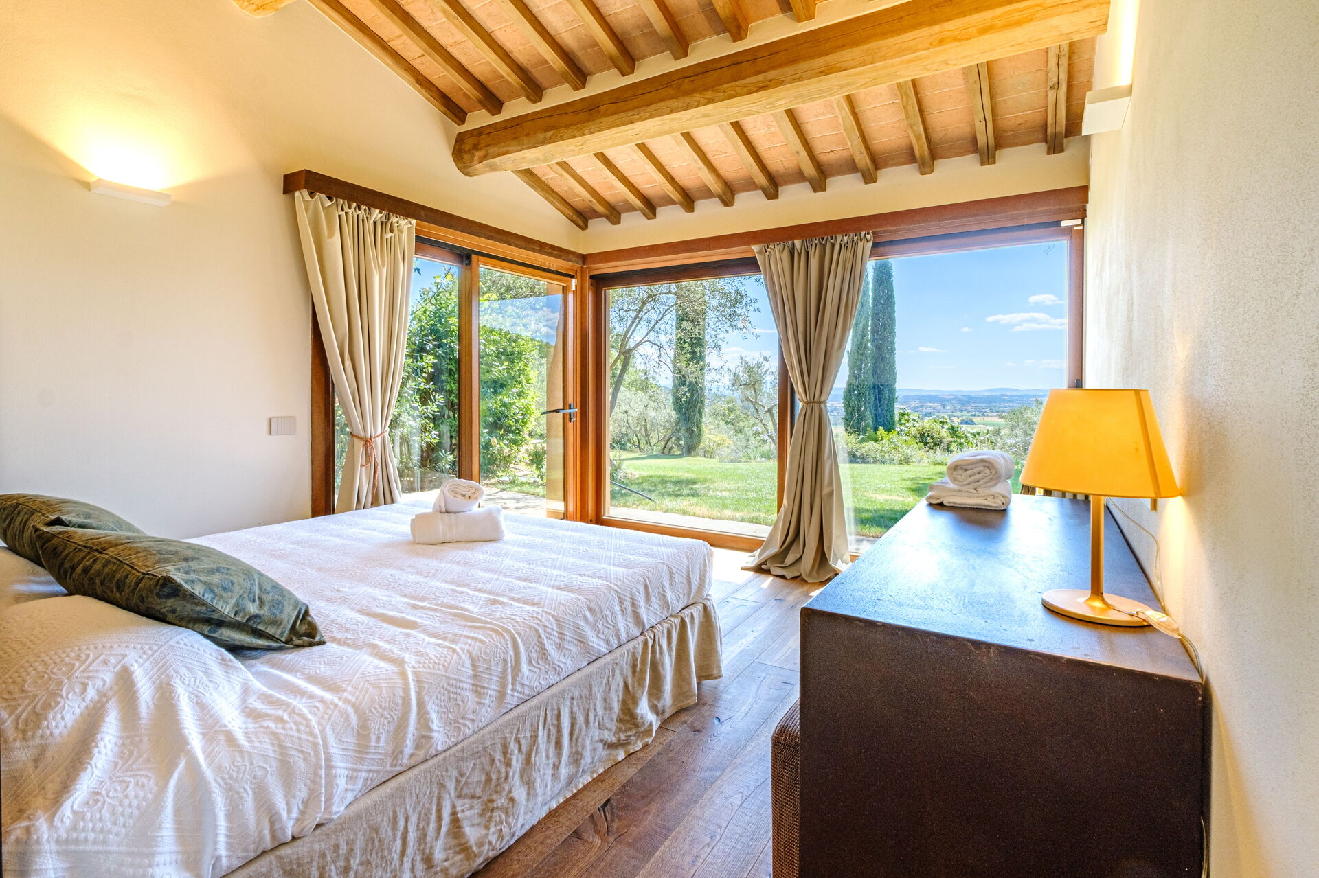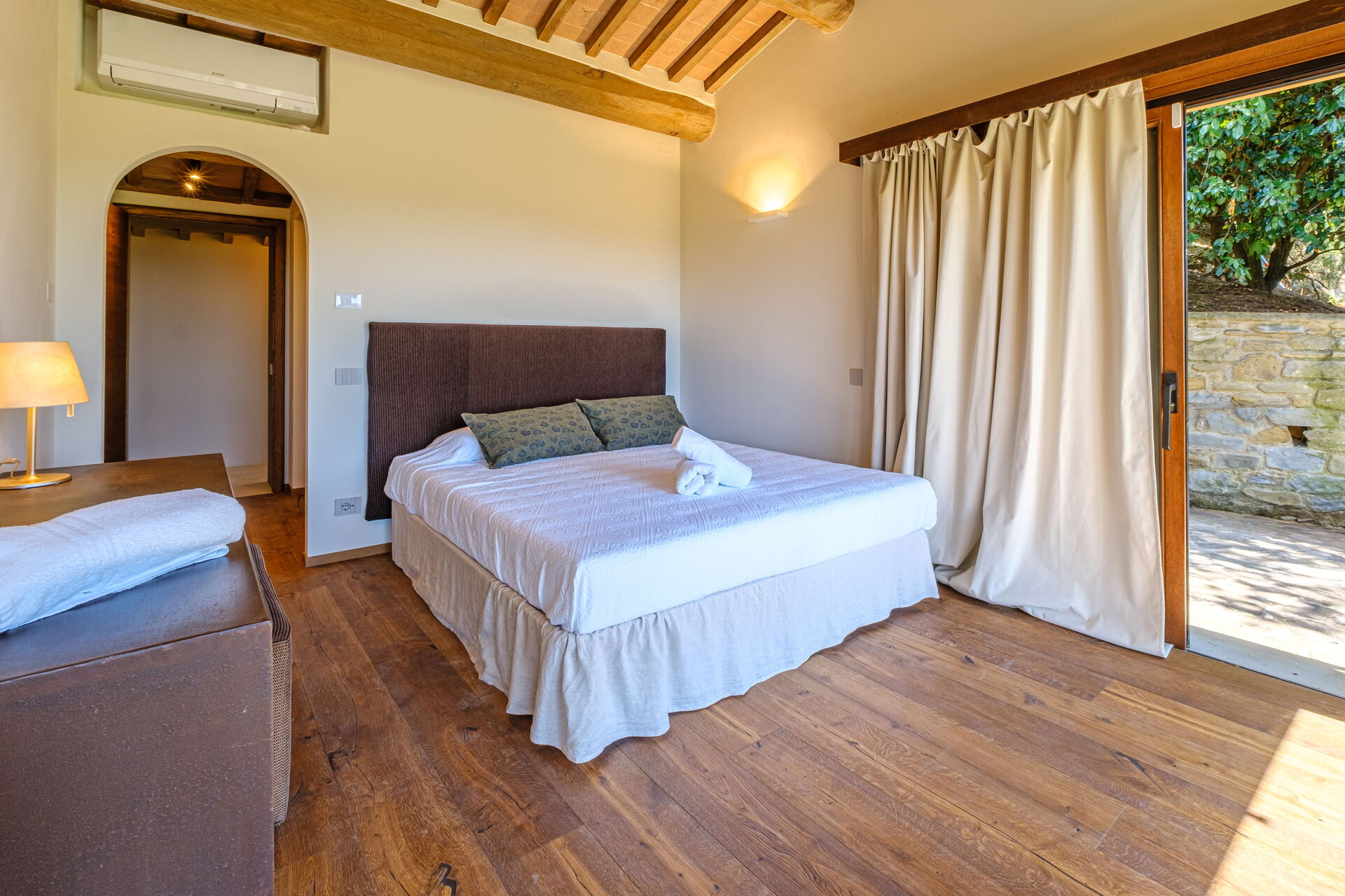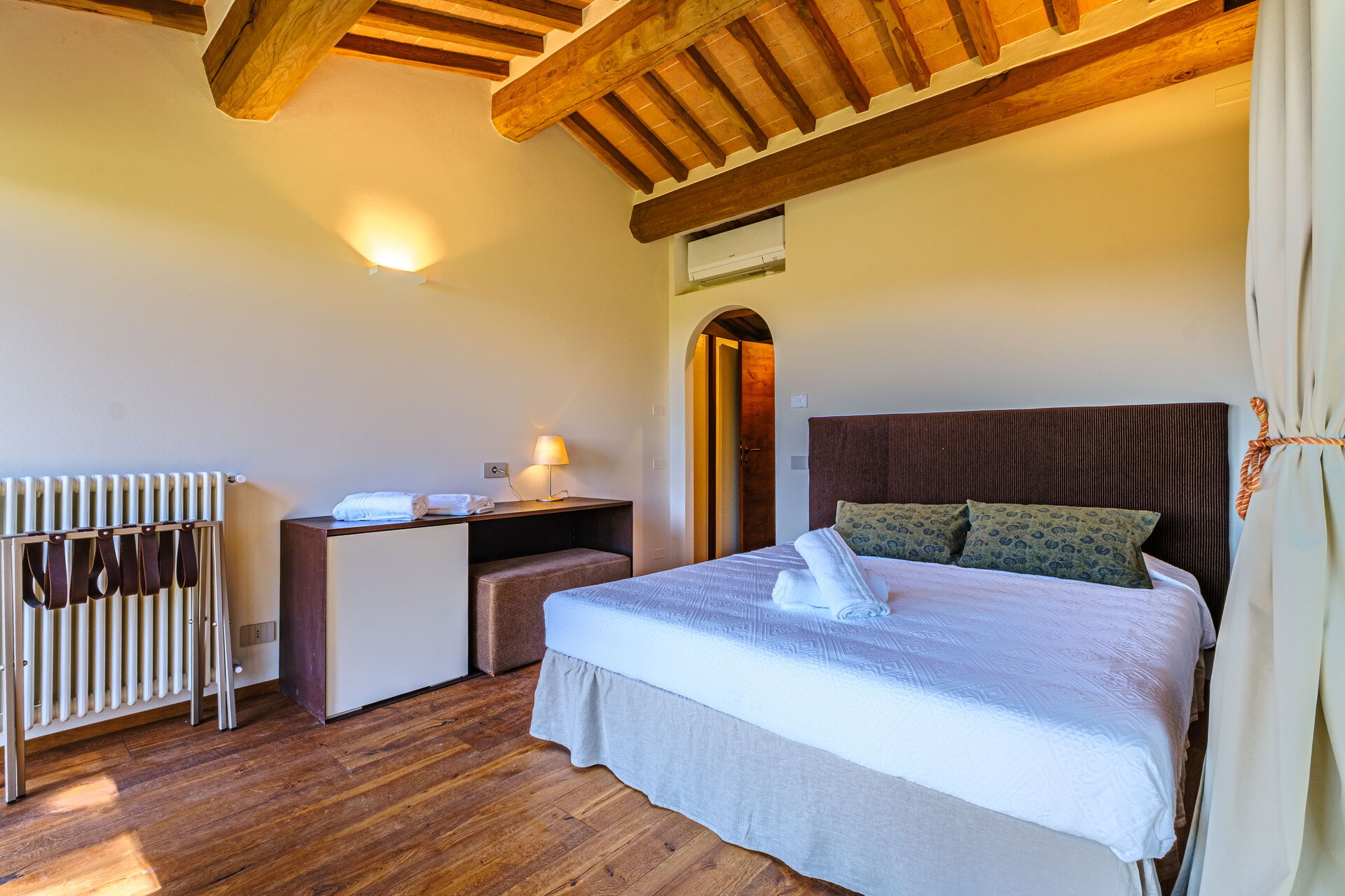 Dieses exklusive Anwesen ist geschmackvoll und elegant eingerichtet; es ist komfortabel und mit modernem Komfort ausgestattet, wobei die ursprünglichen architektonischen Merkmale toskanischer Bauernhäuser (Sichtbalken, Verwendung von Holz und lokalem Stein) respektiert wurden. Die Villa Roseto erstreckt sich über eine einzige Ebene, verfügt über 5 Schlafzimmer und kann bequem 10 Personen beherbergen; gemütliche Gemeinschaftsbereiche ermöglichen Ihnen einen angenehmen und unvergesslichen Aufenthalt in der Nähe von Cortona in Gesellschaft von Freunden und Familie.