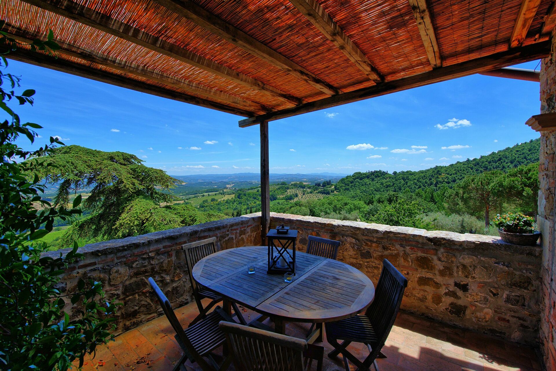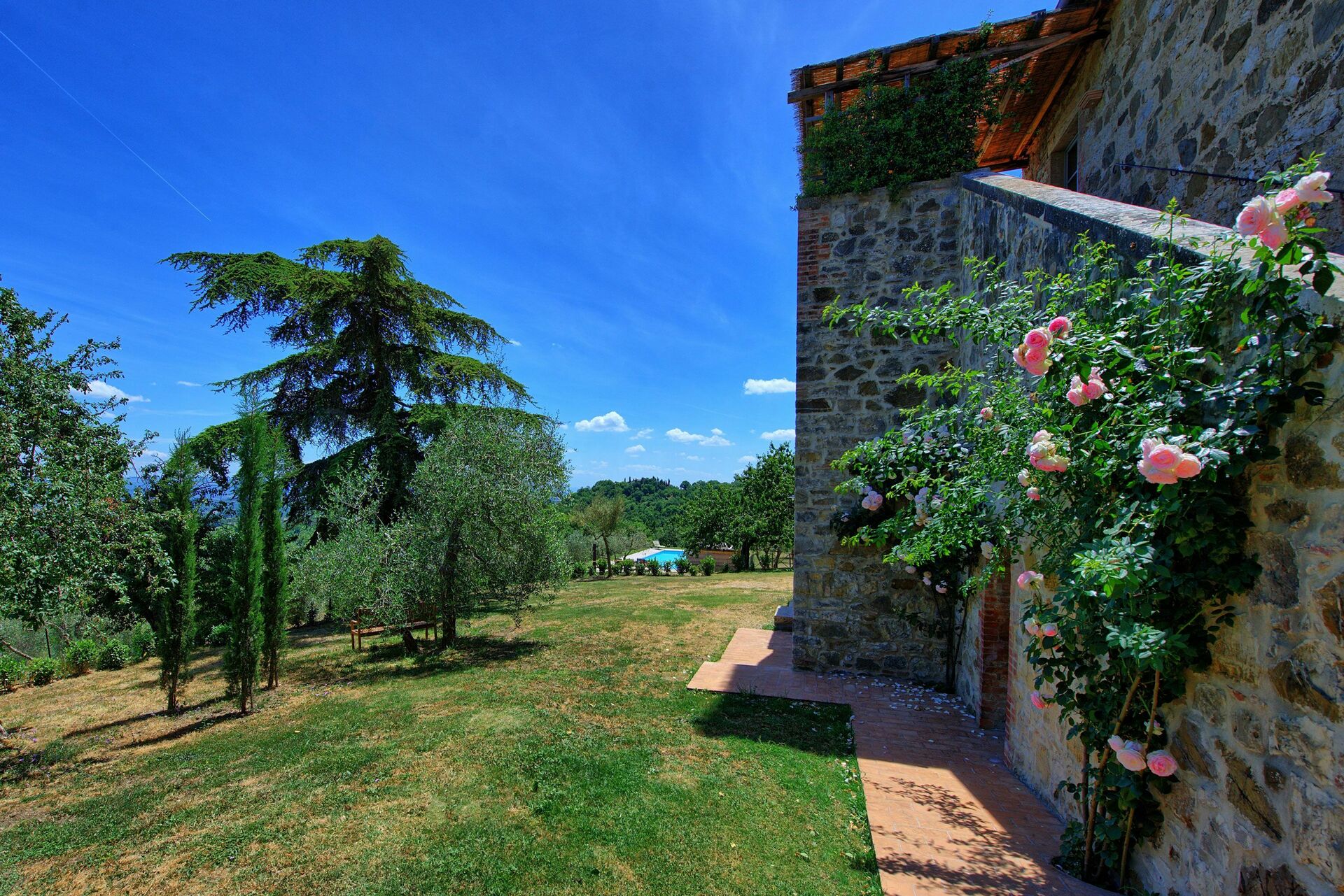 Das Landhaus befindet sich in einem alten Gutshof, dessen eine Hälfte sorgfältig renoviert wurde und mit modernem Komfort ausgestattet ist. Der Besitzer hat dabei darauf geachtet, die typischen architektonischen Merkmale, wie Terracotta-Fußböden und sichtbare Balkendecken, zu erhalten. Die andere Hälfte des Anwesens dient als Abstellraum für Landschaftsgeräte. Umgeben von einem gepflegten Garten, bietet das Landhaus einen Pool in herrlicher Panorama-Lage.