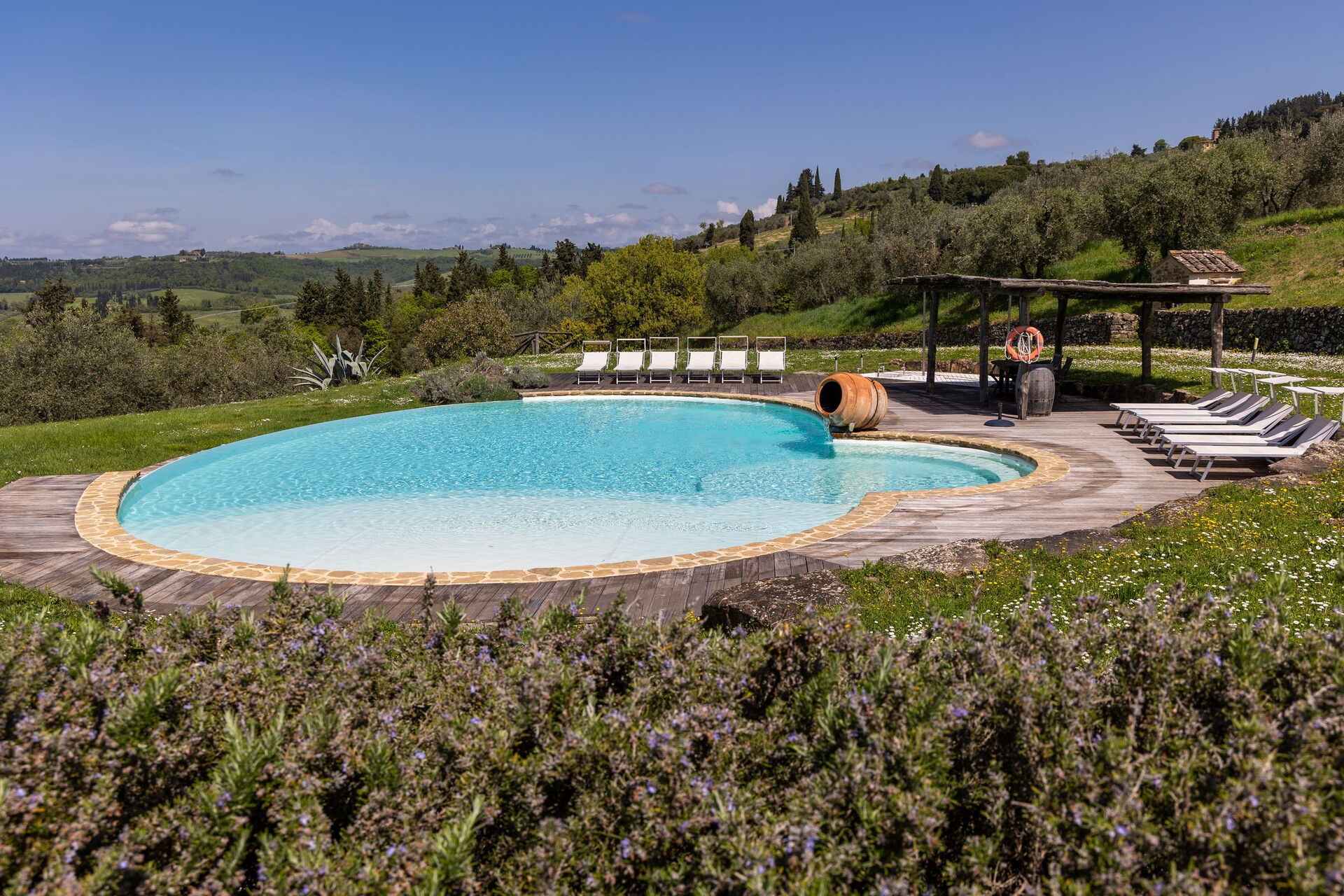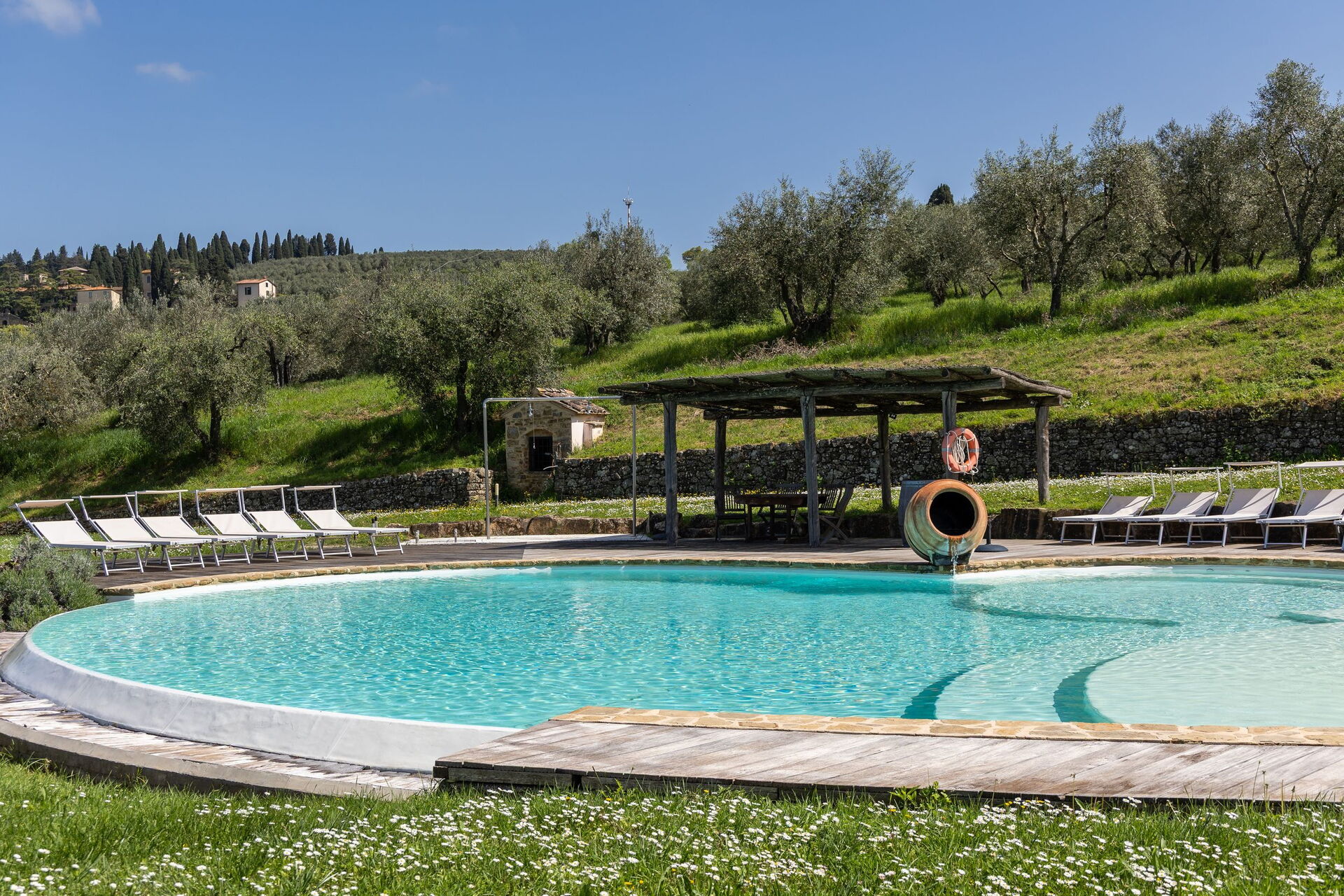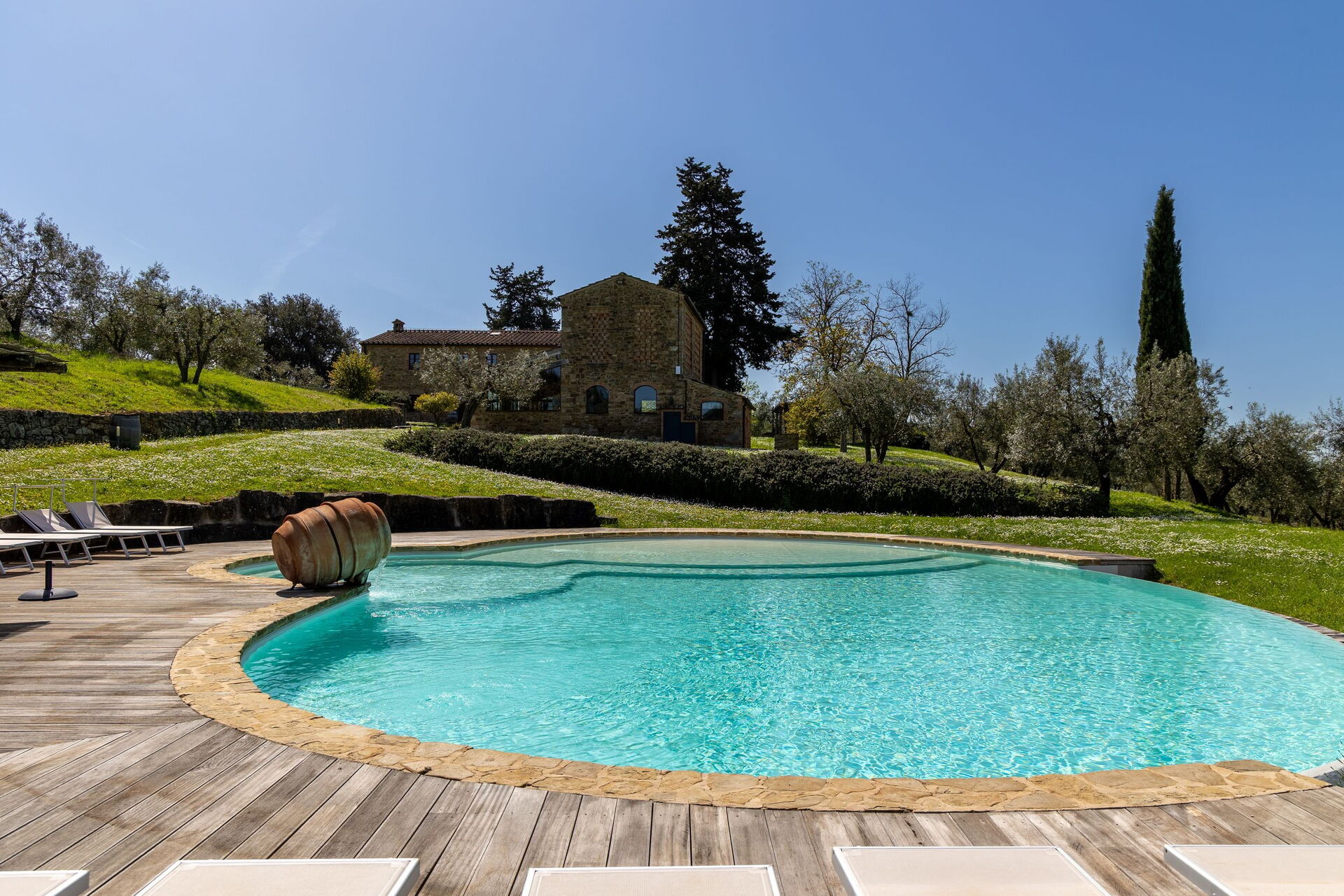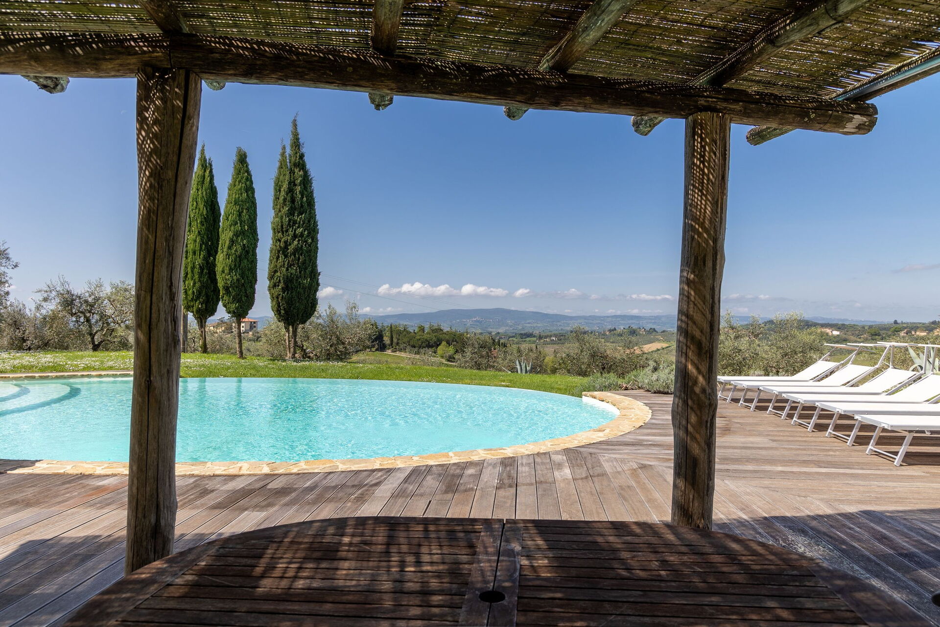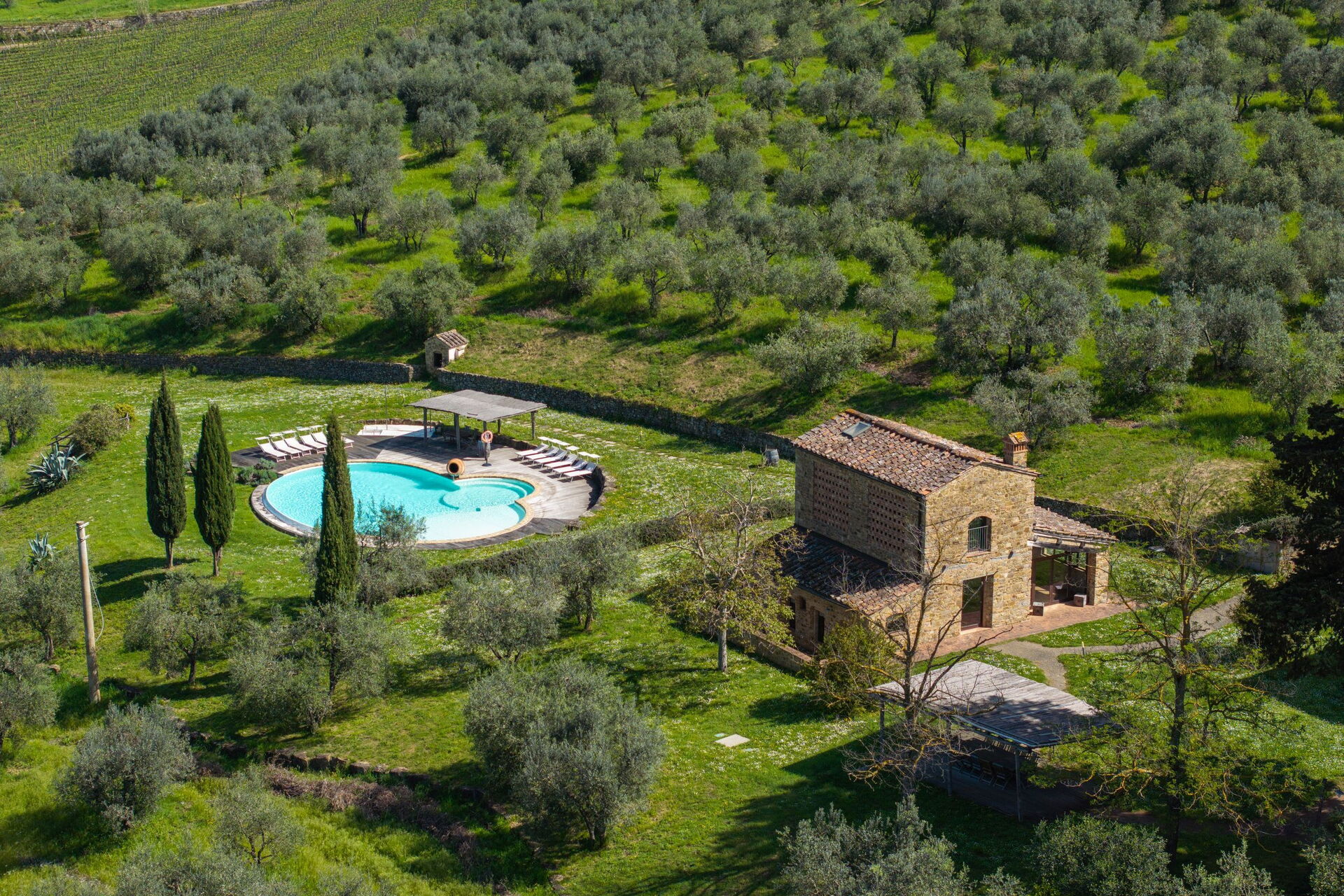 This place is amazing. Family of 12 went and was wonderful. The whole place is brilliant. One villa with 5 rooms and a separate 2 bedroom villa. Views are breathless. Location is good and easy access to pretty much everywhere. We went to Florence, Siena and numerous medieval villages all easily within an hours drive. We will be back. We went last week of May and unfortunately weather wasn’t great and rained but didn’t put us off site seeing. The place is so good that if it were sunny all the time we wouldn’t have wanted to leave the amazing swimming pool. The owners have a real gem here and the wine they make on the vineyard is very good.