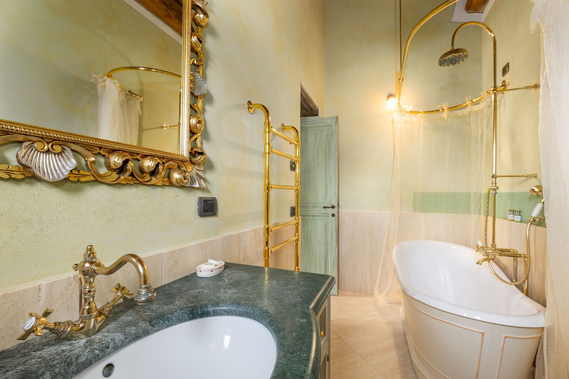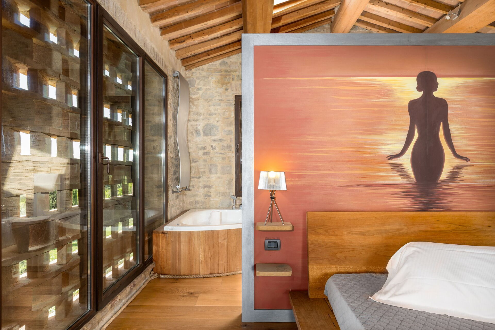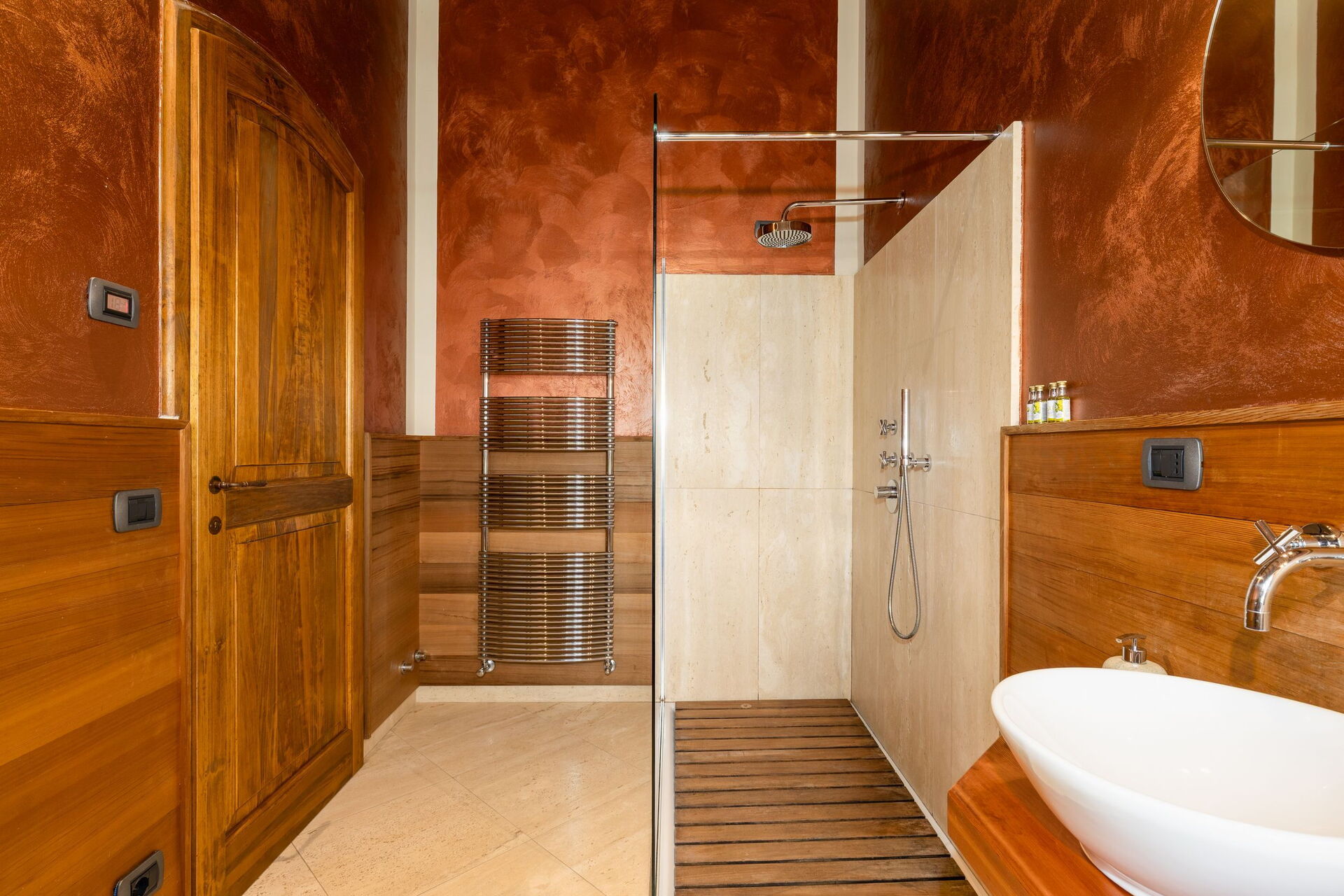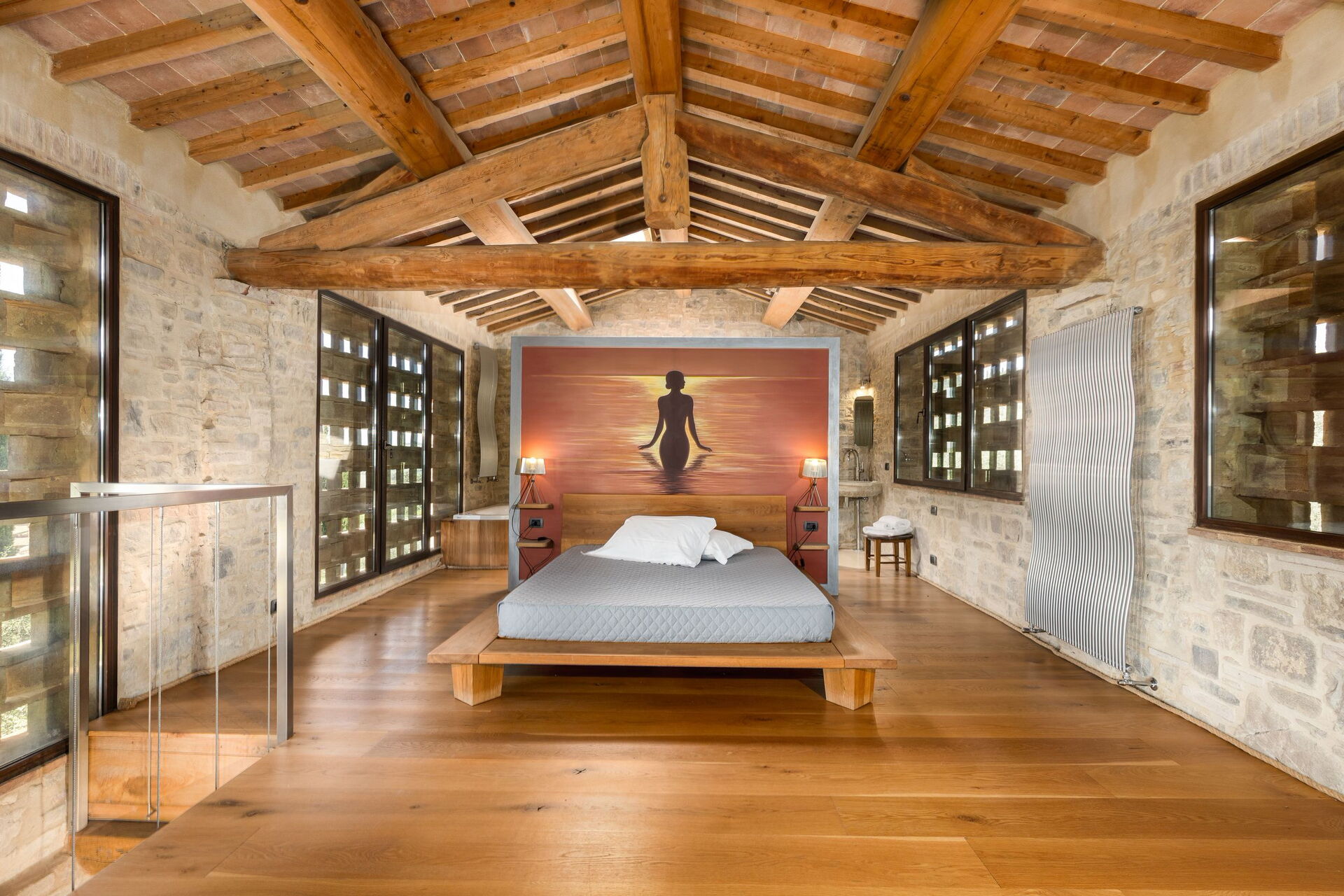 Erster Stock: Großes Doppelzimmer mit offenem Bad mit Massage- Dusche.