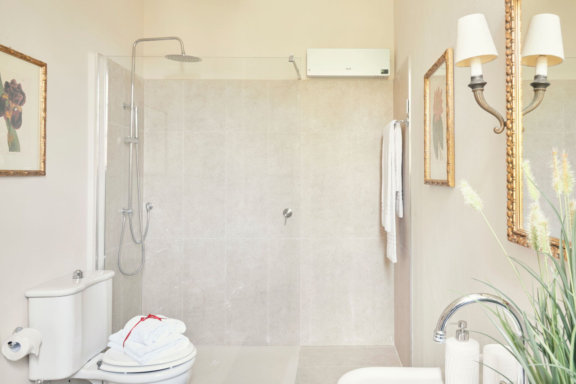 Wohnzimmer, 1 Schlafzimmer (Klimaanlage) mit 3 Einzelbetten und mit eigenem Bad mit Badewanne, 1 Doppelzimmer (Klimaanlage) mit eigenem Bad mit Dusche, 1 Doppelzimmer (Klimaanlage) mit eigenem Bad mit Dusche, 1 Doppelzimmer ( Klimaanlage) Klimaanlage) mit eigenem Bad mit Dusche.