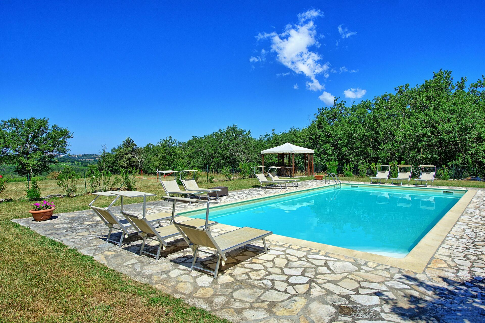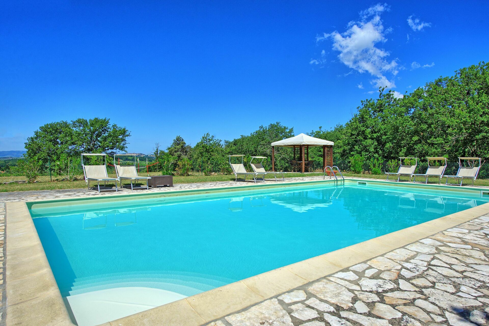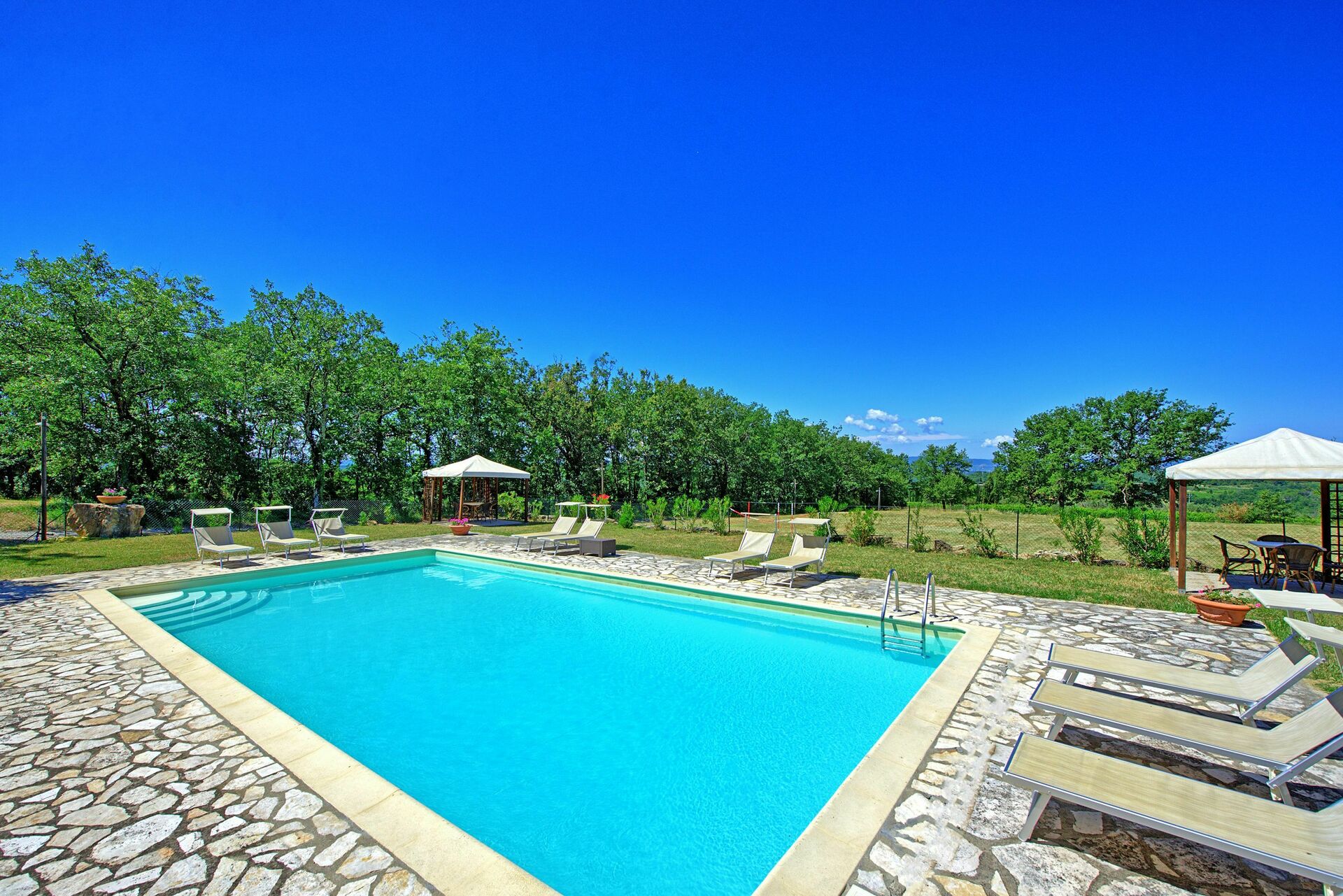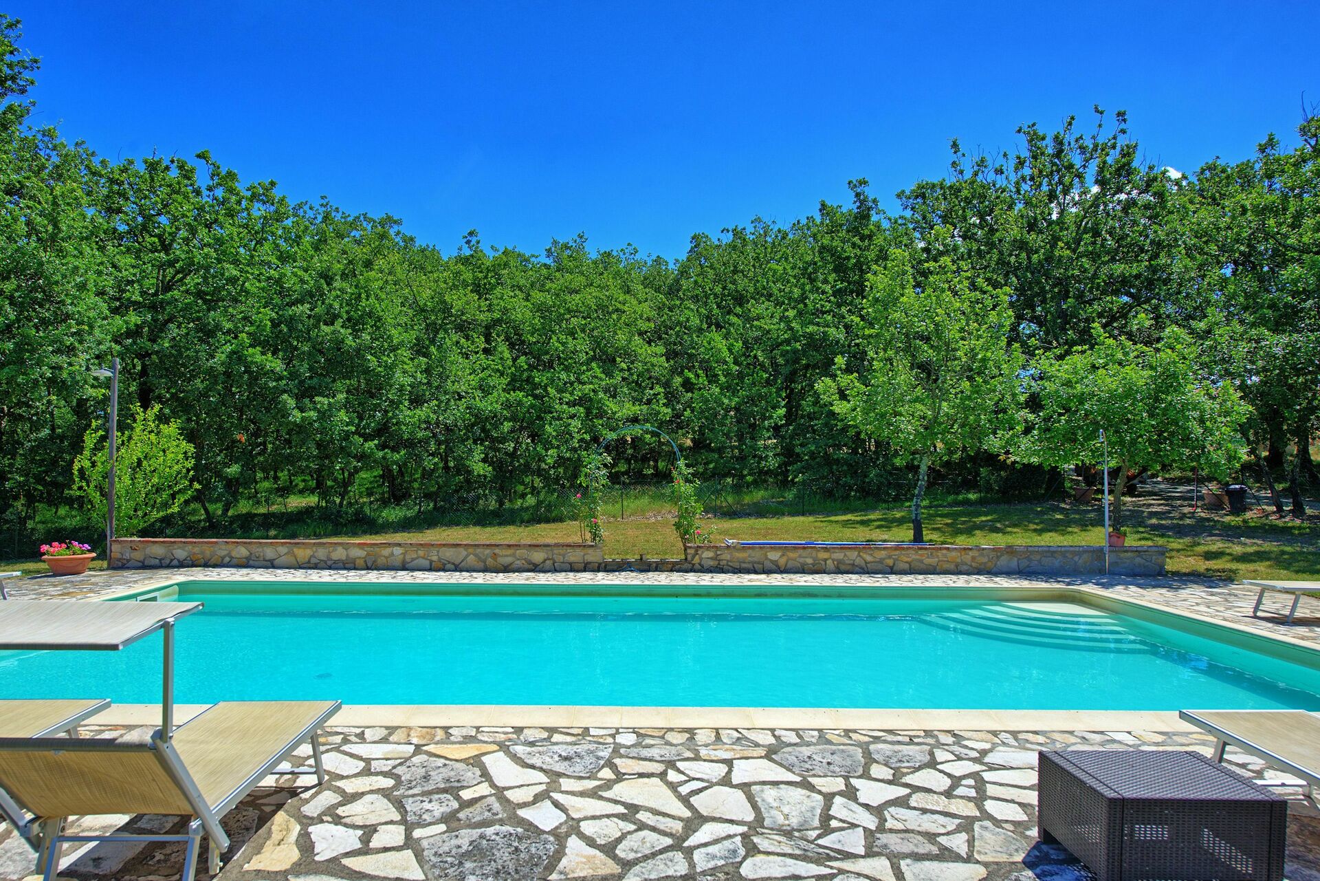 - Schwimmbad (12 X 6 m- Mindesttiefe 1,2 m – Höchsttiefe 1,4 m – geöffnet vom 01/06 bis 30/09) zur gemeinsamen Benutzung mit Liegestühlen, Lauben, Sonnenschirmen, Tischen und Stühlen