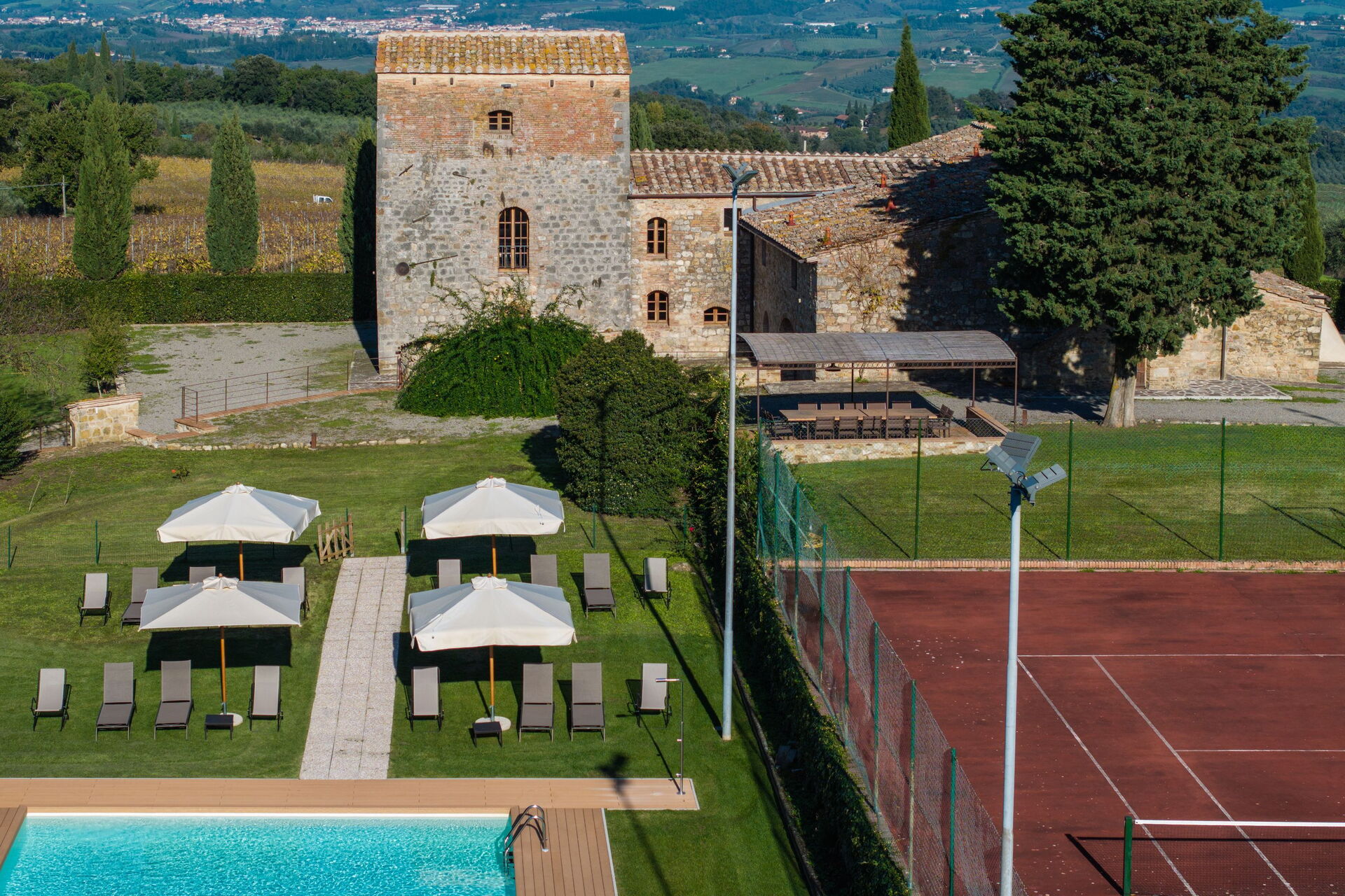 Villa Simone ist von Weinbergen und Olivenhainen umgeben und genießt von einen herrlichen Blick auf die umliegende Landschaft. Draußen können die Gäste einen großen, gepflegten Garten und einen schönen privaten Swimmingpool mit Liegestühlen und Sonnenschirmen genießen: der ideale Ort zum Entspannen und Abkühlen an heißen Sommertagen in Gesellschaft von Freunden und Familie. In einem mit Tisch und Stühlen ausgestatteten Bereich können Sie draußen essen und dabei den bezaubernden Panoramablick über die Chianti-Hügel genießen. Den Gästen steht auch ein Tennisplatz zur Verfügung.