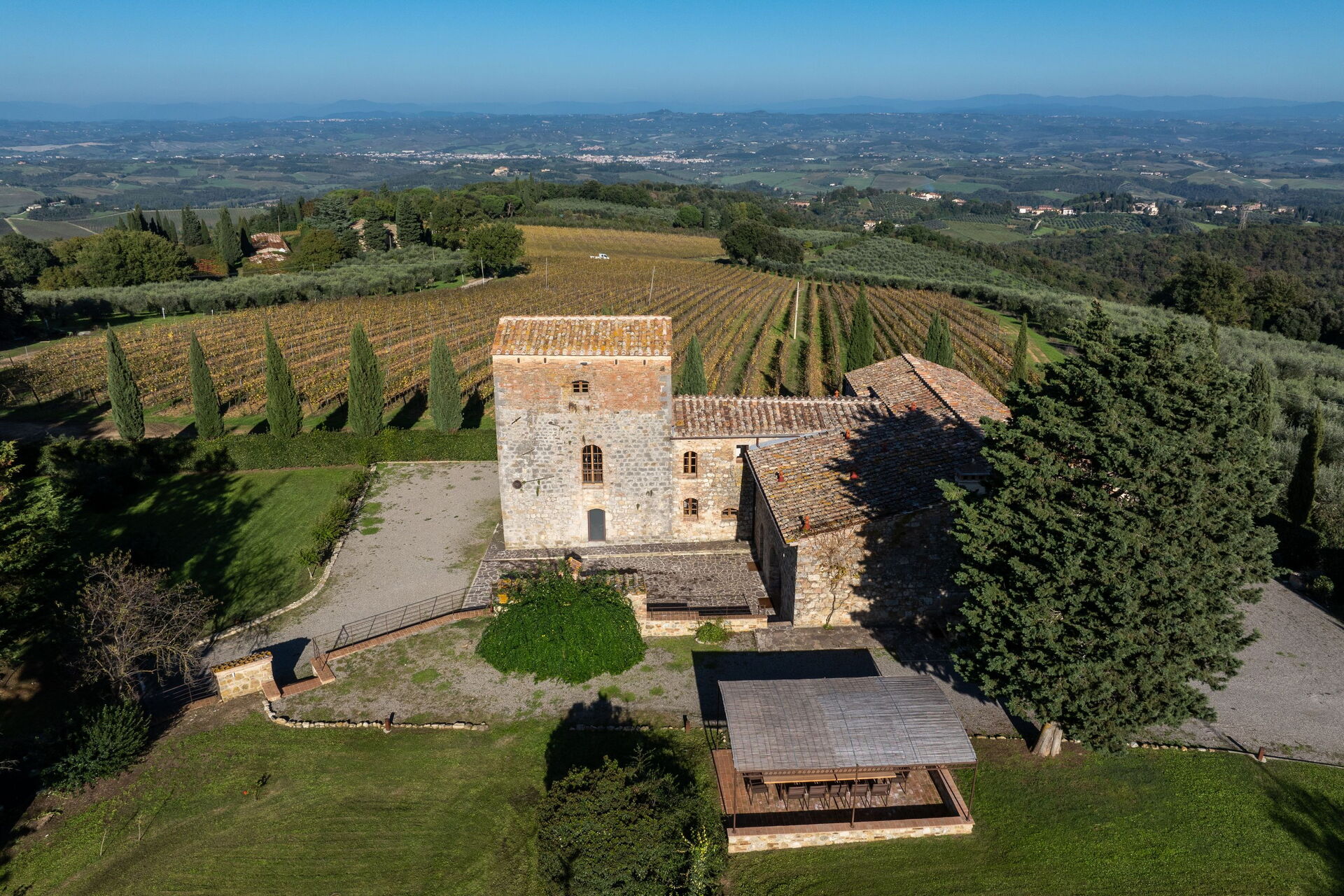 Entfernungen: San Gimignano mit Geschäften aller Art 5 km, Certaldo 15 km, Volterra 25 km, Siena 40 km, Florenz ca. 50 km, Pisa (Flughafen) 75 km.