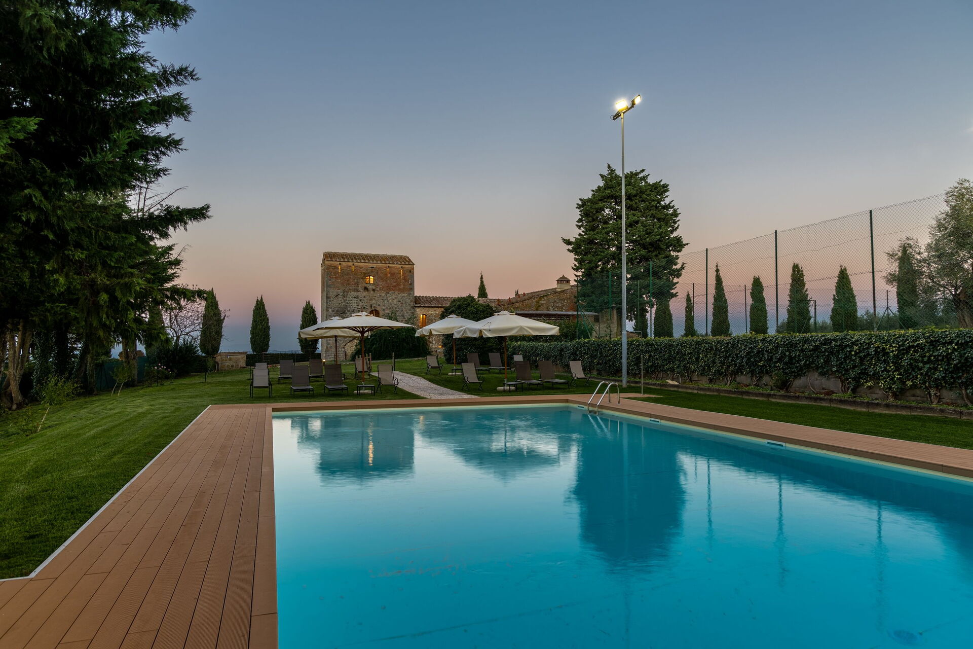 tennis court and swimming pool, both floodlit. Super bedrooms and modern
