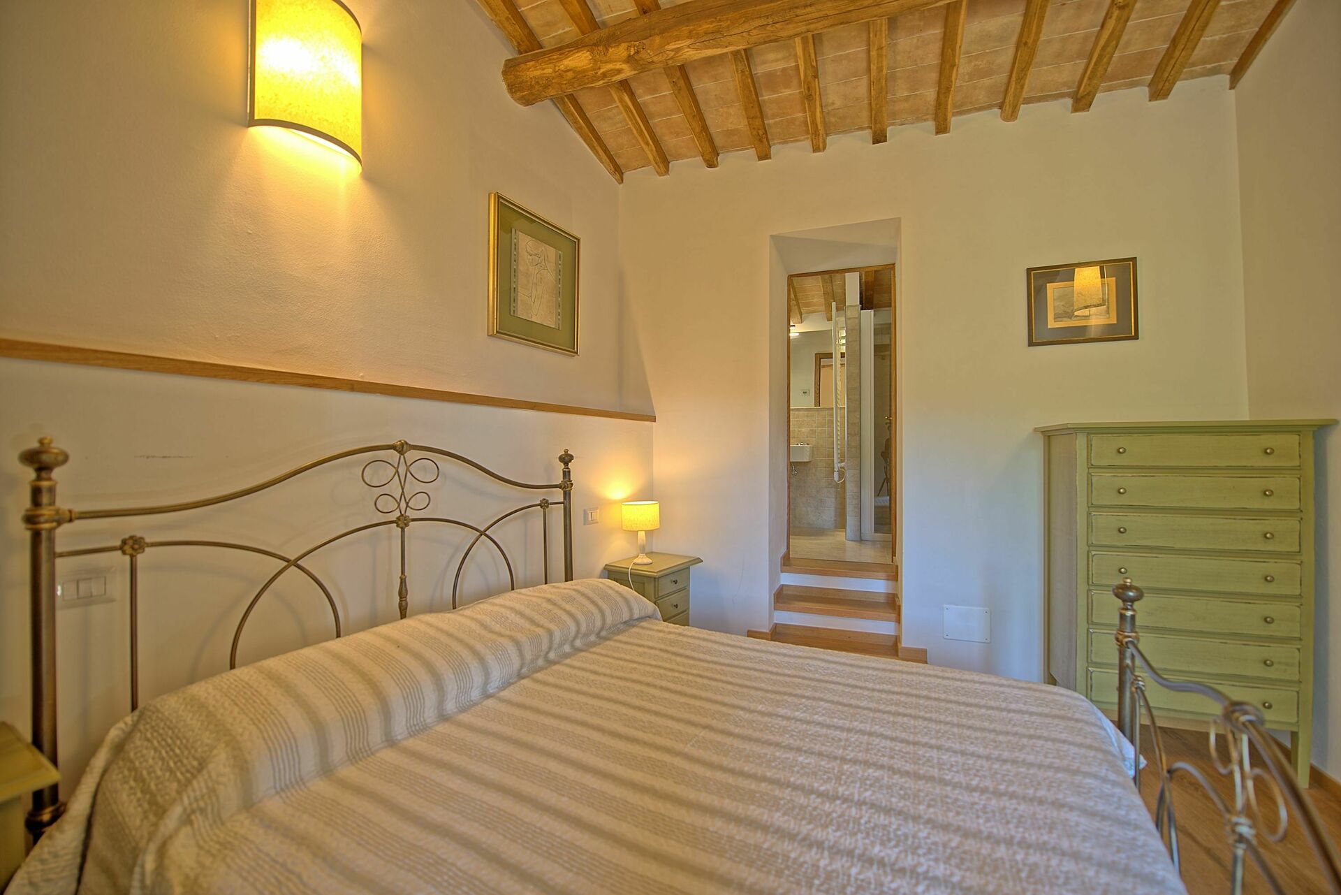 Erdgeschoss: Doppelzimmer mit Ehebett (Klimaanlage) und privatem Bad mit Dusche.