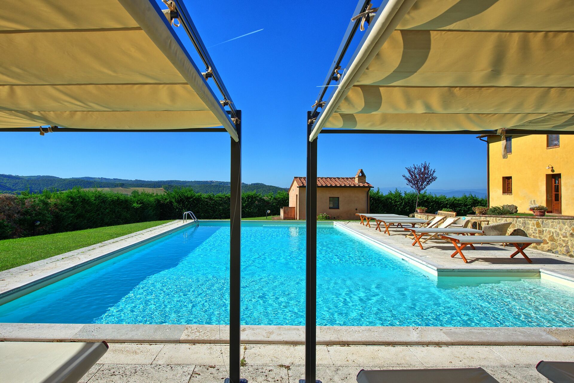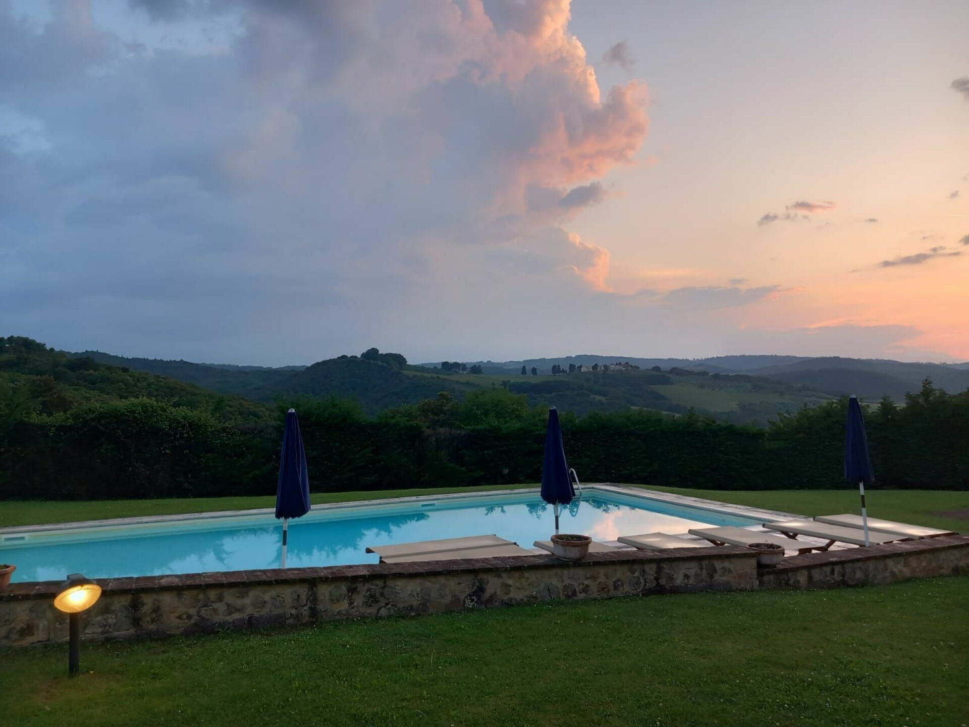 Im Aussenbereich finden die Gäste einen wunderschönen Panoramagarten vor, in dem sich das große private Schwimmbad befindet, ausgestattet mit Sonnenliegen und Sonnenschirmen: Der ideale Ort zum Entspannen und Erfrischen an Sommertagen. Ein Grillplatz und eine überdachte Pergola ermöglicht es den Gästen, Grillabende zu organisieren und draussen zu essen. Die Lage ist absolut ruhig und garantiert ein Maximum an Privatsphäre auf dem weitläufigen Landgut auf den Hügeln vor San Gimignano, umgeben von Olivenbäumen und Weinbergen.