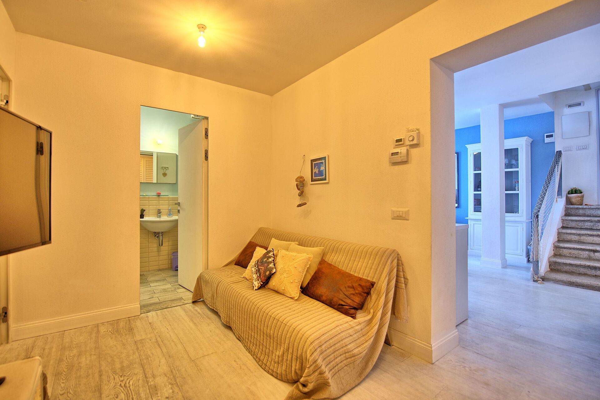 Casa Riva befindet sich in einem alten, stattlichen Gebäude, das in vier Wohnungen aufgeteilt ist und im Erdgeschoss liegt (erreichbar über sechs Stufen). Dadurch bleibt die Wohnung auch an heißen Tagen angenehm kühl. Im Wohnzimmer befindet sich eine Fenstertür mit Zugang zu einer kleinen Terrasse, die auf die Rückseite des Hauses blickt, wo sich auch der Parkplatz befindet. Die Zimmer verfügen über hohe Fenster.