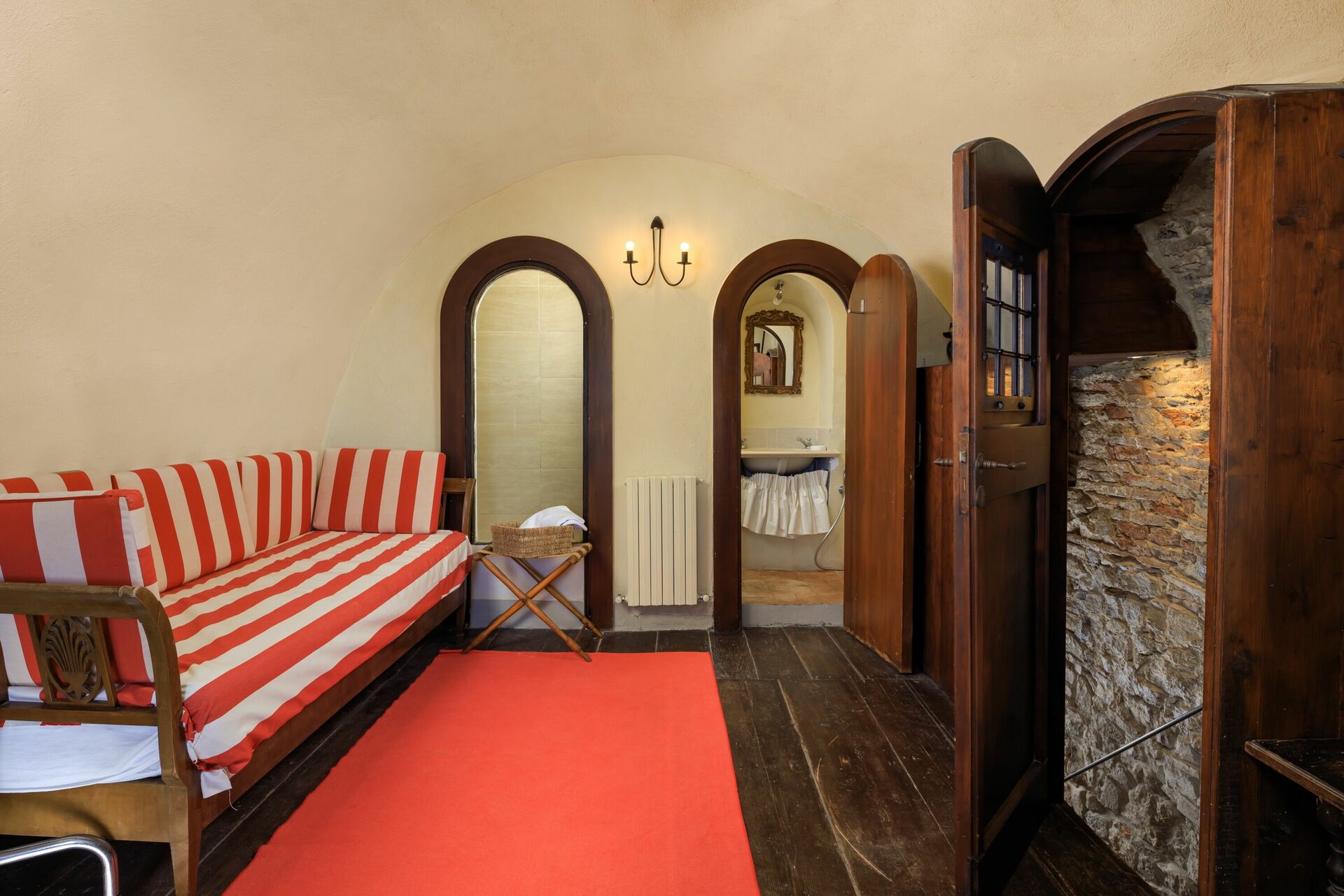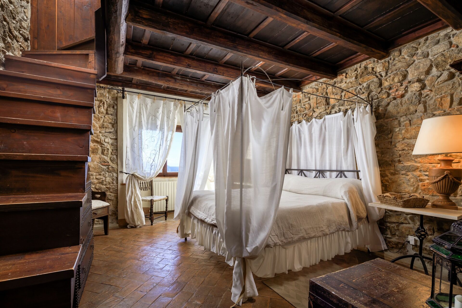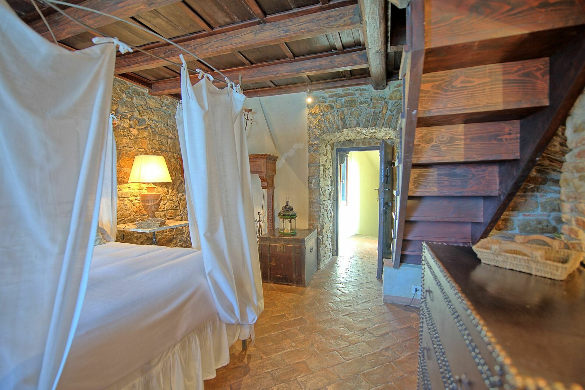 1.Stock: Doppelzimmer mit Ehebett und Kamin mit Zugang zu einem kleinen Bad mit Dusche (über eine Holztreppe), Garderobe und Zugang zu einer kleinen Terrasse.
