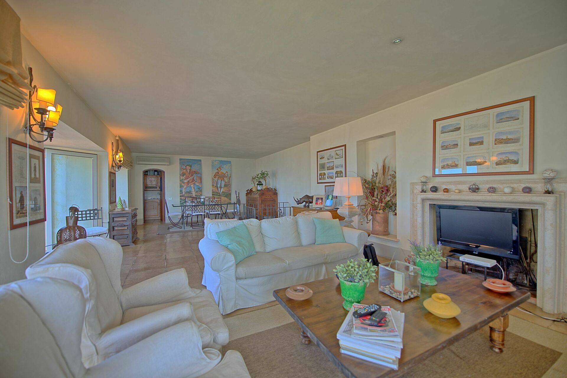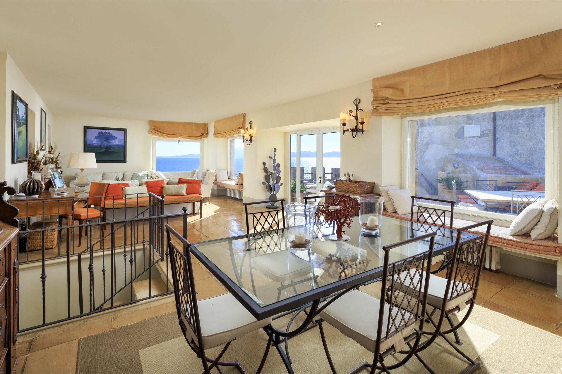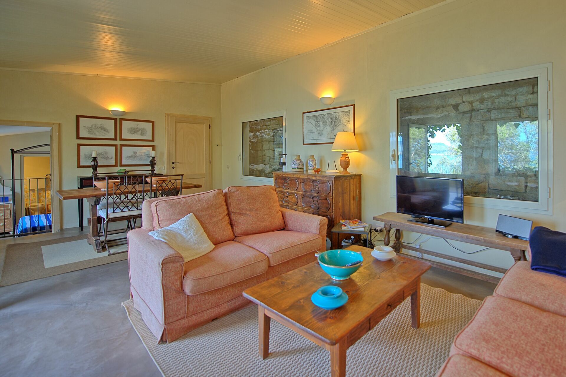 1.Stock: großes und lichtdurchflutetes Wohnzimmer mit Kamin und Klimaanlage ausgestattet, Esszimmer mit wundeschönem Blick auf die Küste und Zugang zu einer schönen, ausgestatteten Terrasse.