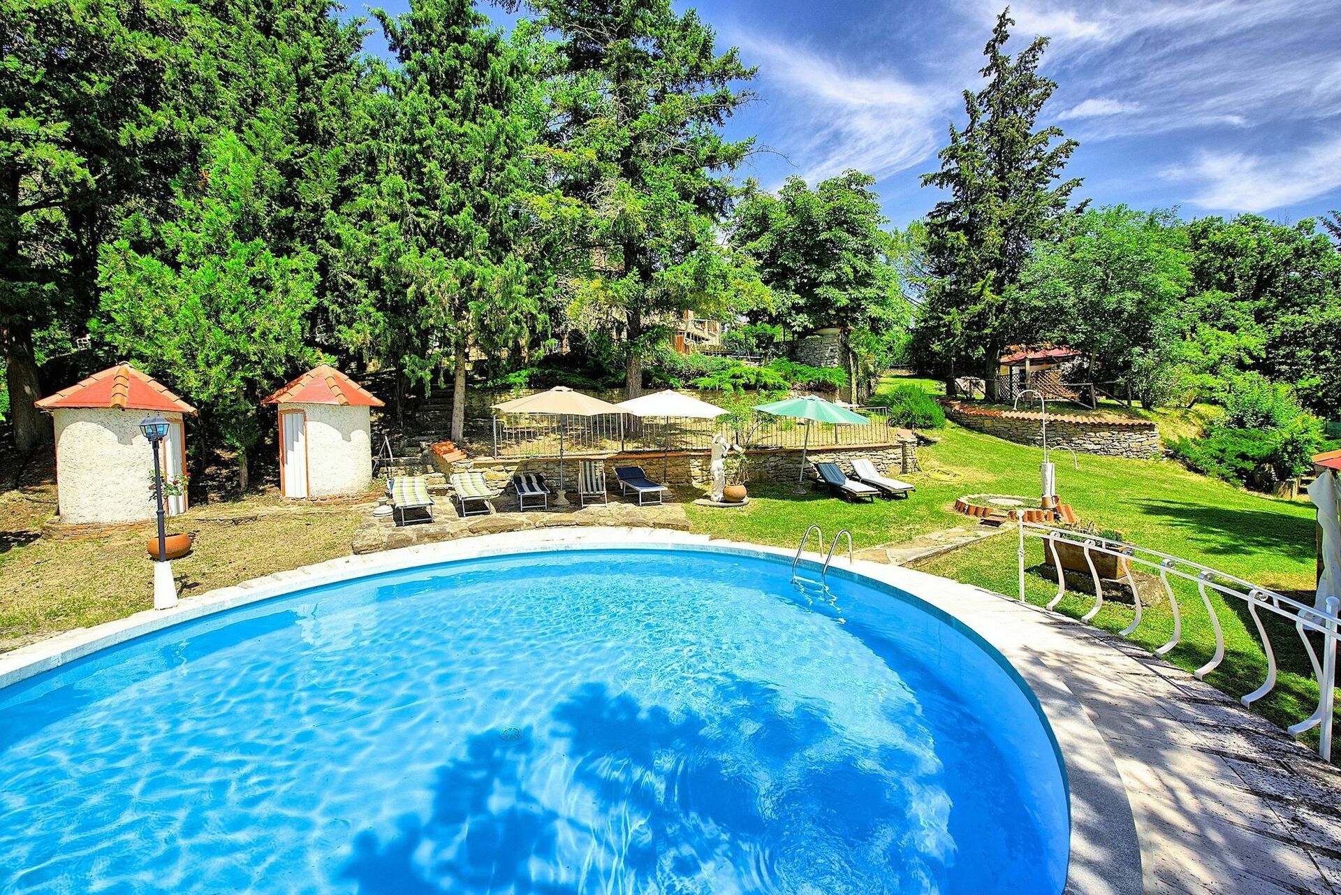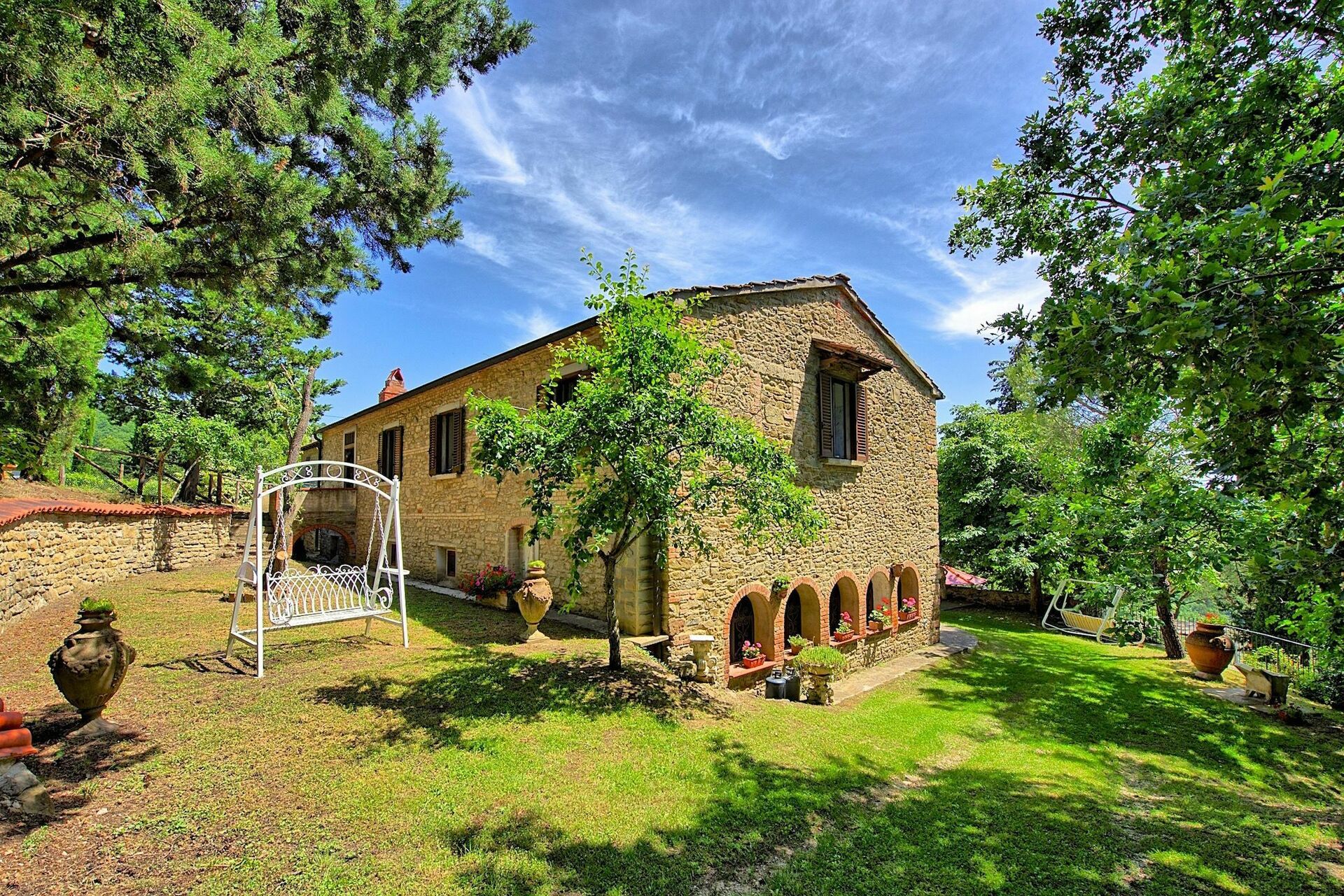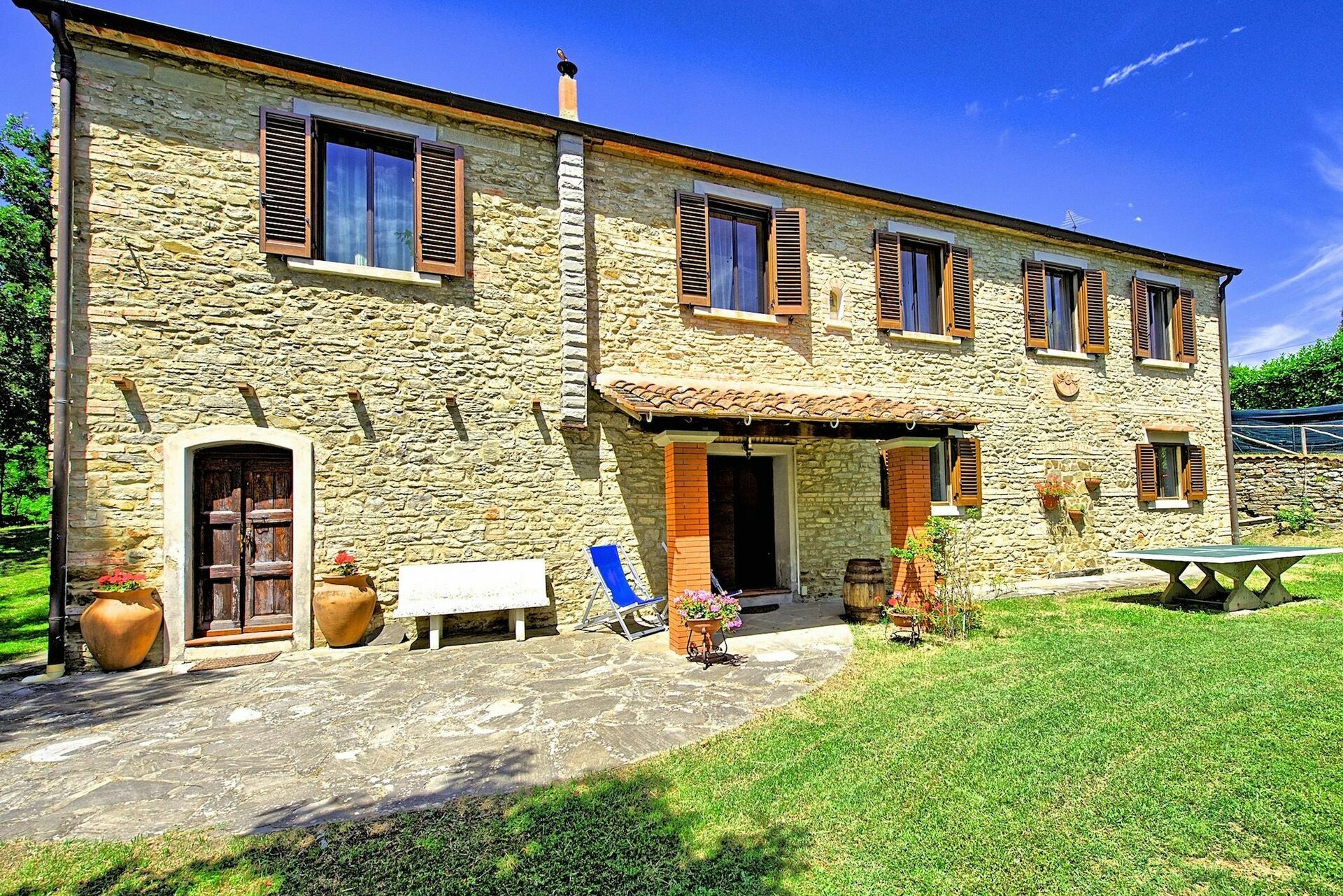 Freistehendes Haus mit privatem Schwimmbad und Aussen- Whirlpool auf den Hügeln vor Arezzo, eine schöne toskanische Stadt, ca. 10 km vom Haus entfernt. Der Besitz befindet sich mitten auf dem Land und ist umgeben von Wäldern und Olivenhainen; man geniesst einen ein wunderschöner Blick auf das unten liegende Tal und auf den Ort Arezzo. Die Inneneinrichtung ist komfortabel, in rustikaler toskanischer Art gehalten. Eine Gruppe von 9 Personen findet in dieser Unterkunft Platz in der man einen sehr angenehmen Urlaub verbringen wird. Die günstige geografische Position des Hauses erlaubt es die Sehenswürdigkeiten Umbriens und der Toskana besuchen zu können. Vom Bahnhof in Arezzo kann man täglich schnell und bequem mit dem Zug nach Florenz,Orvieto und Rom gelangen.