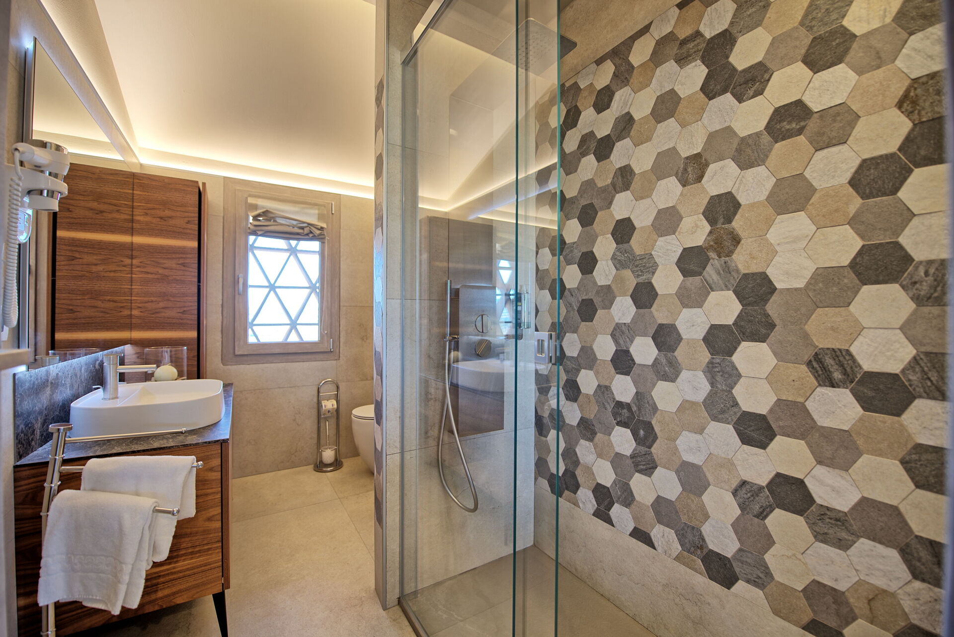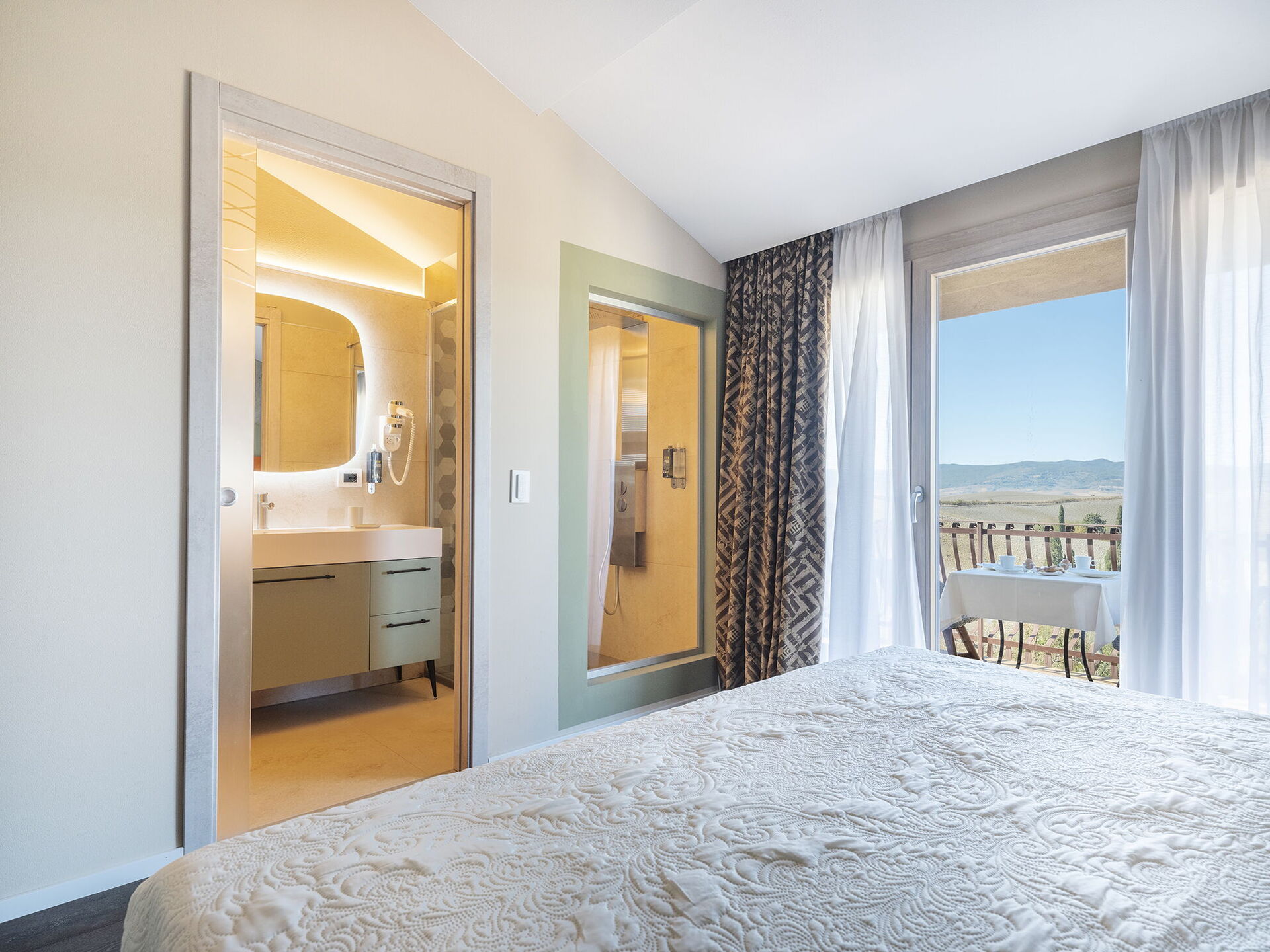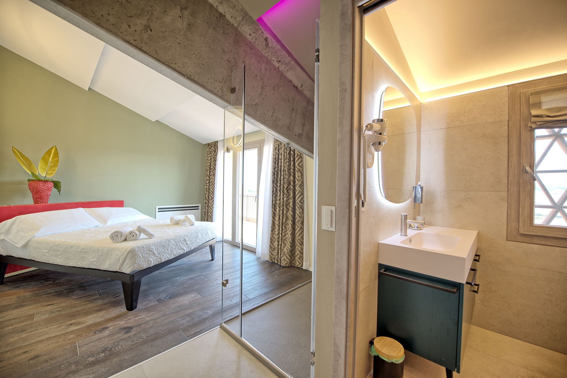 1 Doppelzimmer mit Badewanne im Zimmer und eigenem Bad mit Dusche, Zugang zur privaten Terrasse