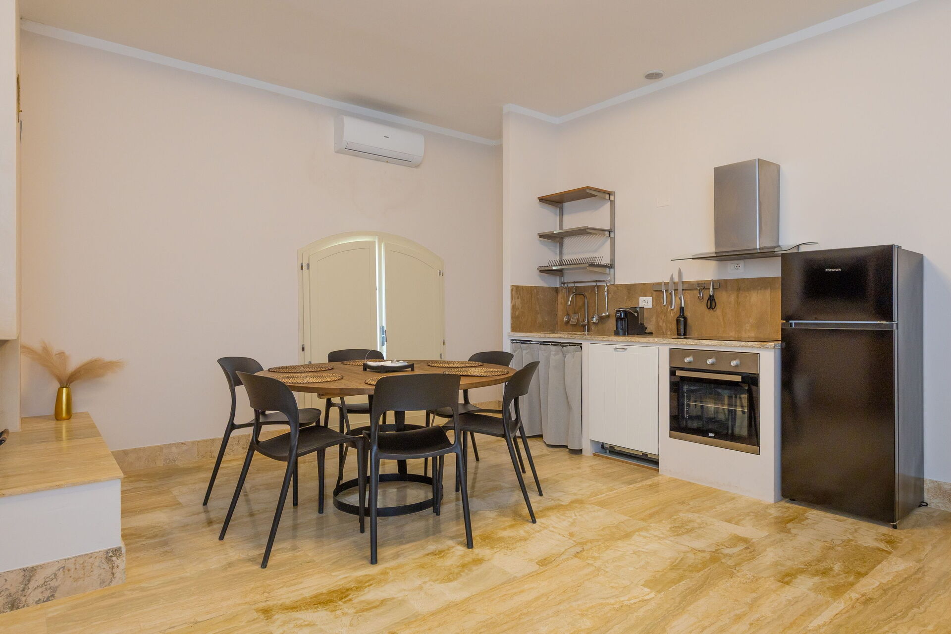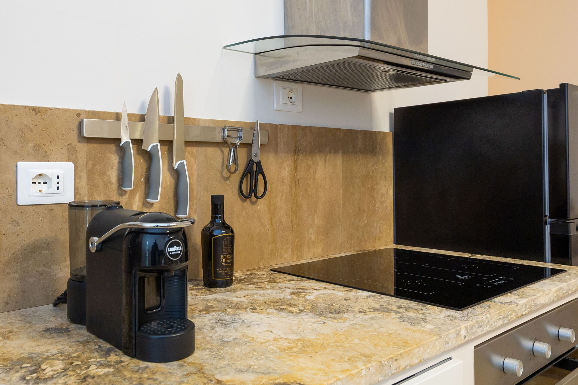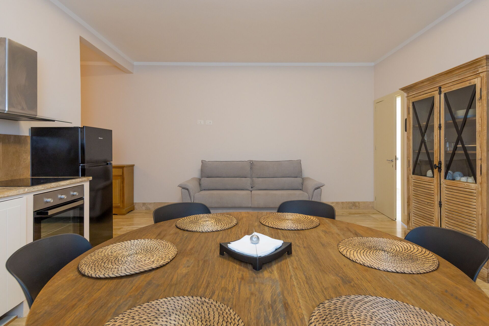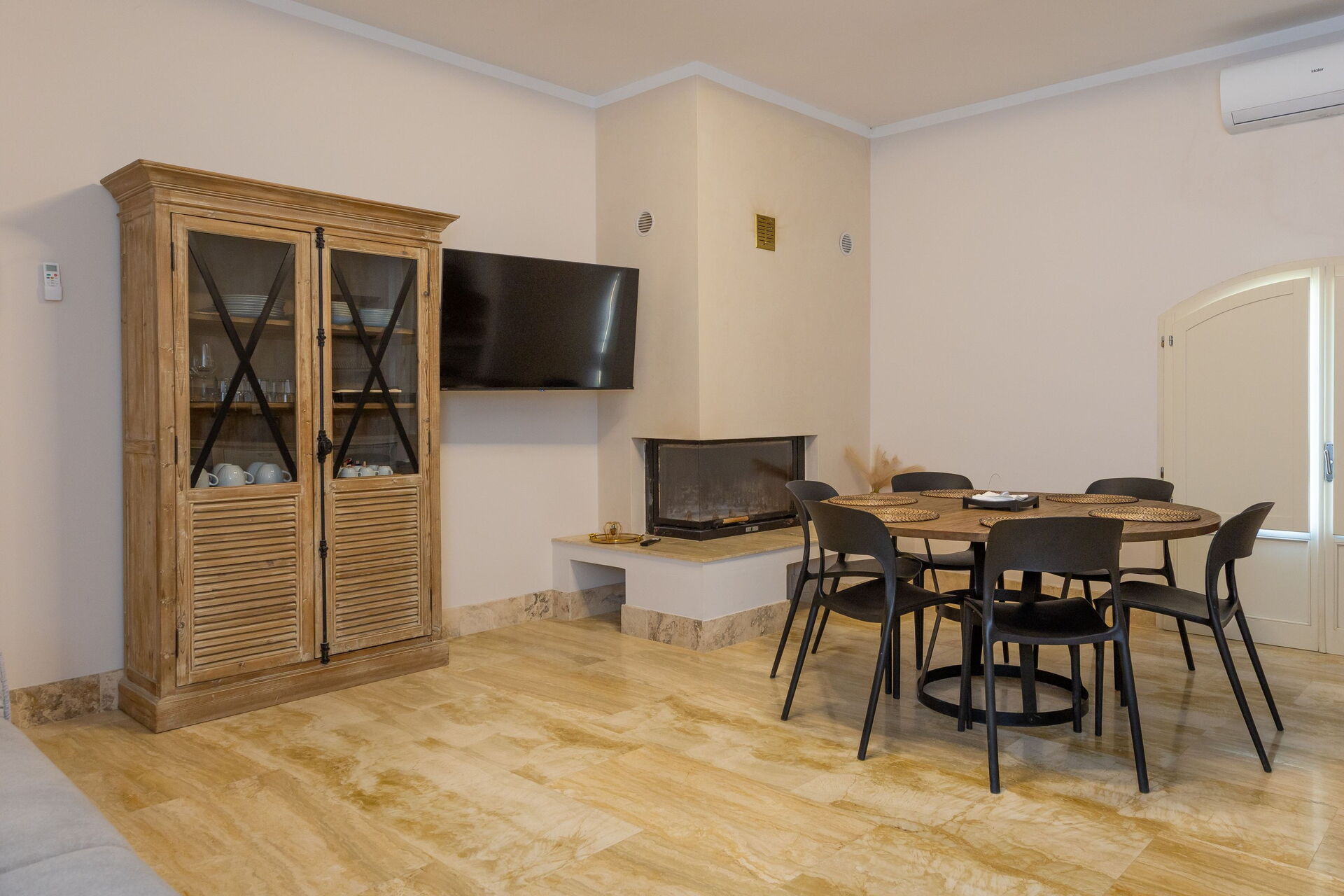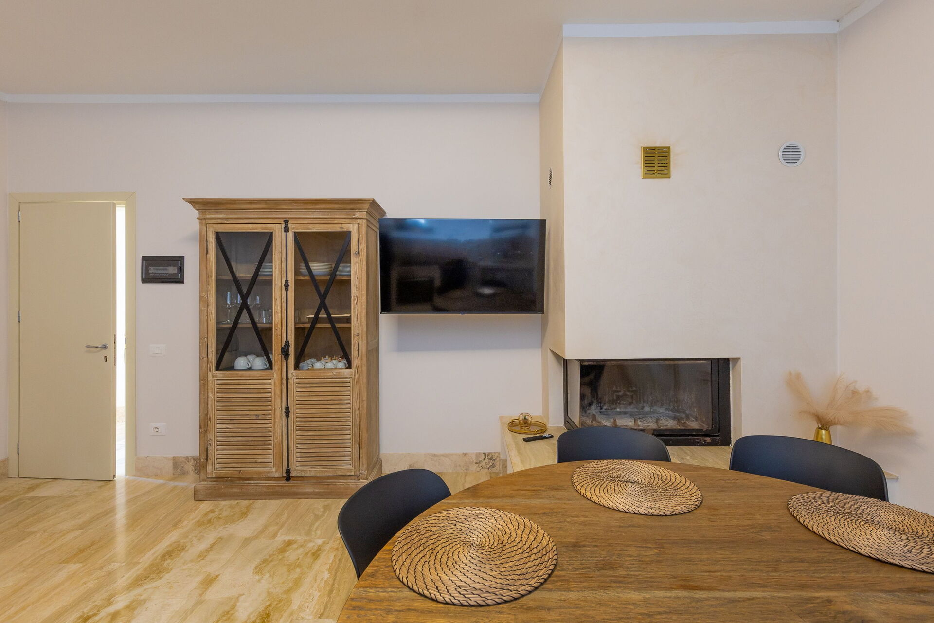 Erster Stock: Wohnzimmer (Smart-TV und Klimaanlage) mit Doppelschlafcouch, Essbereich und Küchenzeile (Geschirrspüler, Backofen, Kühlschrank, Espressomaschine, Toaster), 2 Doppelzimmer (jedes mit Klimaanlage), Bad mit Dusche.