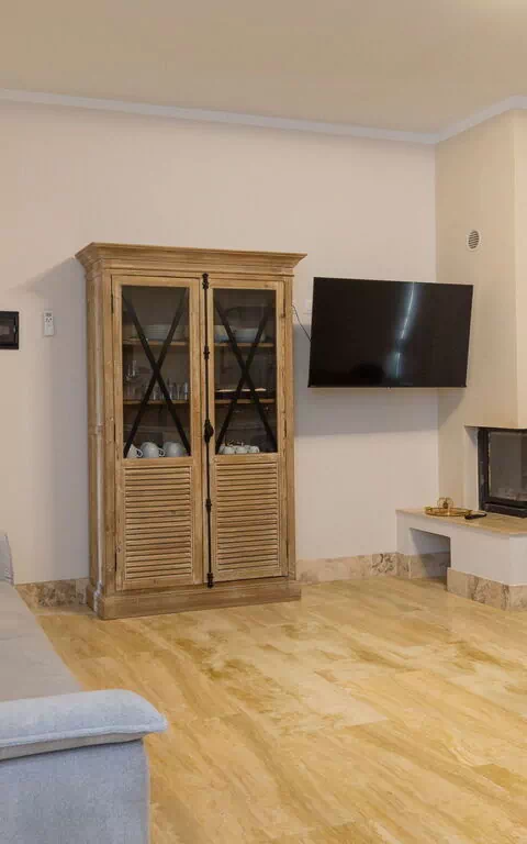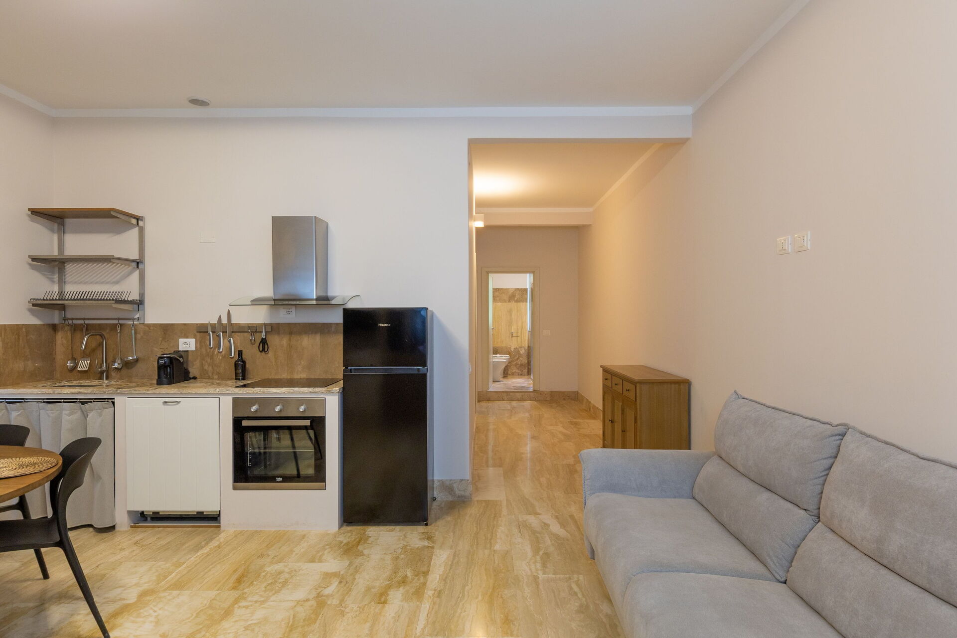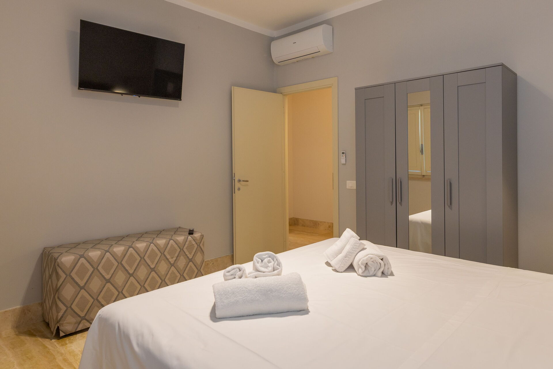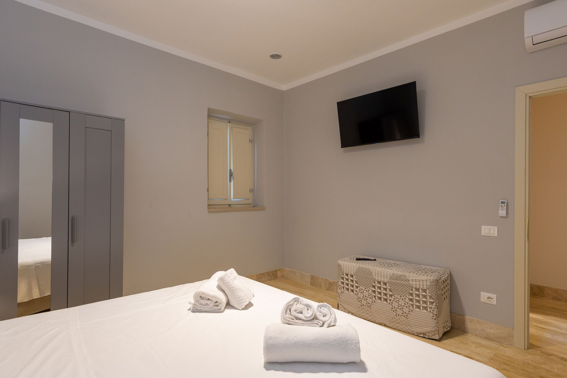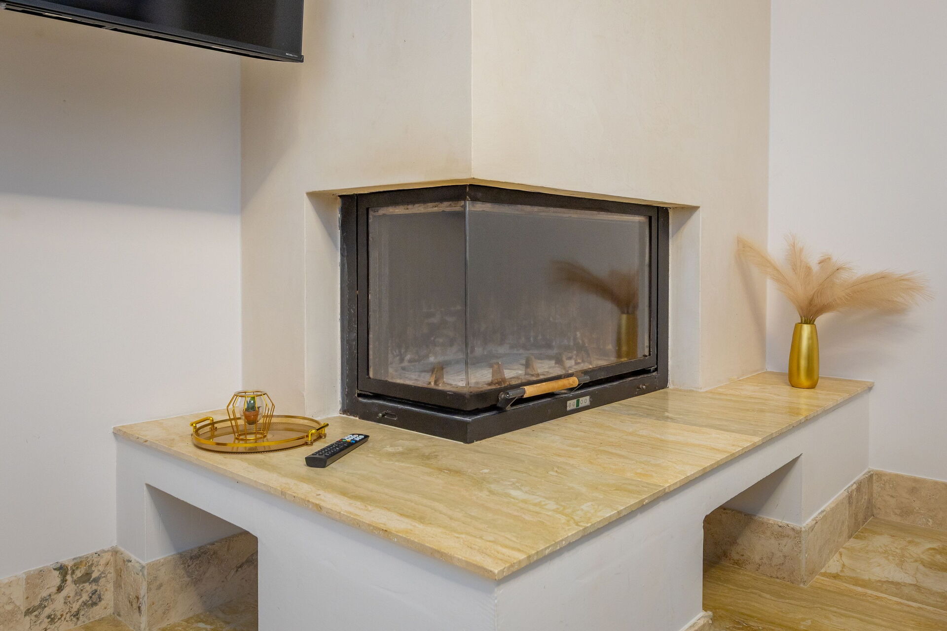 Erster Stock: Wohnzimmer (Smart-TV und Klimaanlage) mit Doppelschlafcouch, Essbereich und Küchenzeile (Geschirrspüler, Backofen, Kühlschrank, Espressomaschine, Toaster), 2 Doppelzimmer (jedes mit Klimaanlage), Bad mit Dusche.