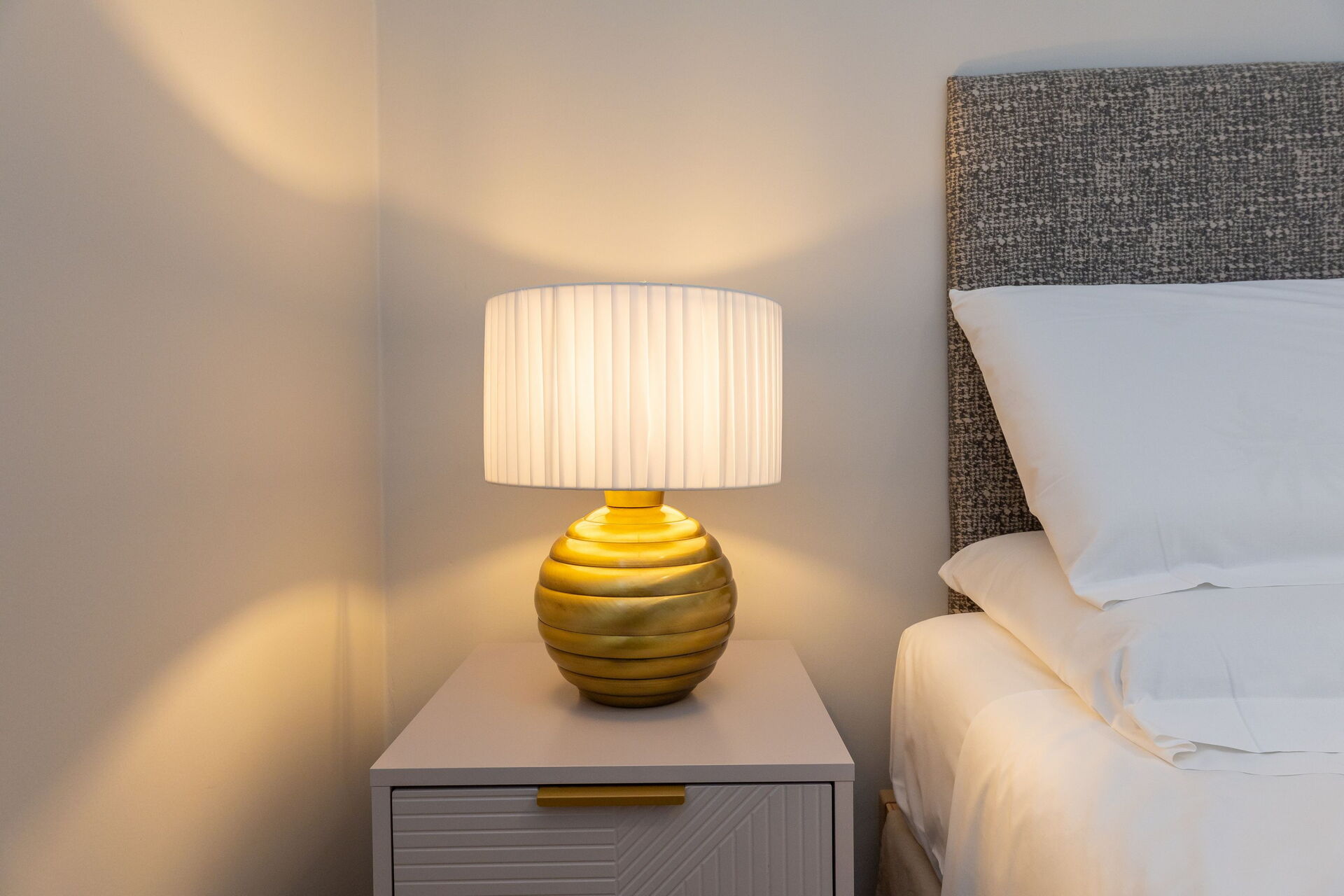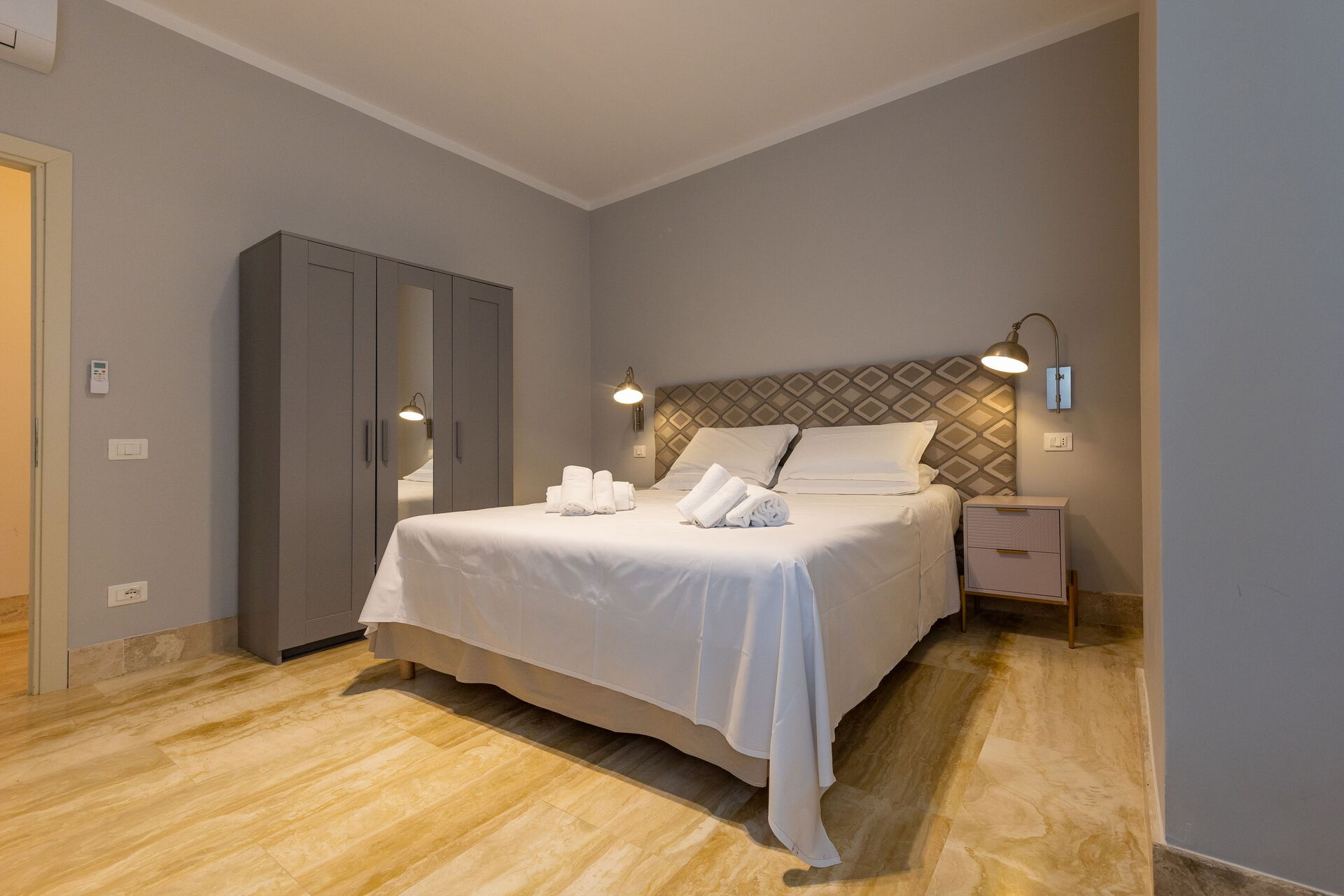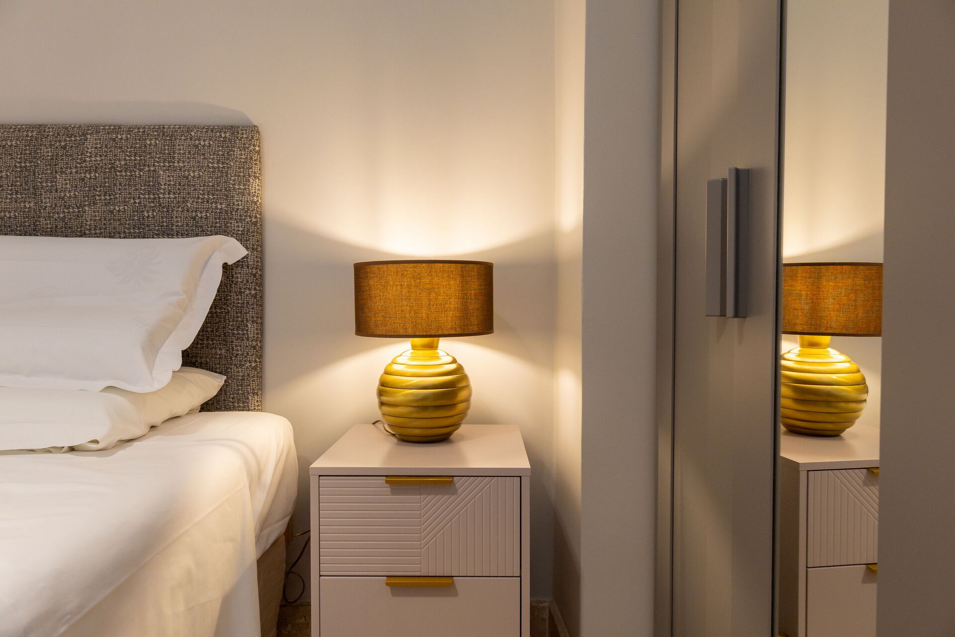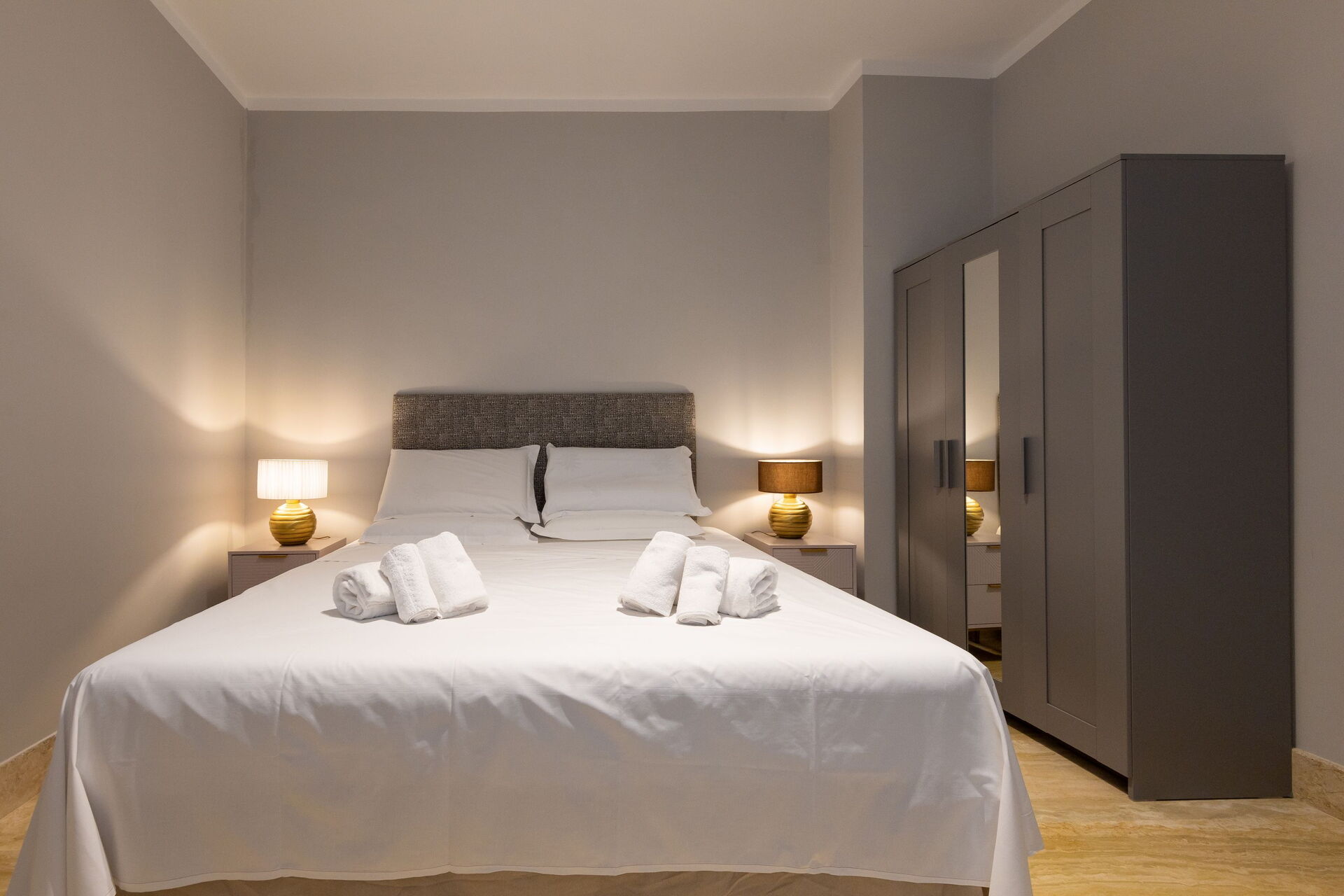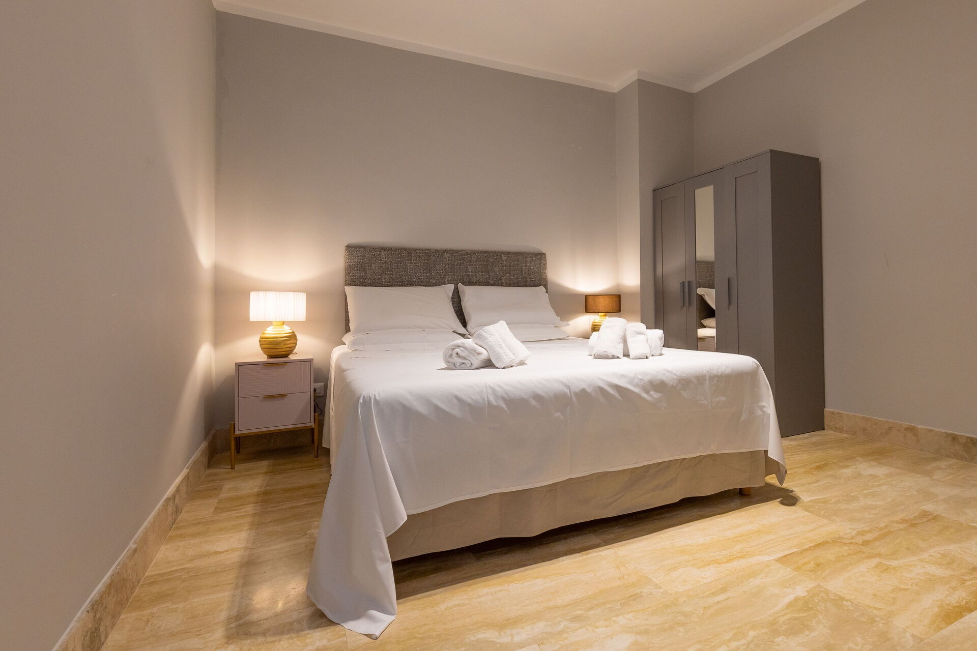 Erster Stock: Wohnzimmer (Smart-TV und Klimaanlage) mit Doppelschlafcouch, Essbereich und Küchenzeile (Geschirrspüler, Backofen, Kühlschrank, Espressomaschine, Toaster), 2 Doppelzimmer (jedes mit Klimaanlage), Bad mit Dusche.
