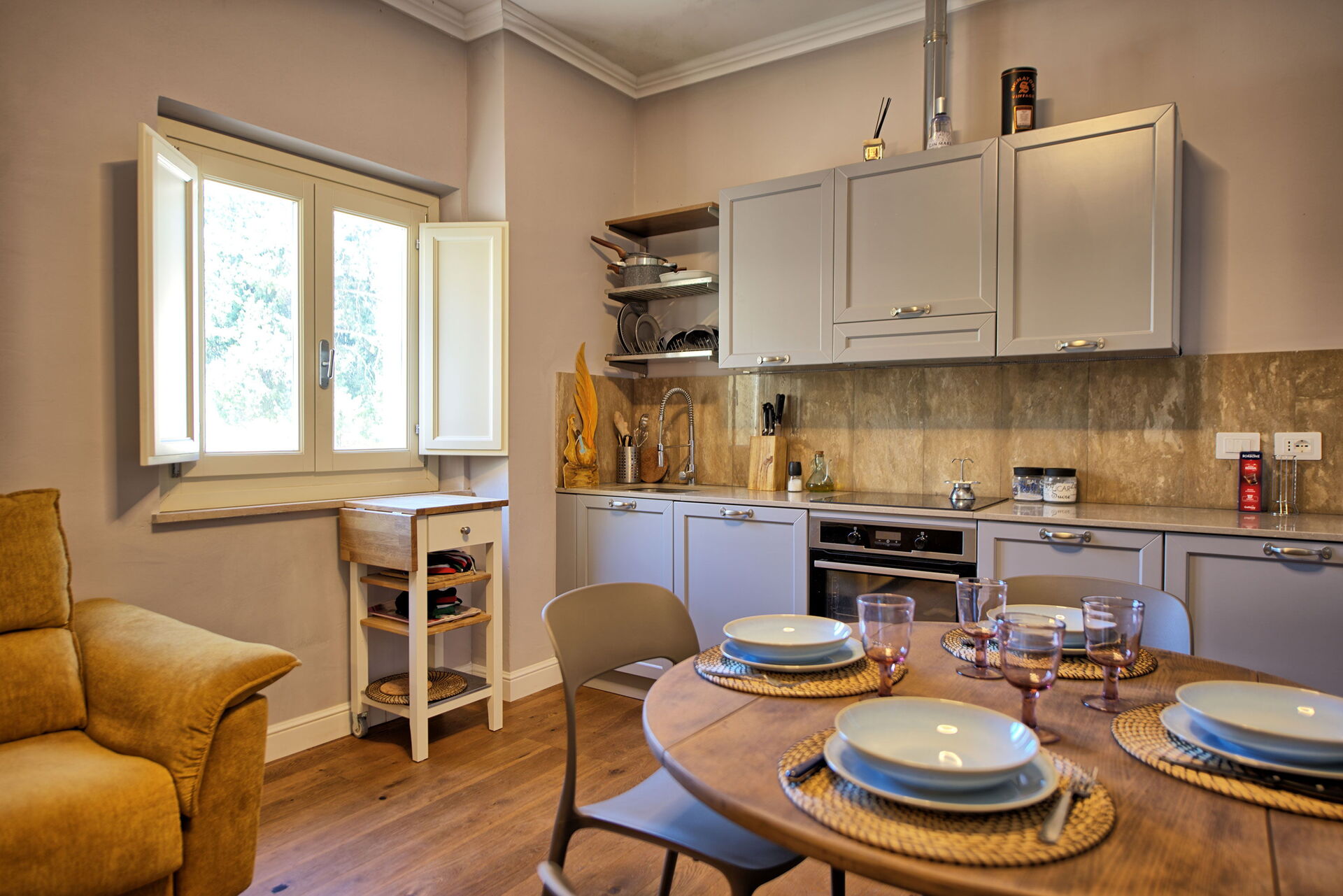 Erster Stock: Wohnzimmer (Smart-TV, Klimaanlage) mit Doppelschlafcouch, Essbereich und Kochnische (Geschirrspüler, Backofen, Kühlschrank, Espressomaschine, Toaster), Doppelzimmer (Klimaanlage), Bad mit Dusche.