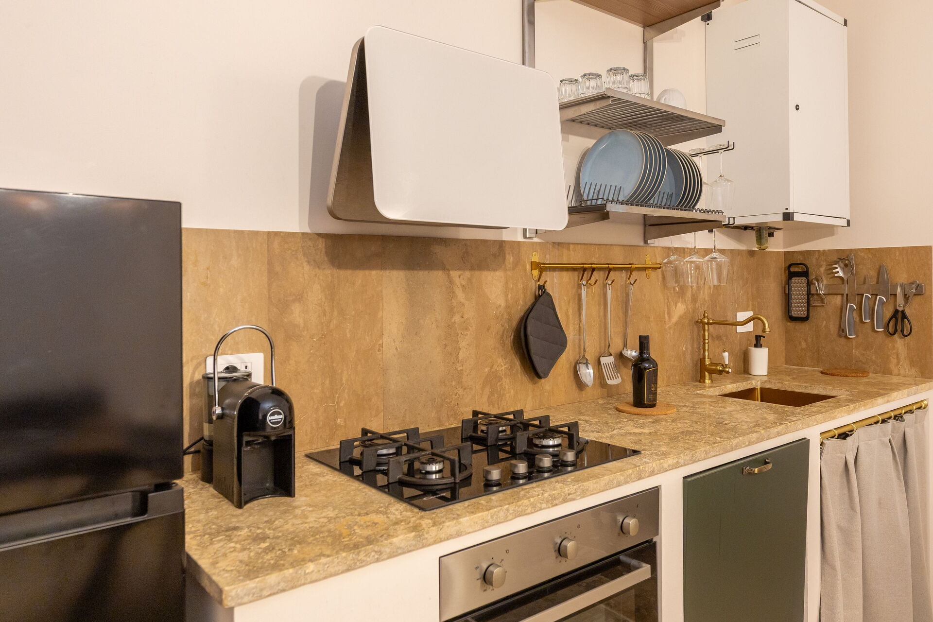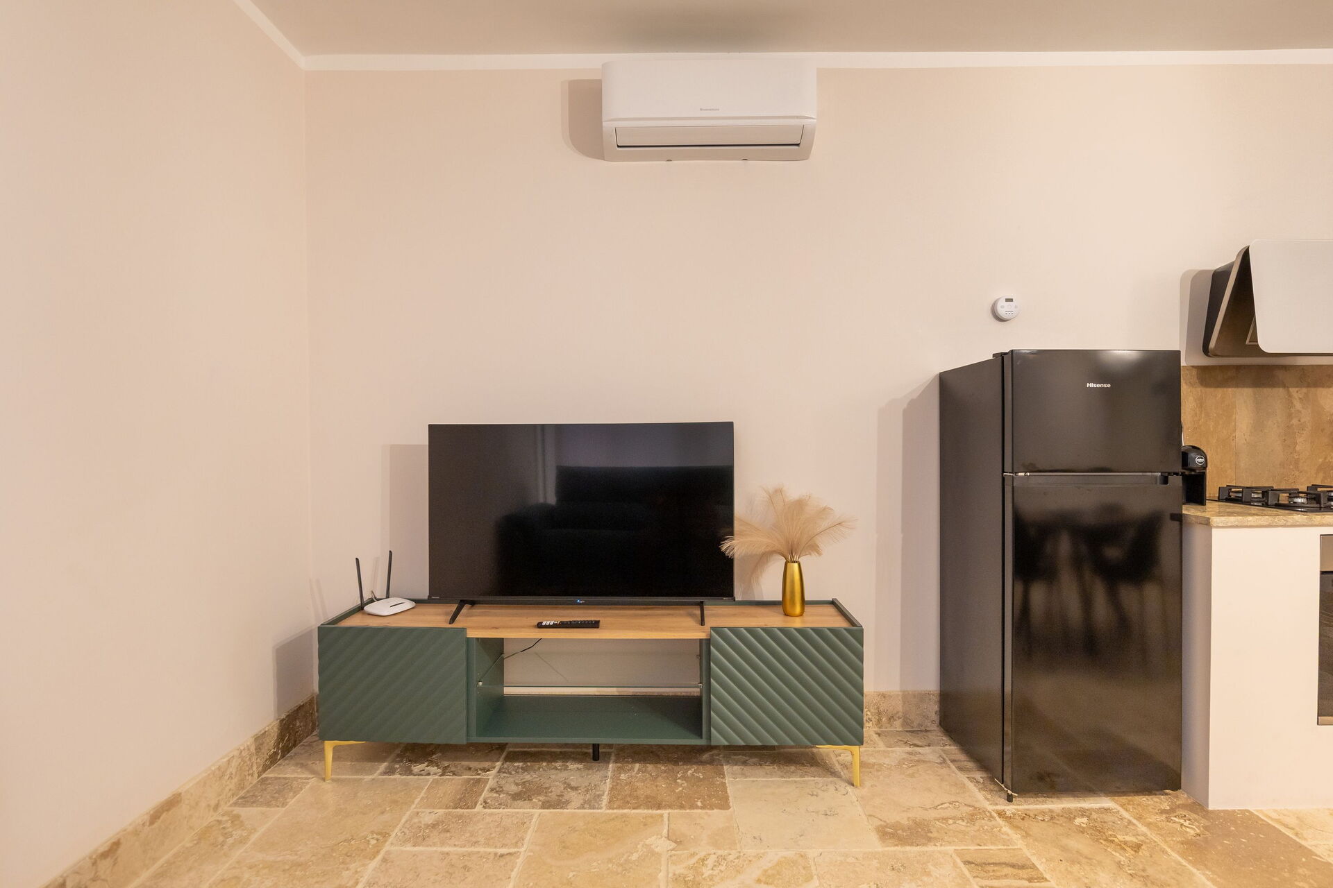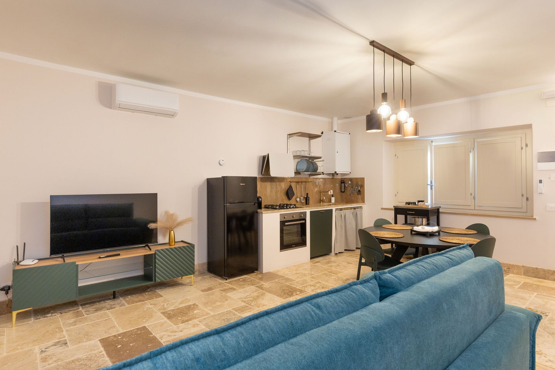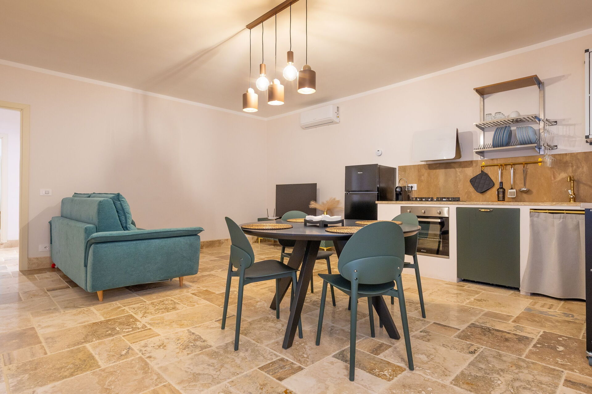 Hochparterre: Wohnzimmer (Smart-TV, Klimaanlage) mit Doppelschlafcouch, Essbereich und Kochnische (Geschirrspüler, Backofen, Kühlschrank, Espressomaschine, Toaster), Doppelzimmer (Klimaanlage), Bad mit Dusche.