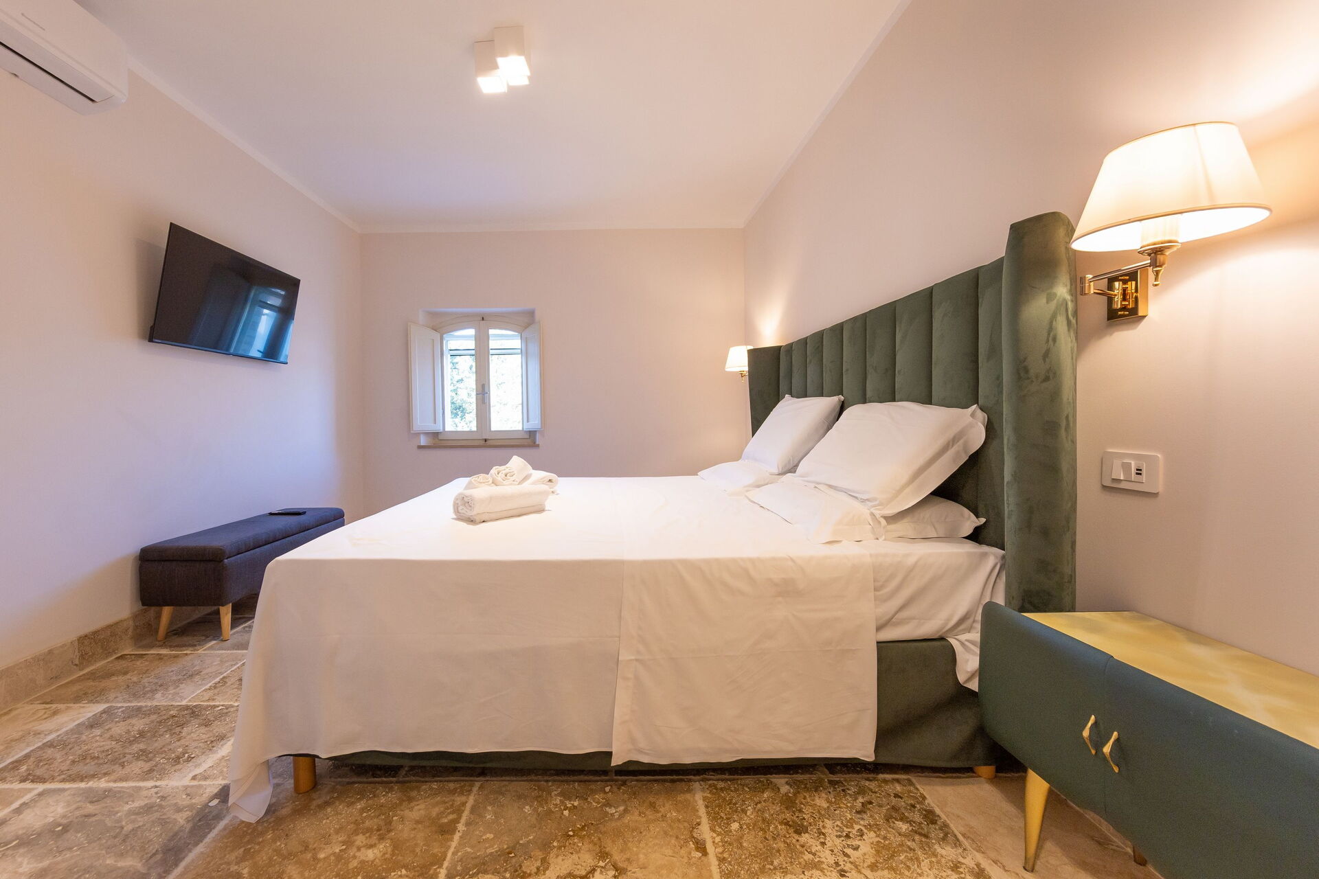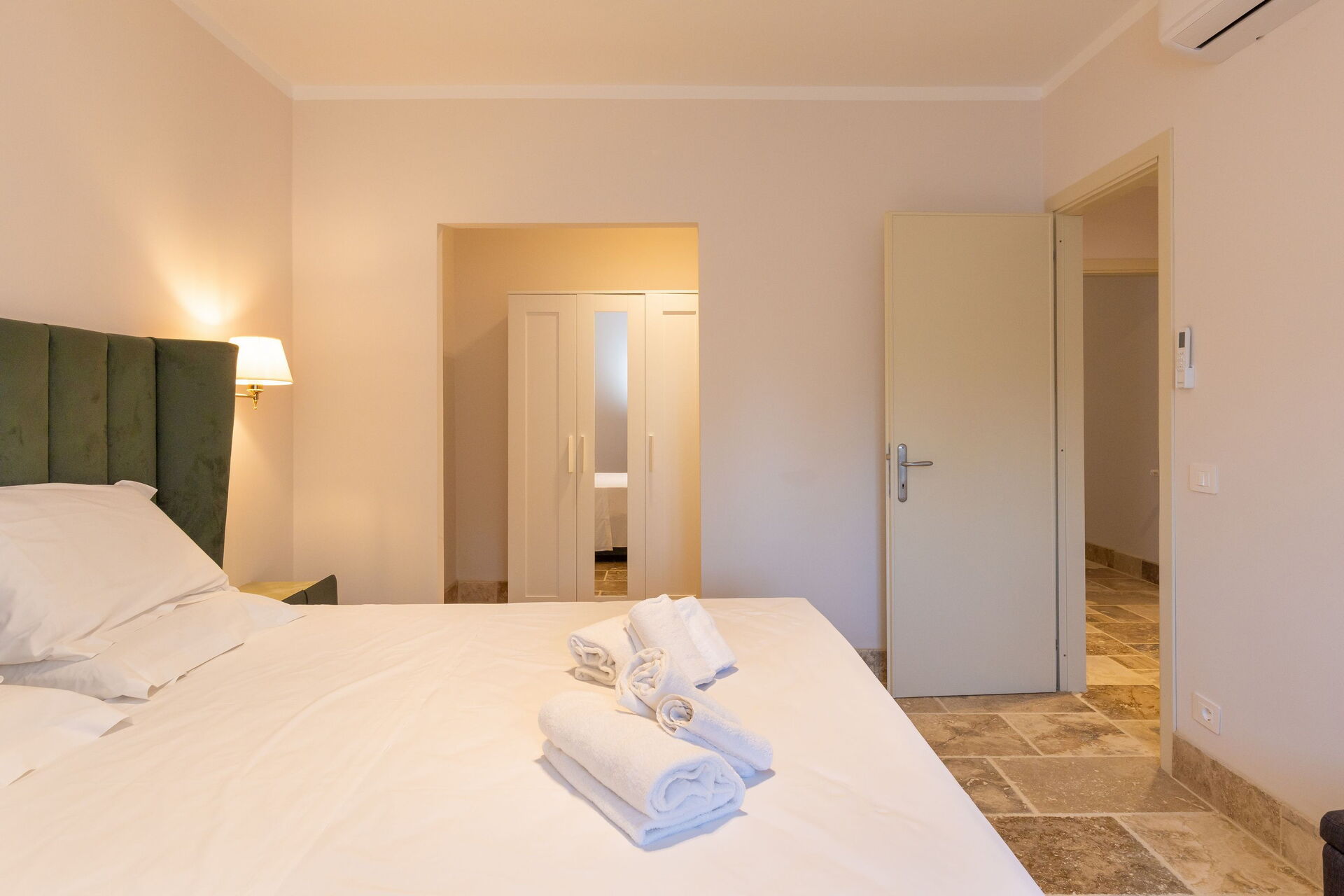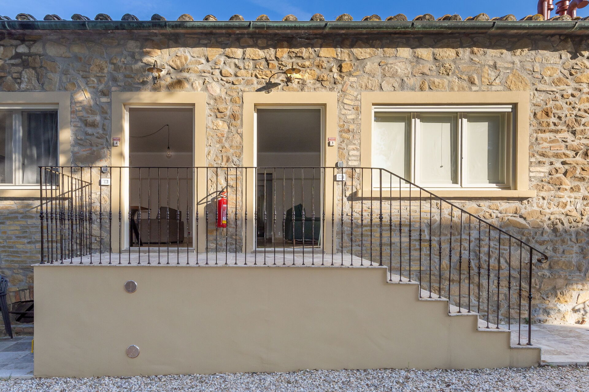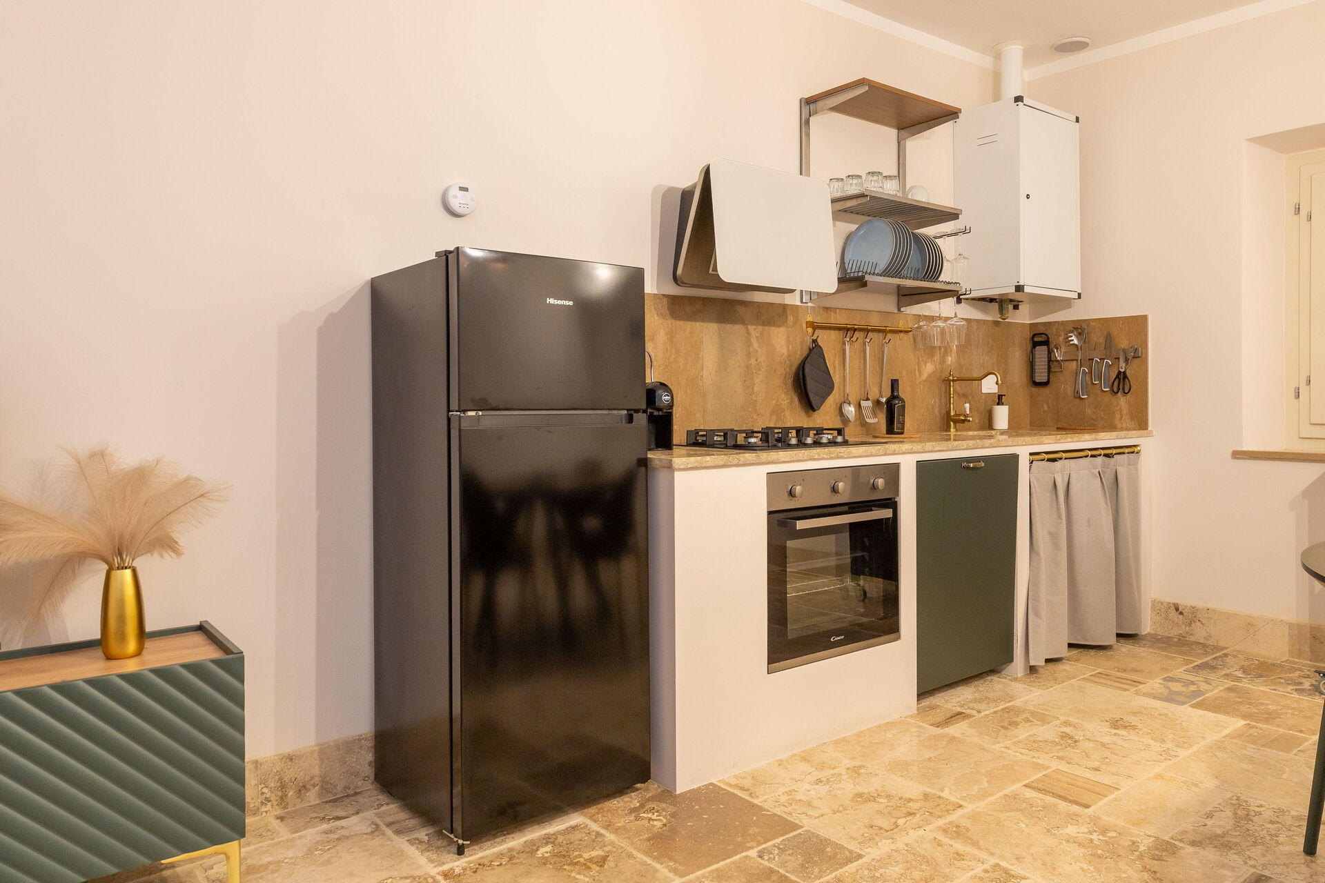 Hochparterre: Wohnzimmer (Smart-TV, Klimaanlage) mit Doppelschlafcouch, Essbereich und Kochnische (Geschirrspüler, Backofen, Kühlschrank, Espressomaschine, Toaster), Doppelzimmer (Klimaanlage), Bad mit Dusche.