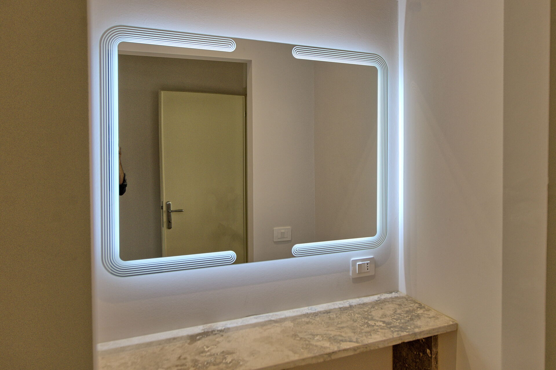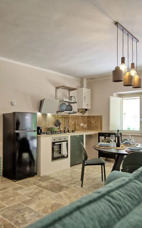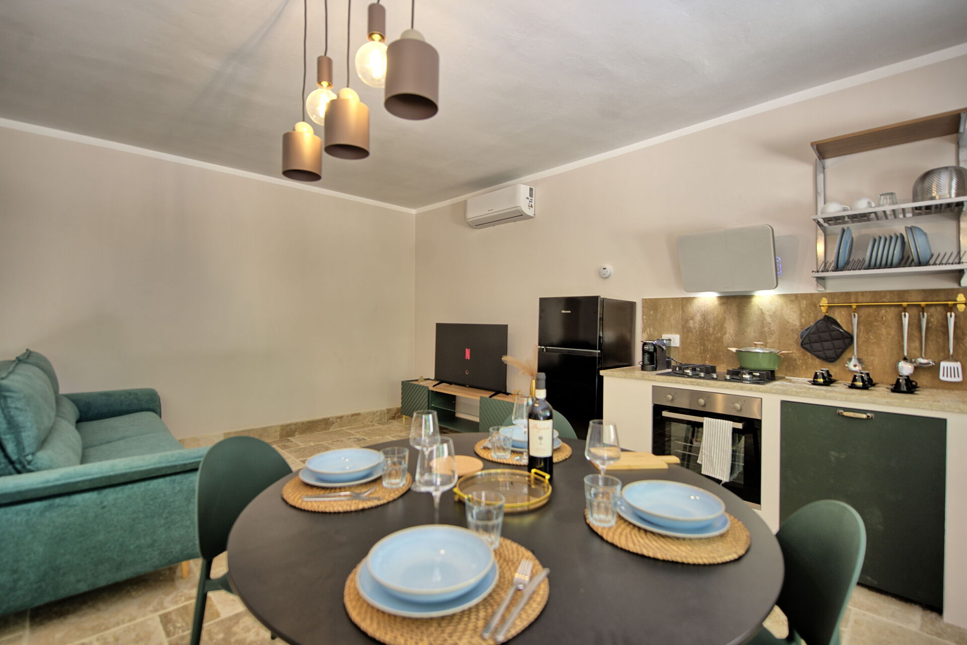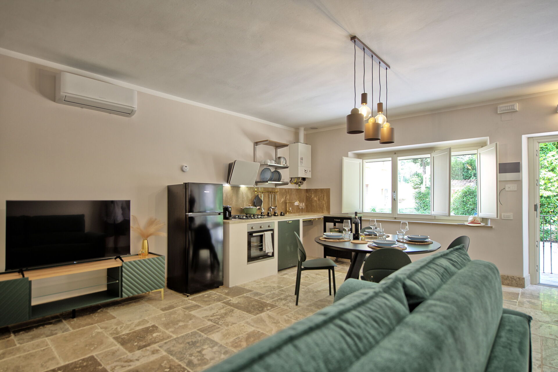 Hochparterre: Wohnzimmer (Smart-TV, Klimaanlage) mit Doppelschlafcouch, Essbereich und Kochnische (Geschirrspüler, Backofen, Kühlschrank, Espressomaschine, Toaster), Doppelzimmer (Klimaanlage), Bad mit Dusche.