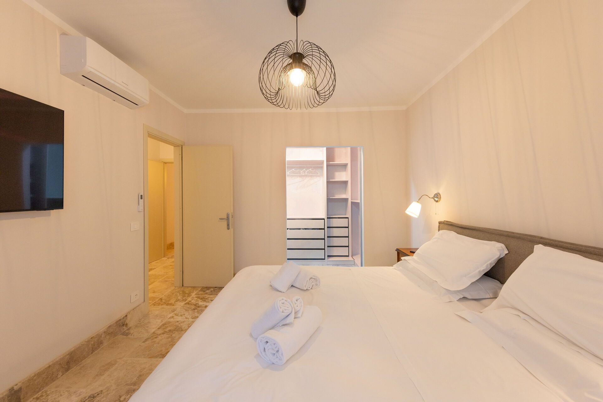 Hochparterre: Wohnzimmer (Smart-TV, Klimaanlage) mit Doppelschlafcouch, Essbereich und Kochnische (Geschirrspüler, Backofen, Kühlschrank, Espressomaschine, Toaster), Doppelzimmer (Klimaanlage), Bad mit Dusche.