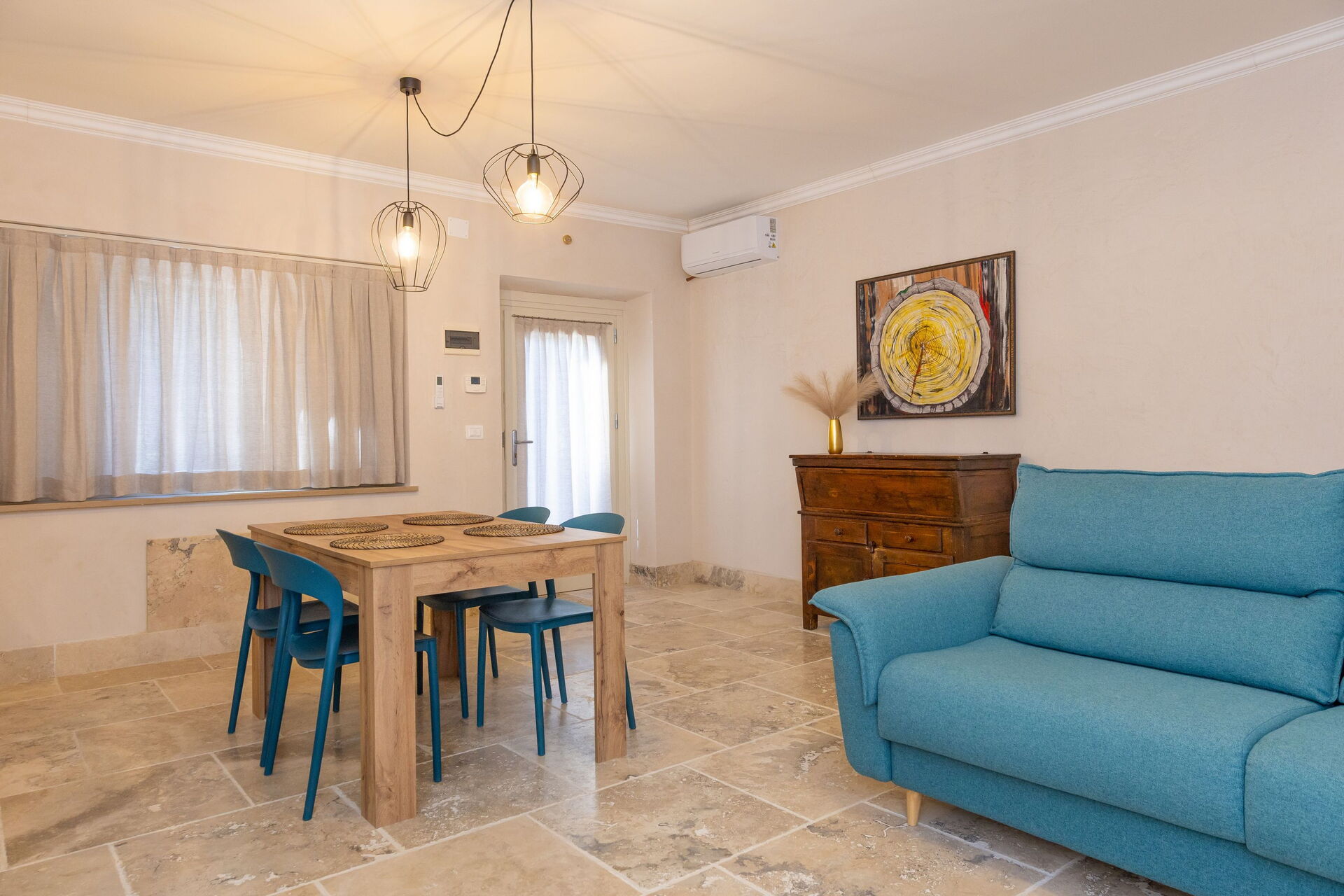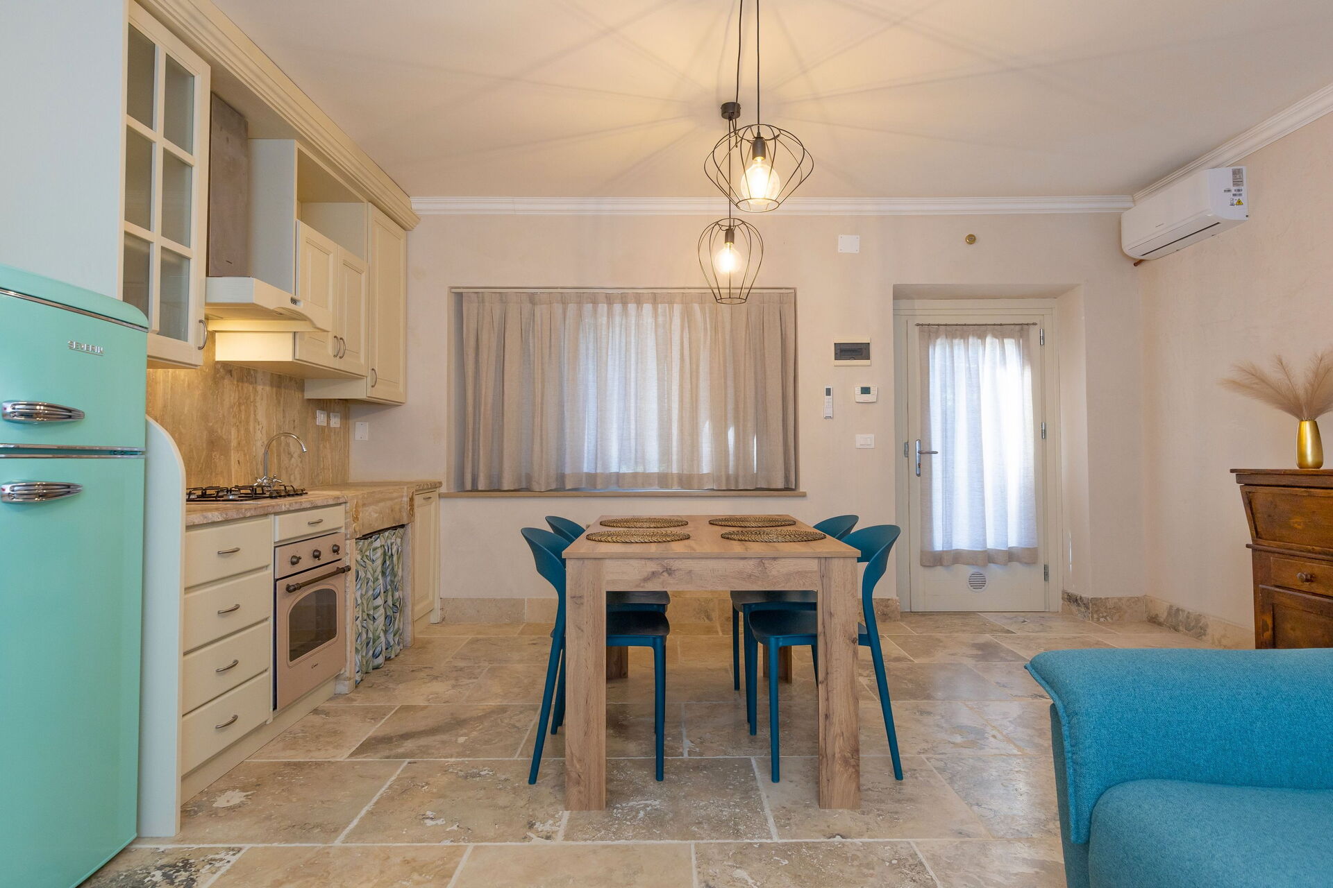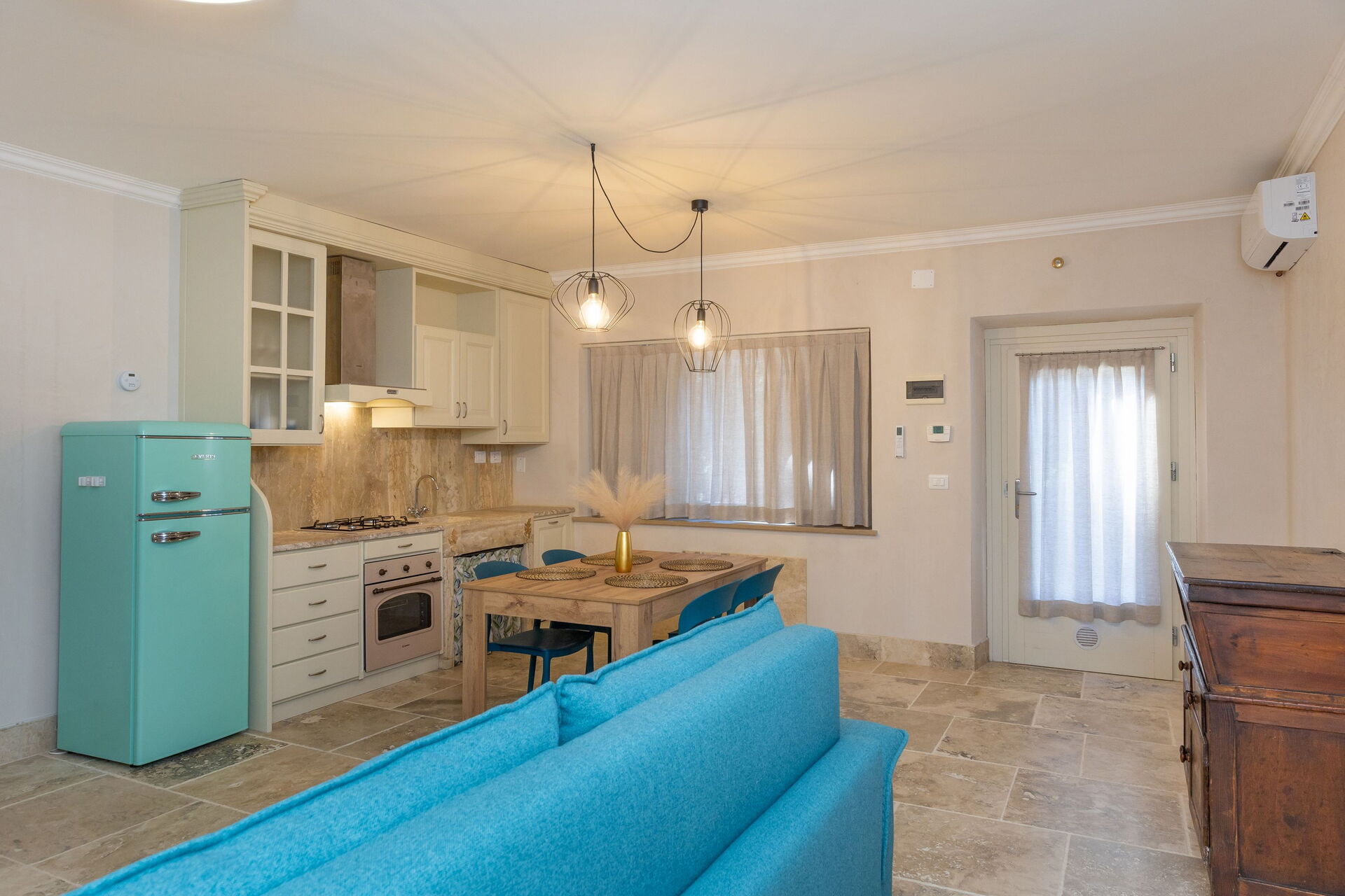 Hochparterre: Wohnzimmer (Smart-TV, Klimaanlage) mit Doppelschlafcouch, Essbereich und Kochnische (Geschirrspüler, Backofen, Kühlschrank, Espressomaschine, Toaster), Doppelzimmer (Klimaanlage), Bad mit Dusche.