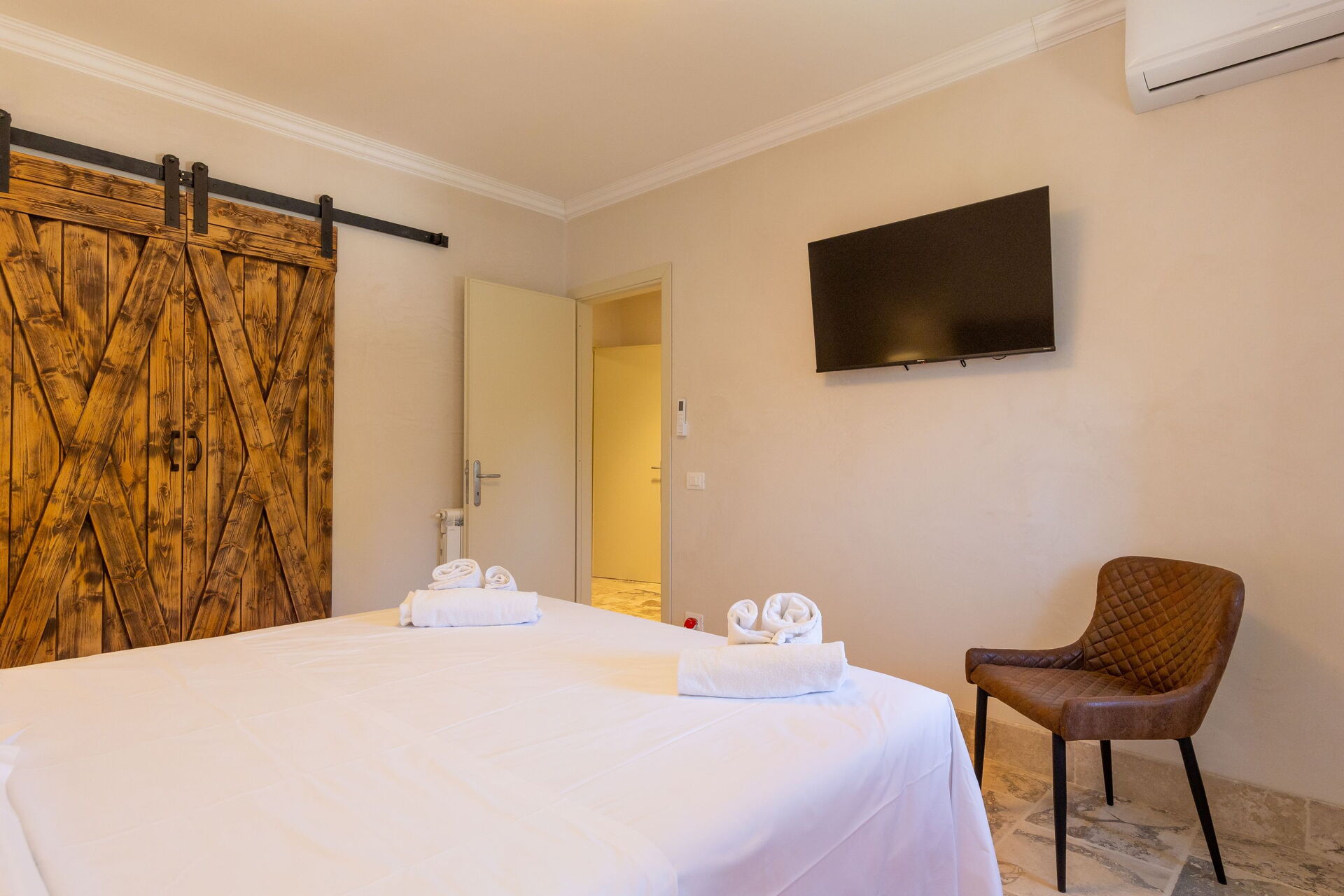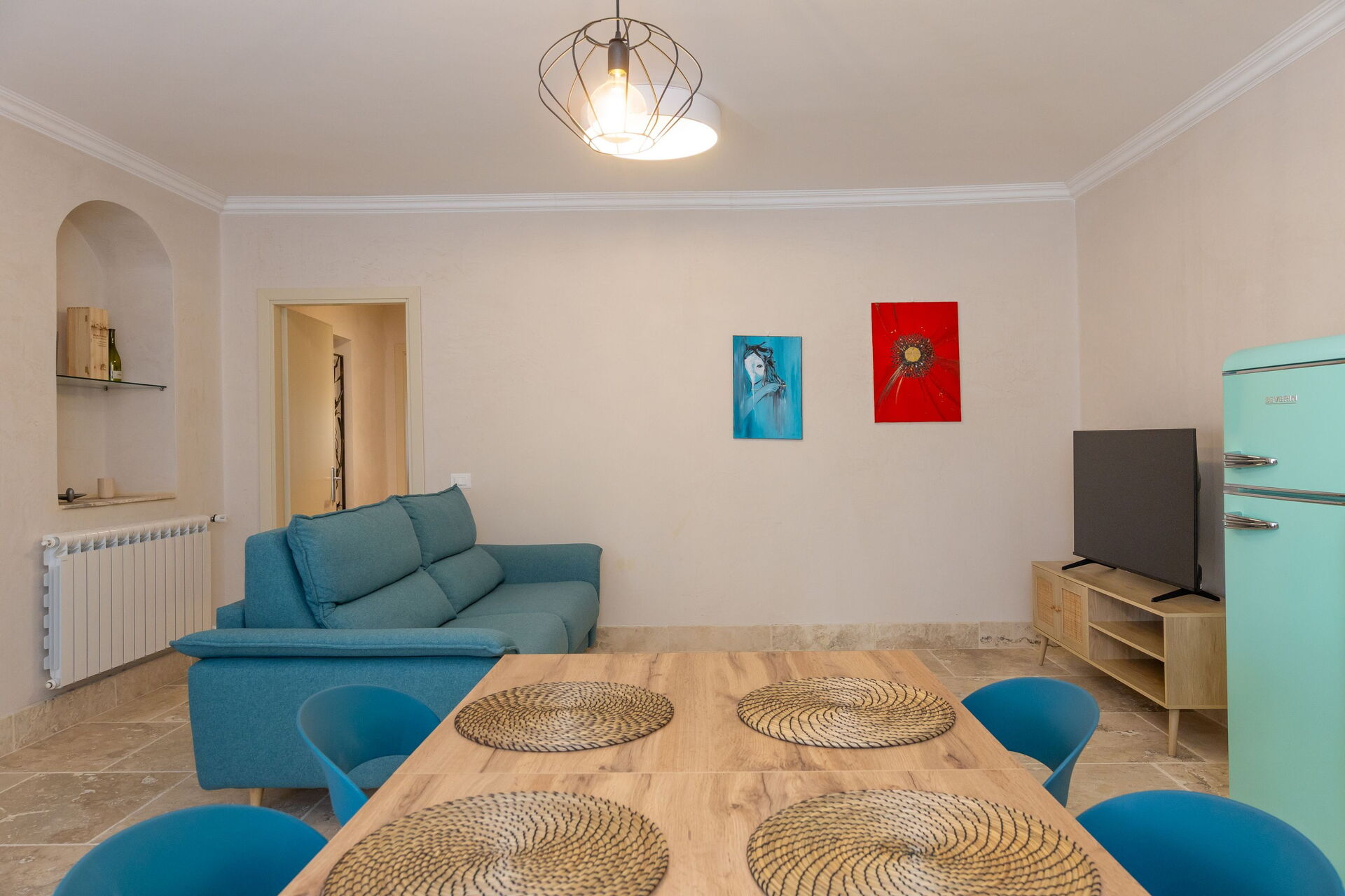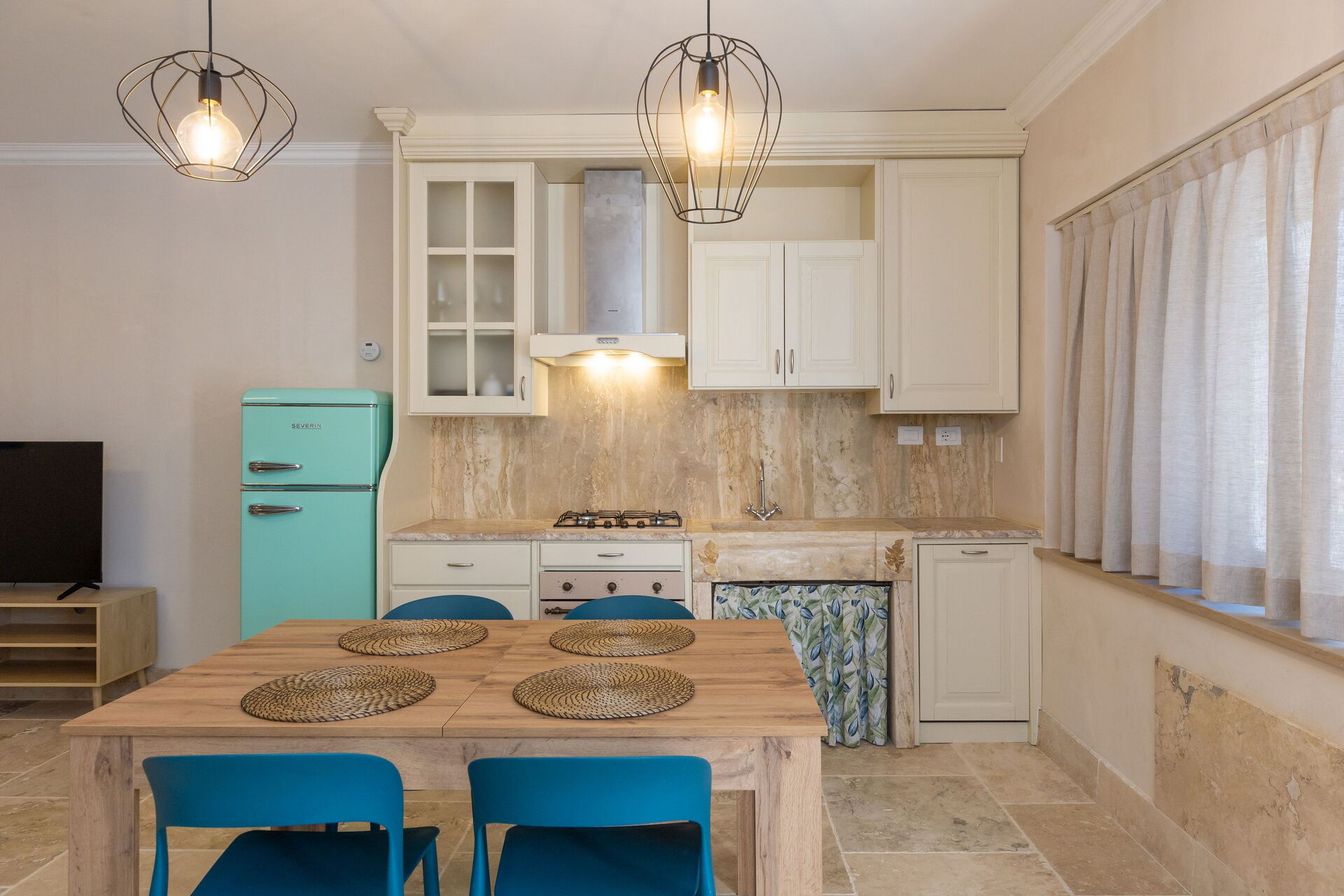 Hochparterre: Wohnzimmer (Smart-TV, Klimaanlage) mit Doppelschlafcouch, Essbereich und Kochnische (Geschirrspüler, Backofen, Kühlschrank, Espressomaschine, Toaster), Doppelzimmer (Klimaanlage), Bad mit Dusche.