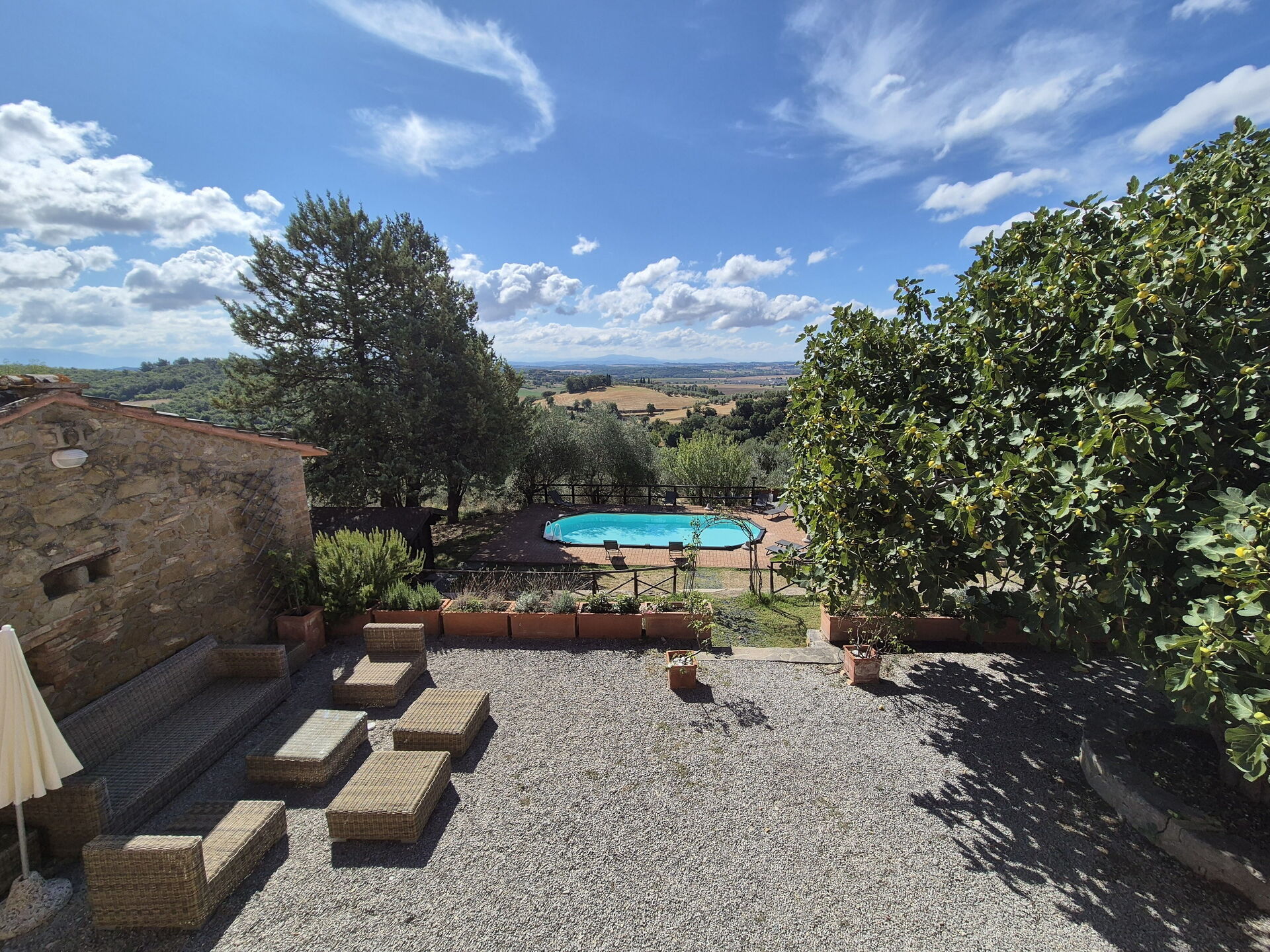 We traveled with an extended family of 10, of all ages. There was plenty of room, including very nice spots to eat outdoors with a view. The chance to visit the house when the 100s-year-old fig tree was ripe with fruit was a special treat. We enjoyed the gorgeous panorama. The pool and the ping pong were big hits with the kids, and a welcome break from the heat. Caretakers arrived each morning to clean the pool and water the gardens. Indoors, we would caution that there is no AC; this proved to be less of an issue with the hosts providing fans, but the upper bedrooms (especially) might be challenging for those used to sleeping in AC when summer temps are high. The compact kitchen was well-stocked to accommodate our large group, but visitors should come prepared with soap/paper/condiments/etc. The well-situated, historic Umbrian house is in need of some future updates, but provided relaxing and enjoyable family stay. The owner and local caretakers were very responsive and helpful throughout.