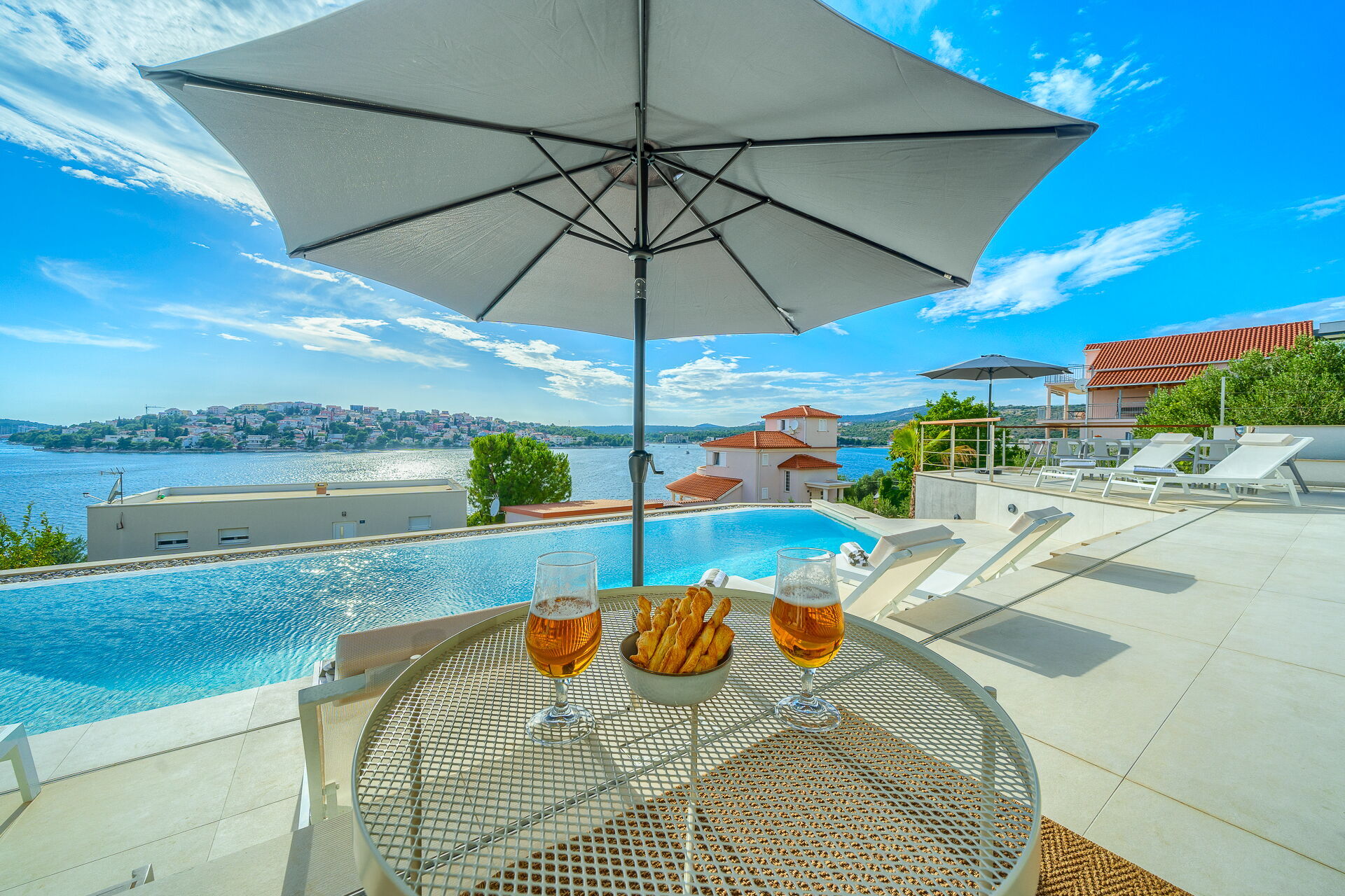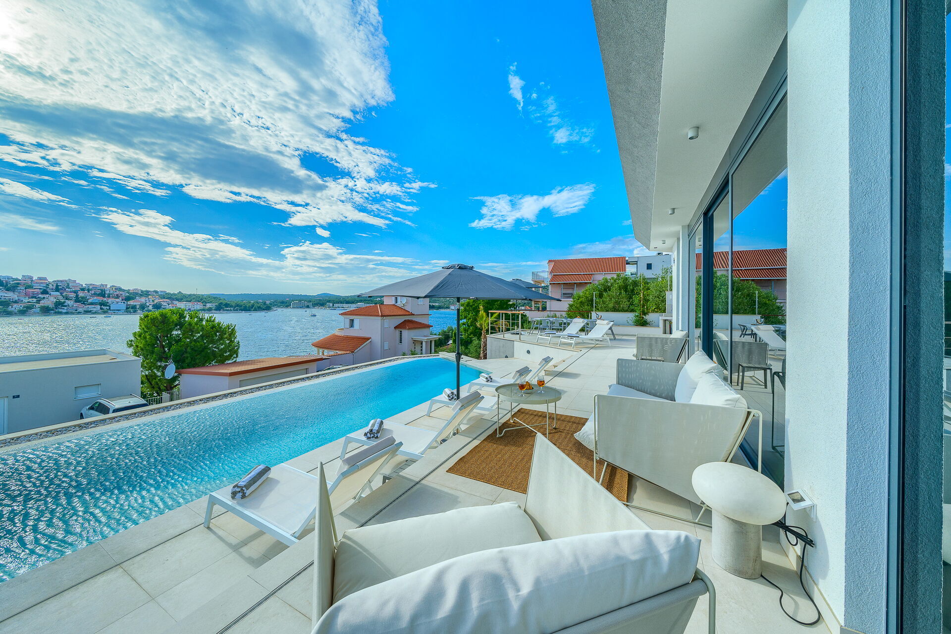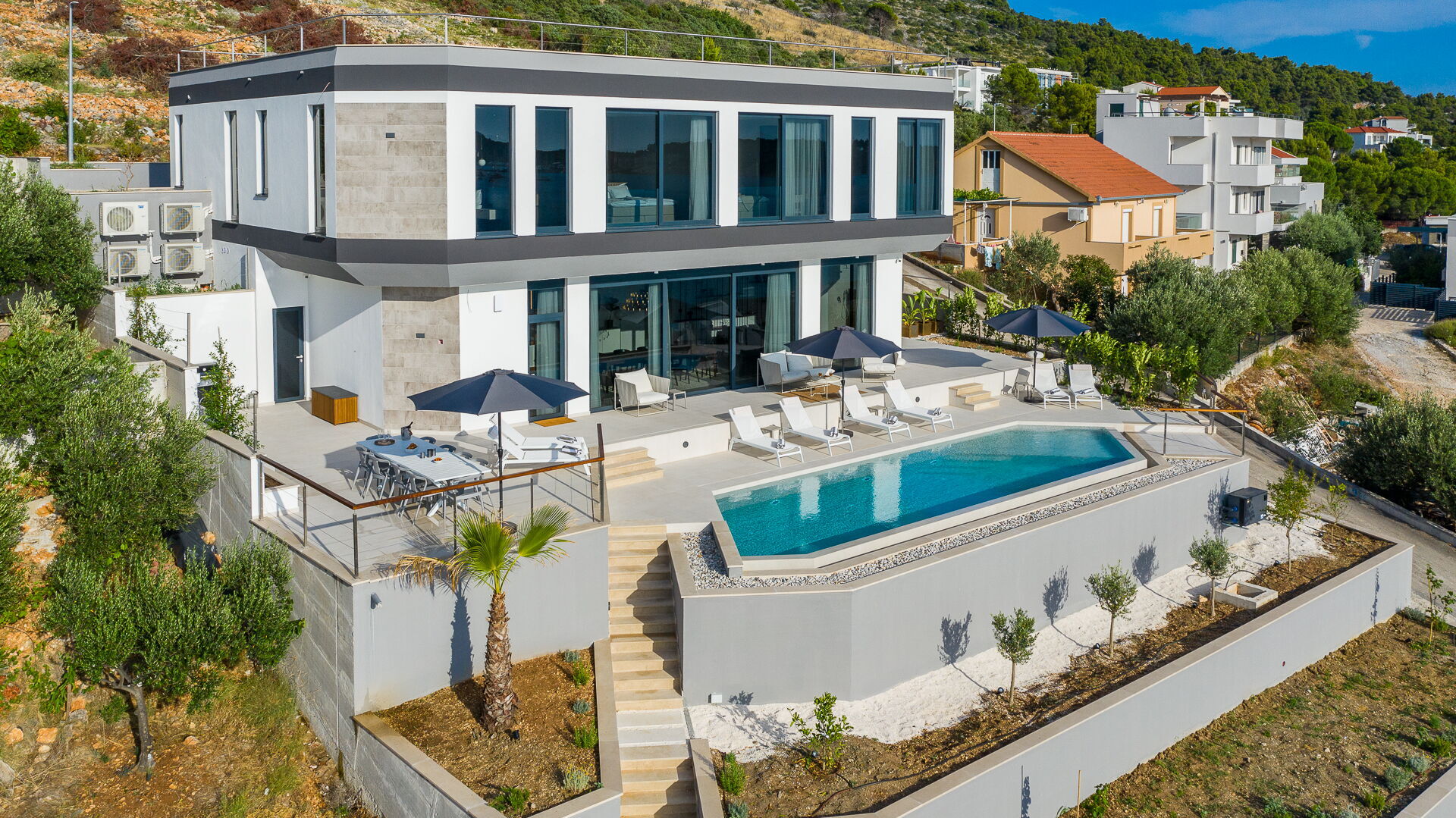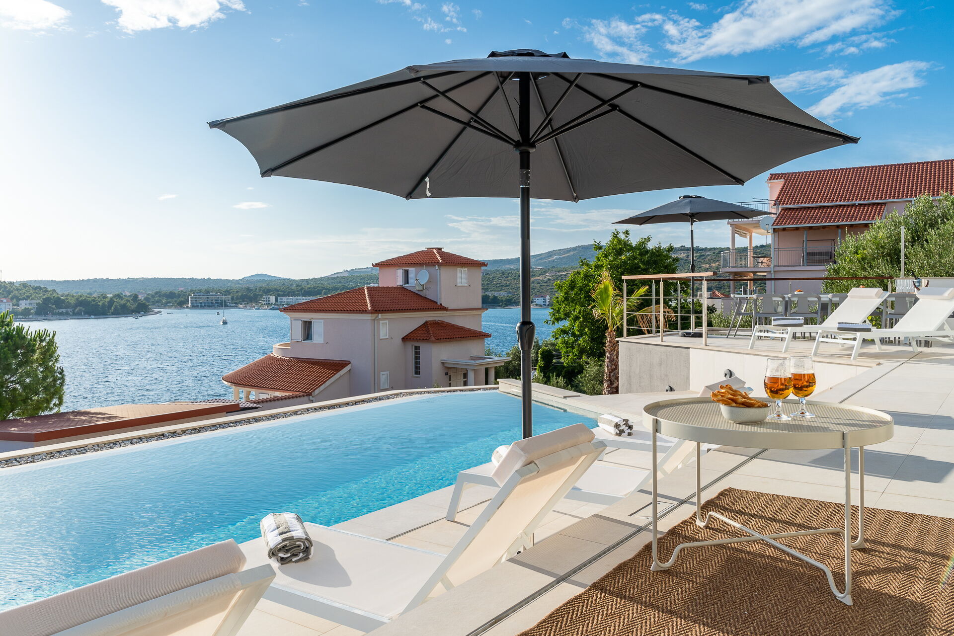 Villa Allina erstreckt sich über zwei Etagen und verfügt im ersten Stock über eine fantastische Sonnenterrasse, auf der das elegante beheizbare Schwimmbad eingebaut wurde und auf der man bezaubernde Sonnenuntergänge über dem Meer genießen kann. Ein mit Tisch, Stühlen und ausgestattetem Grillplatz steht den Gästen zur Verfügung, um Mahlzeiten im Freien organisieren zu können.
