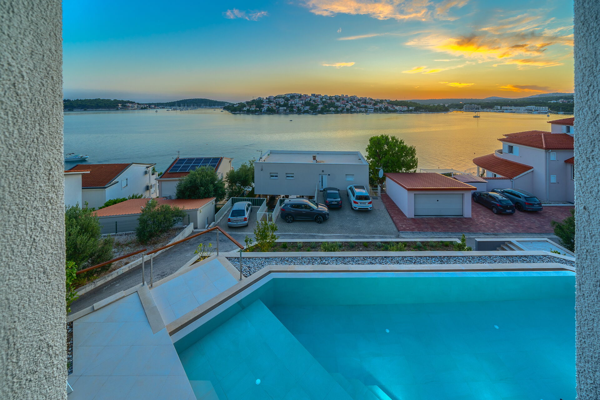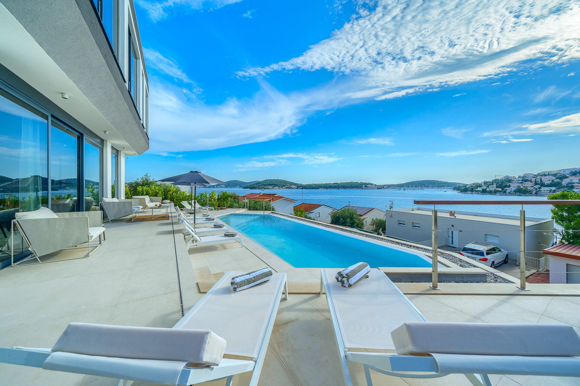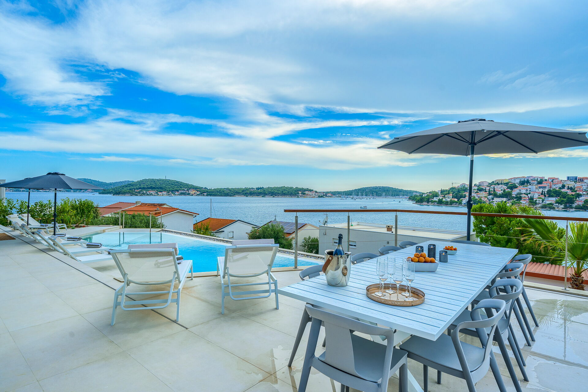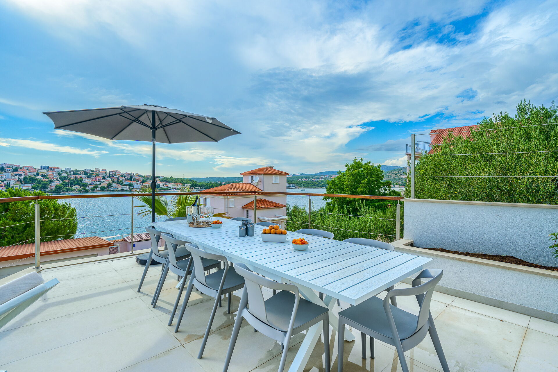 Villa Allina erstreckt sich über zwei Etagen und verfügt im ersten Stock über eine fantastische Sonnenterrasse, auf der das elegante beheizbare Schwimmbad eingebaut wurde und auf der man bezaubernde Sonnenuntergänge über dem Meer genießen kann. Ein mit Tisch, Stühlen und ausgestattetem Grillplatz steht den Gästen zur Verfügung, um Mahlzeiten im Freien organisieren zu können.
