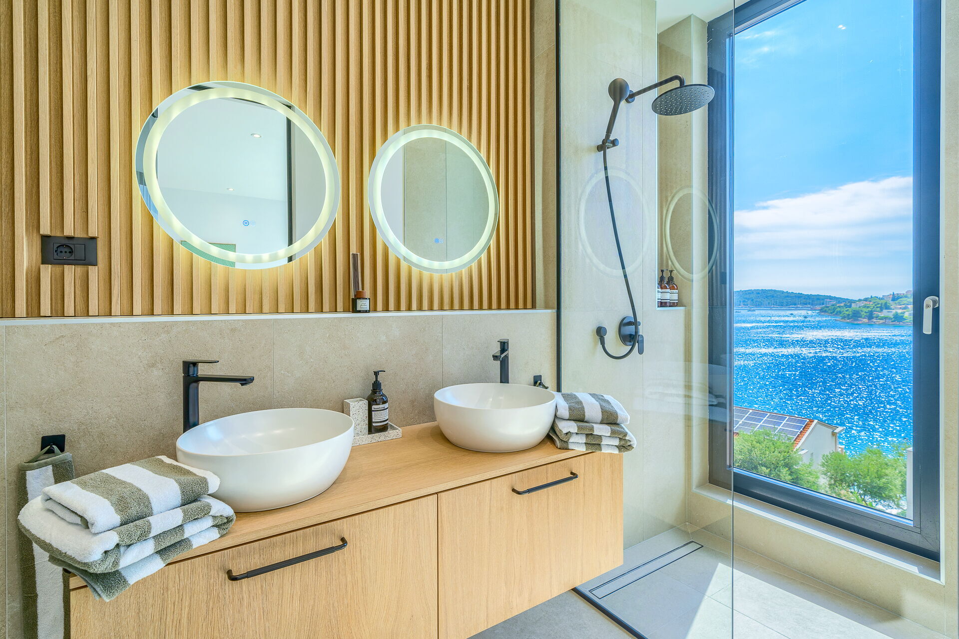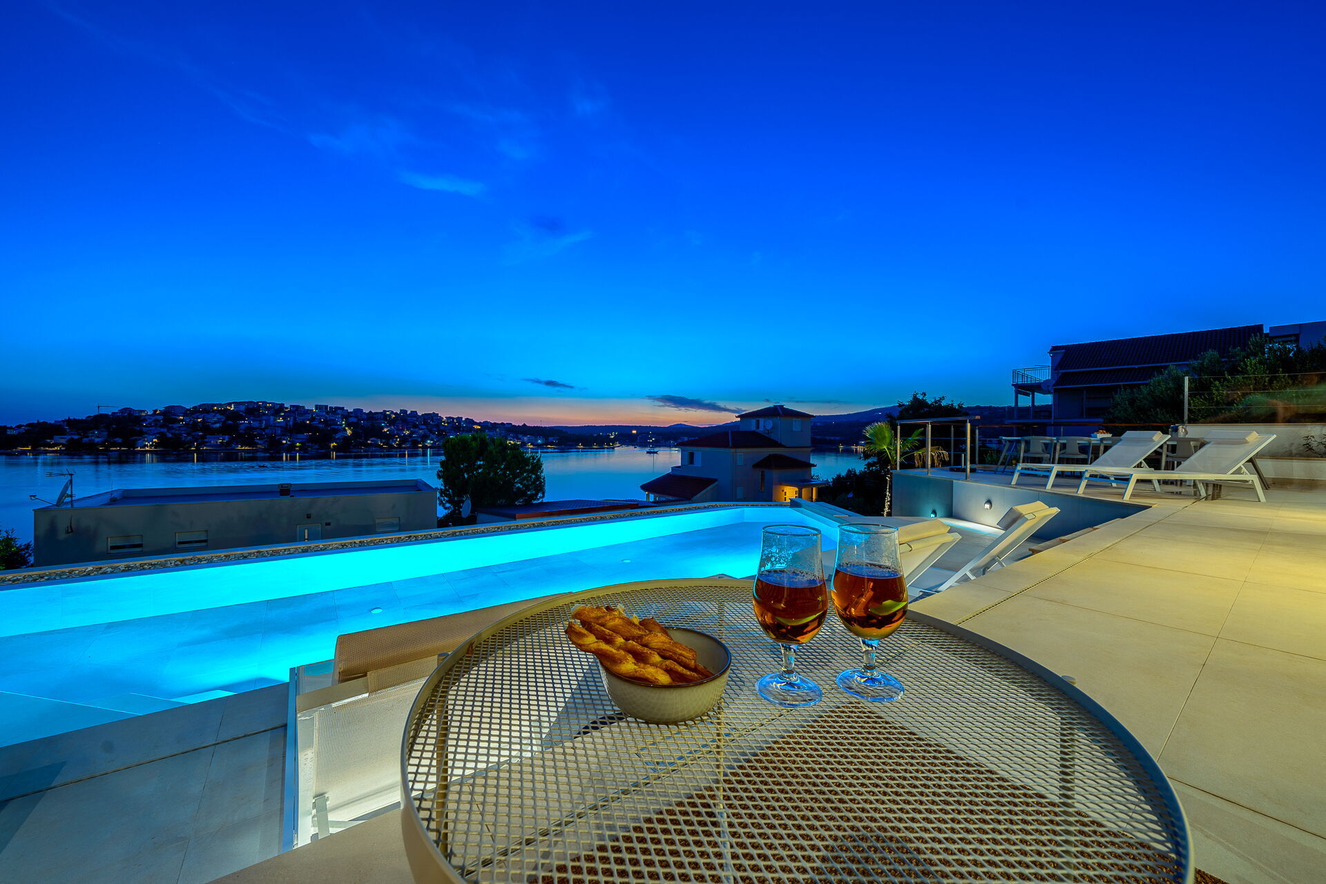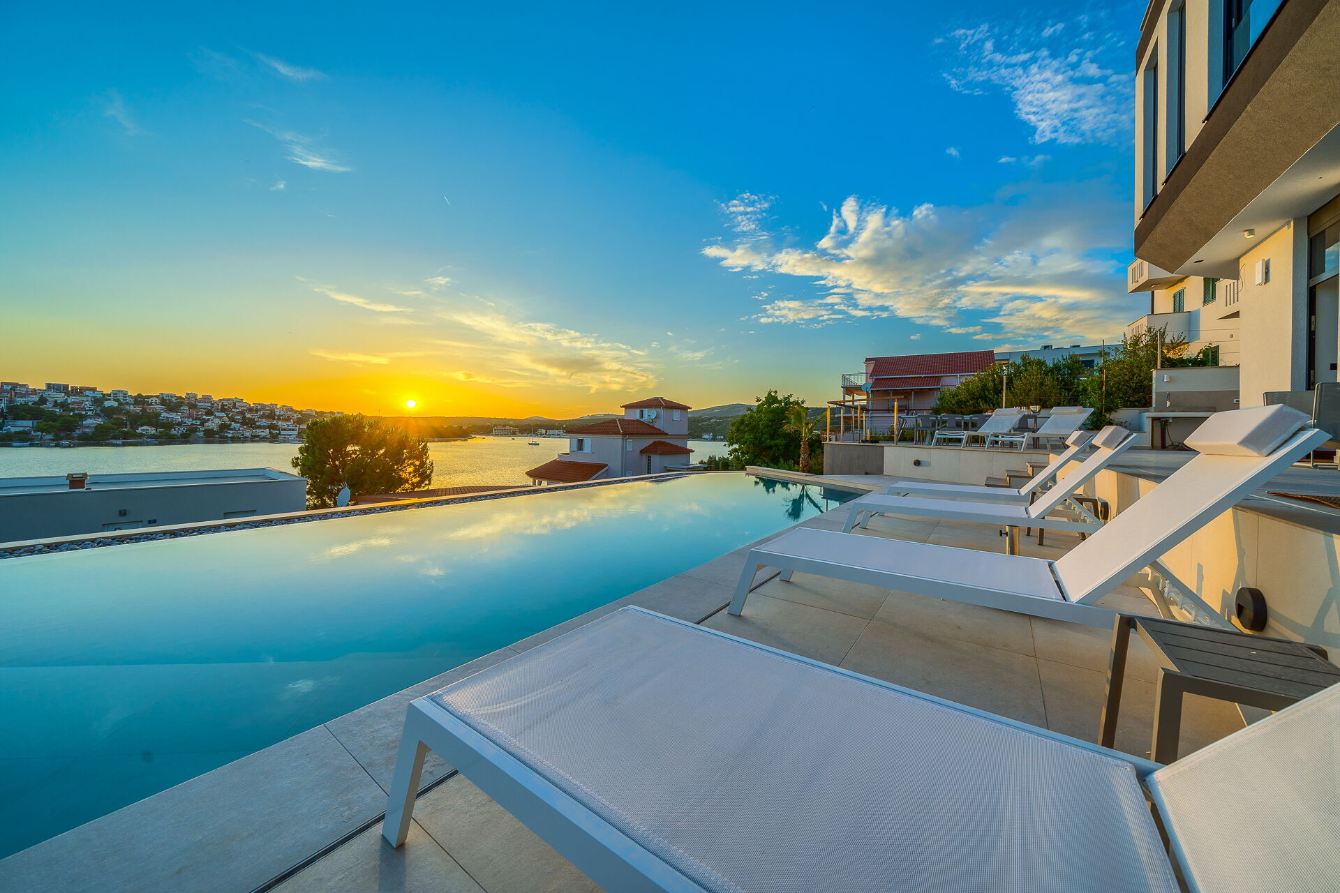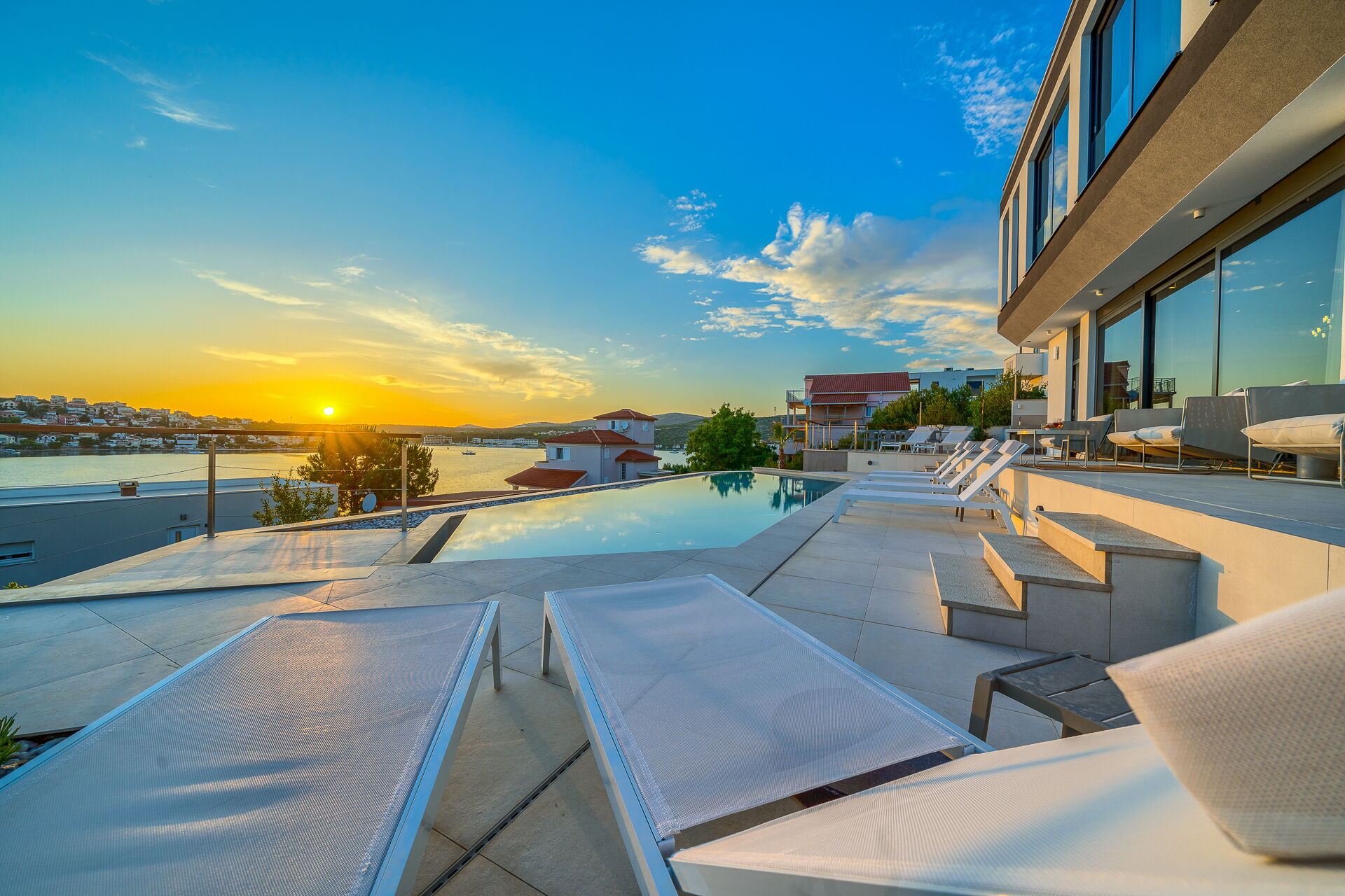 Villa Allina erstreckt sich über zwei Etagen und verfügt im ersten Stock über eine fantastische Sonnenterrasse, auf der das elegante beheizbare Schwimmbad eingebaut wurde und auf der man bezaubernde Sonnenuntergänge über dem Meer genießen kann. Ein mit Tisch, Stühlen und ausgestattetem Grillplatz steht den Gästen zur Verfügung, um Mahlzeiten im Freien organisieren zu können.