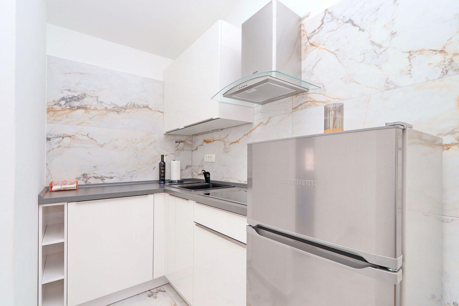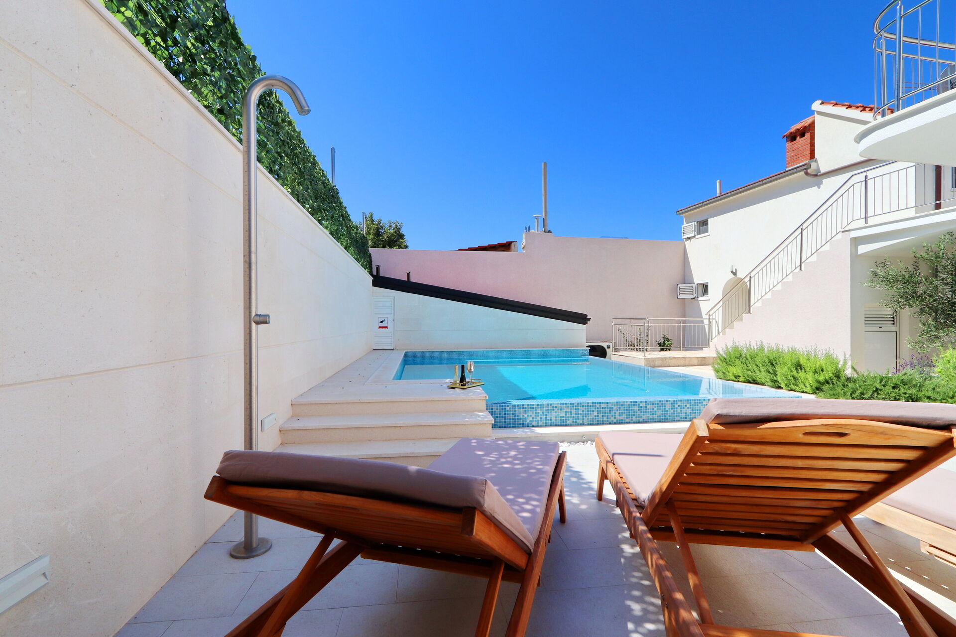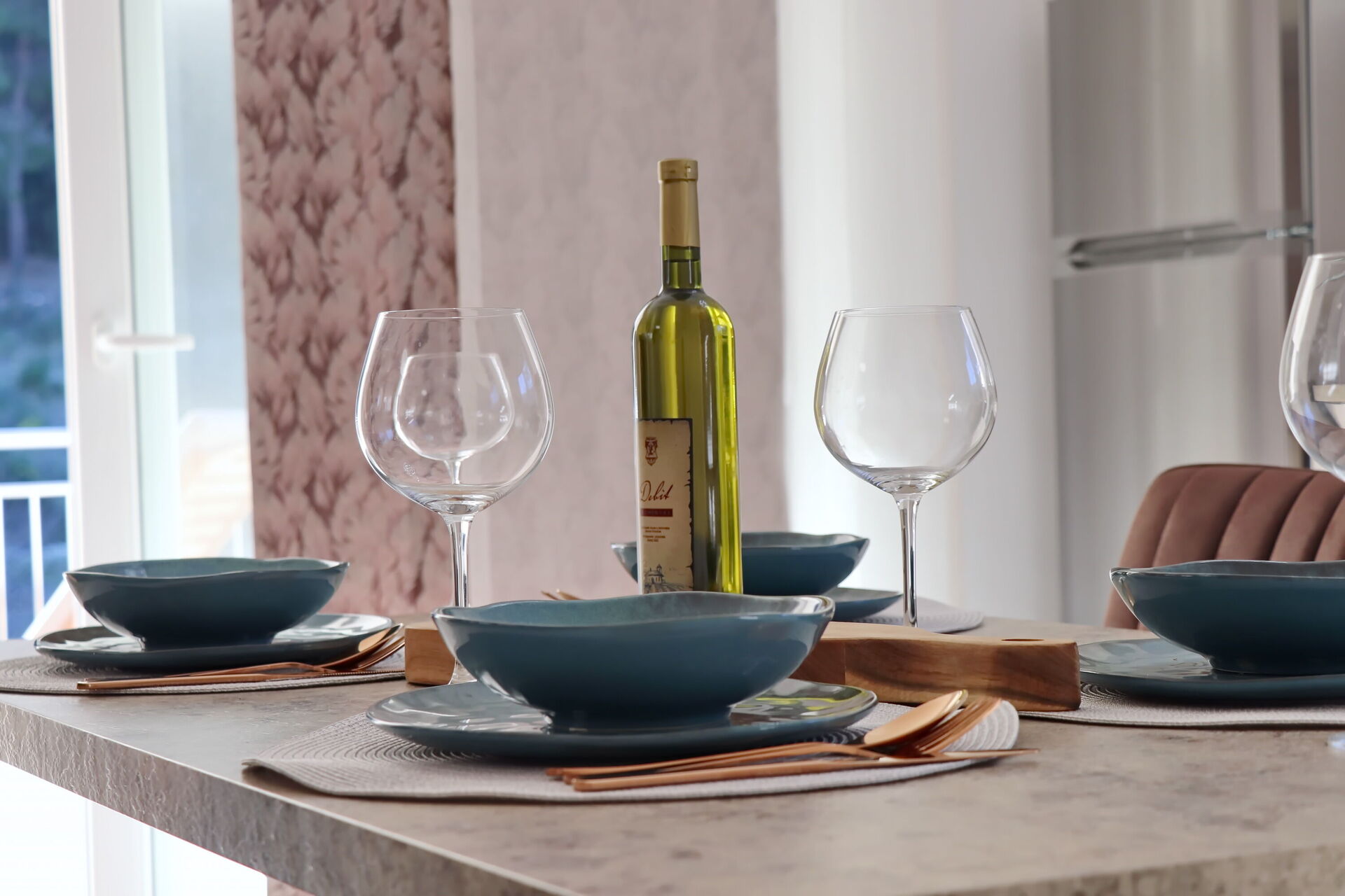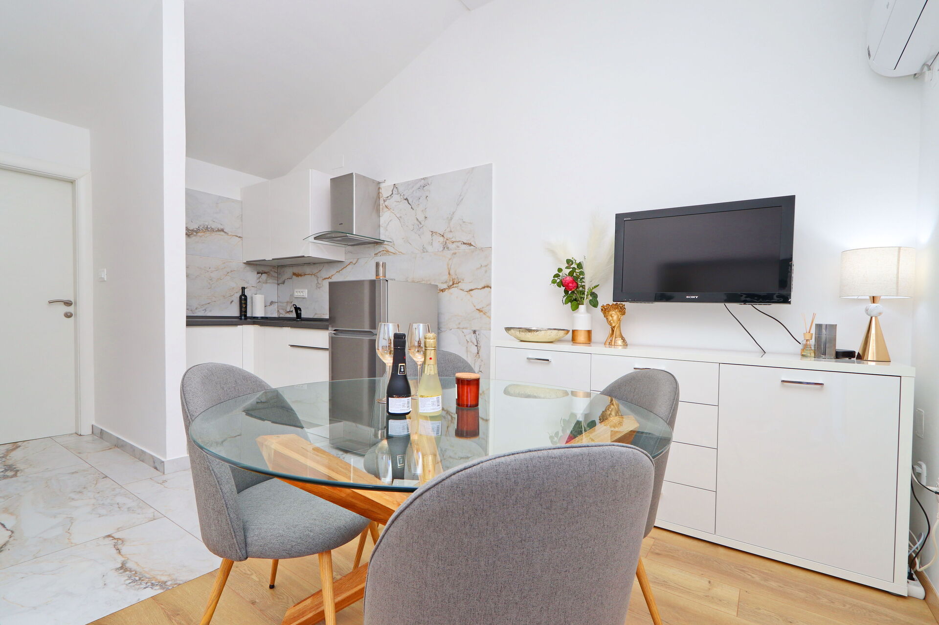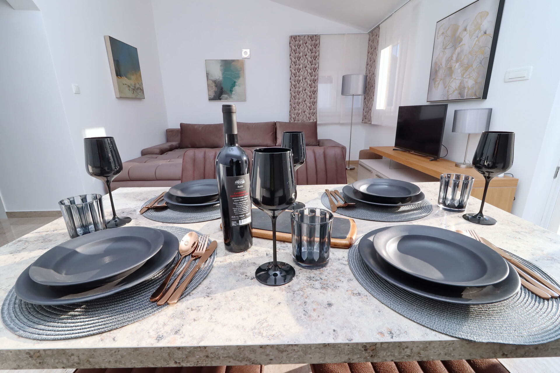 Die Inneneinrichtung jedes einzelnen Apartments ist schlicht, mit allem modernen Komfort ausgestattet. Zu jeder Wohnung gehört außerdem ein Außenbereich mit Balkon oder Terrasse. Im Schwimmbadbereich steht eine große überdachte Veranda mit einer komfortablen Außenküche mit eingebautem Grill und Spüle zur Verfügung, wo sich alle Gäste des Hauses zum gemeinsamen Essen und Entspannen treffen können.
