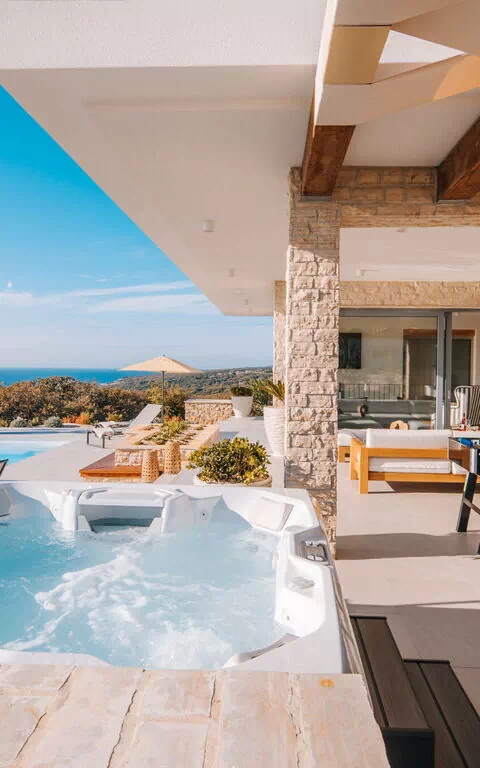 Diese bezaubernde Villa bietet nicht nur einen fantastischen Blick auf das Meer und die Umgebung, sondern wird den Urlaub auch entspannt und ruhig gestalten: Das schöne Schwimmbad vor einer großen Terrasse mit Sonnenliegen und der Whirlpool im Freien ermöglichen es den Gästen schönen Tage im Freien zu geniessen.