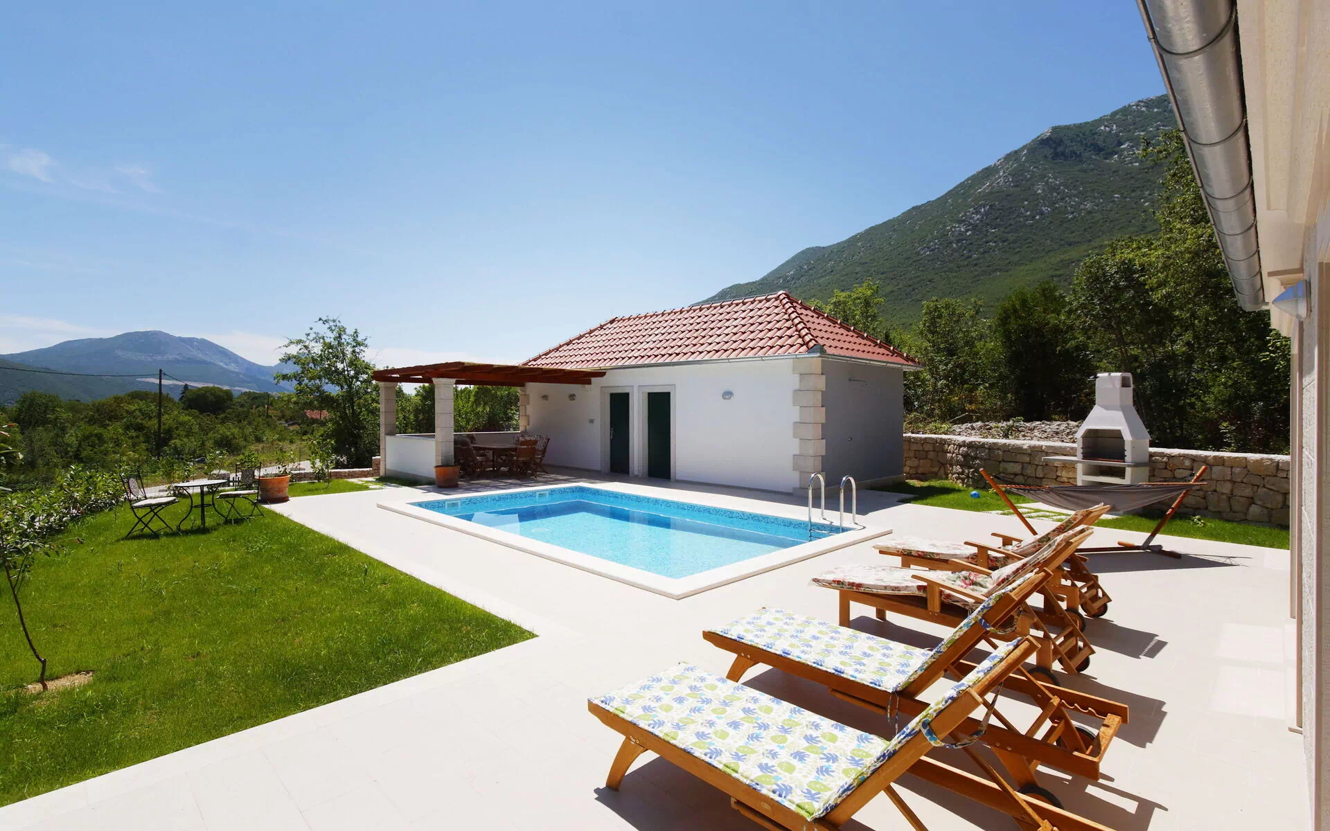 Im Außenbereich verfügt die Villa neben dem schönen Schwimmbad mit Sonnenterrasse und Sonnenliegen über einen eingebauten Grill und eine überdachte Veranda mit Tisch und Stühlen, auf der man im Freien essen kann: das ganze Grundstück ist umgeben von einem gepflegten Rasen.
