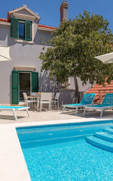Der Außenbereich der Villa bewahrt die Privatsphäre der Gäste und verfügt über ein schönes Schwimmbad mit Sonnenterrasse und Grill.