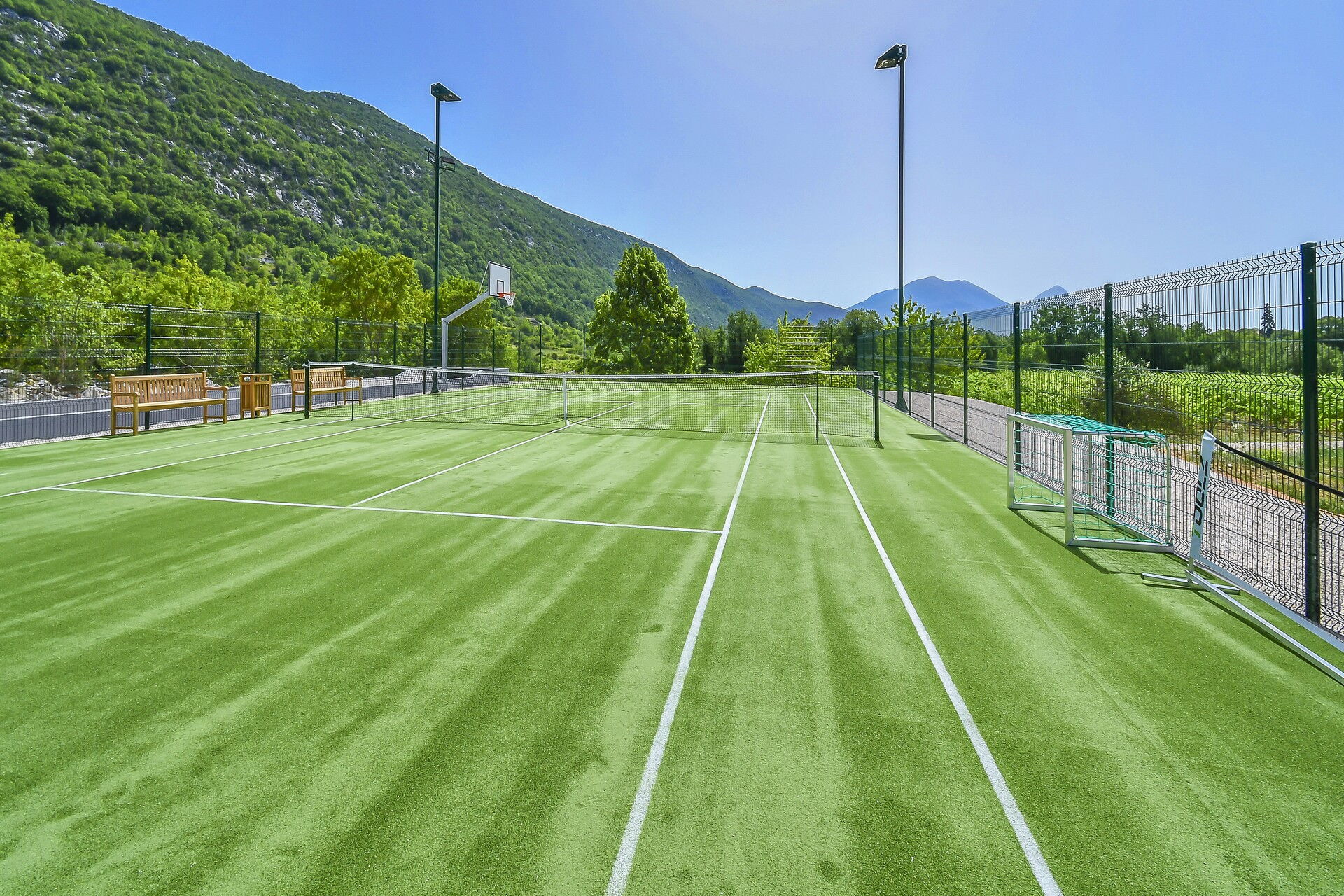 Sportbegeisterte erreichen in wenigen Schritten einen Sportbereich mit: Minigolf, Tennis-/Fußball-/Basketballplatz und Bowlingbahn.