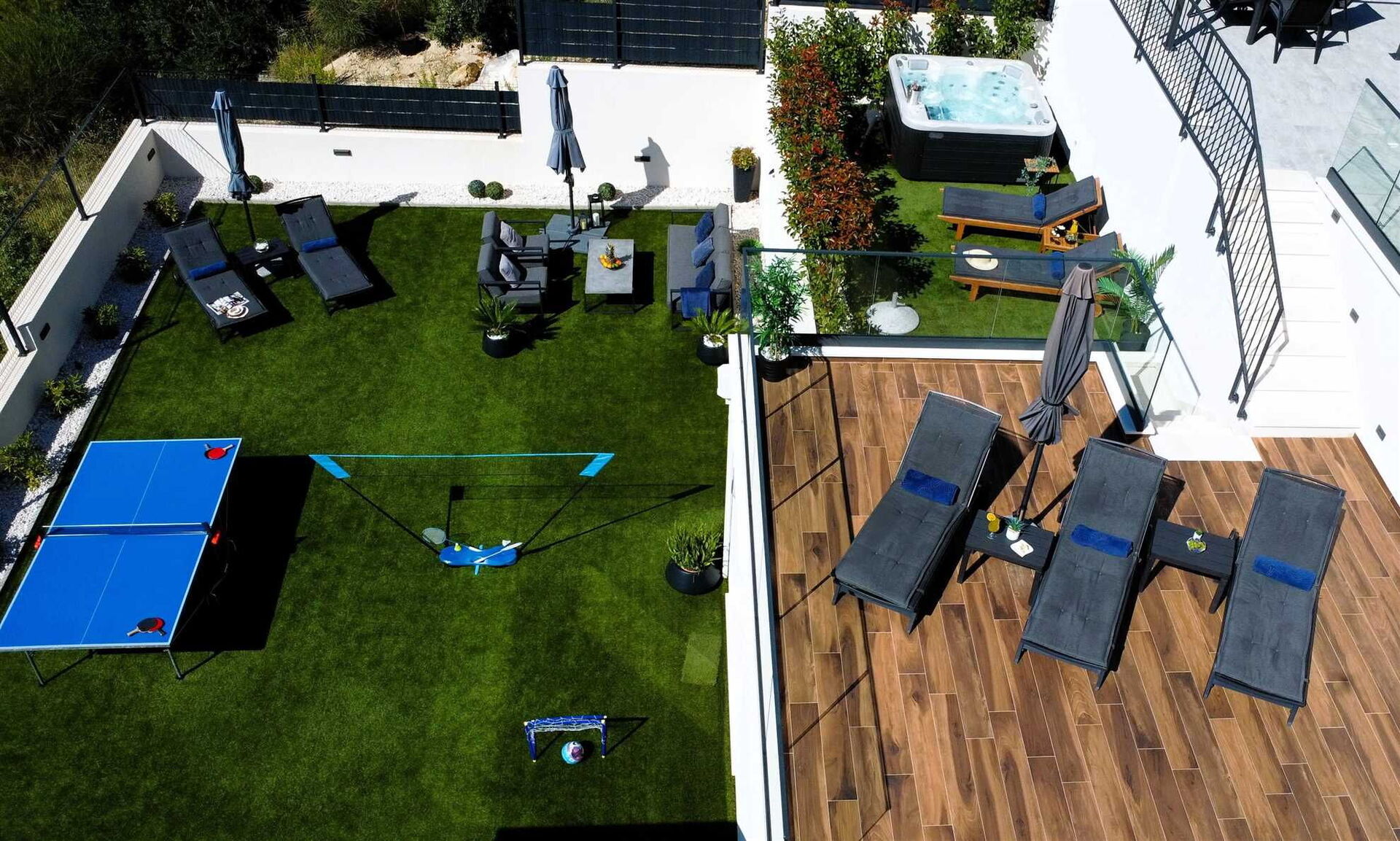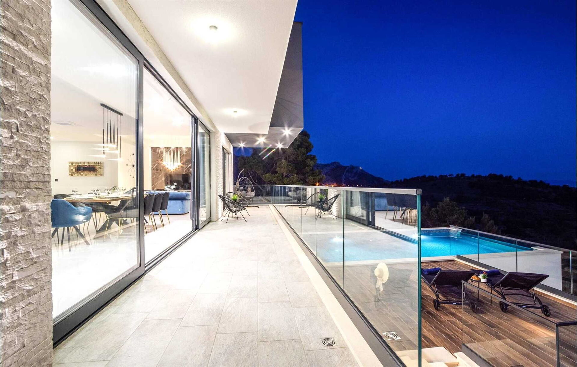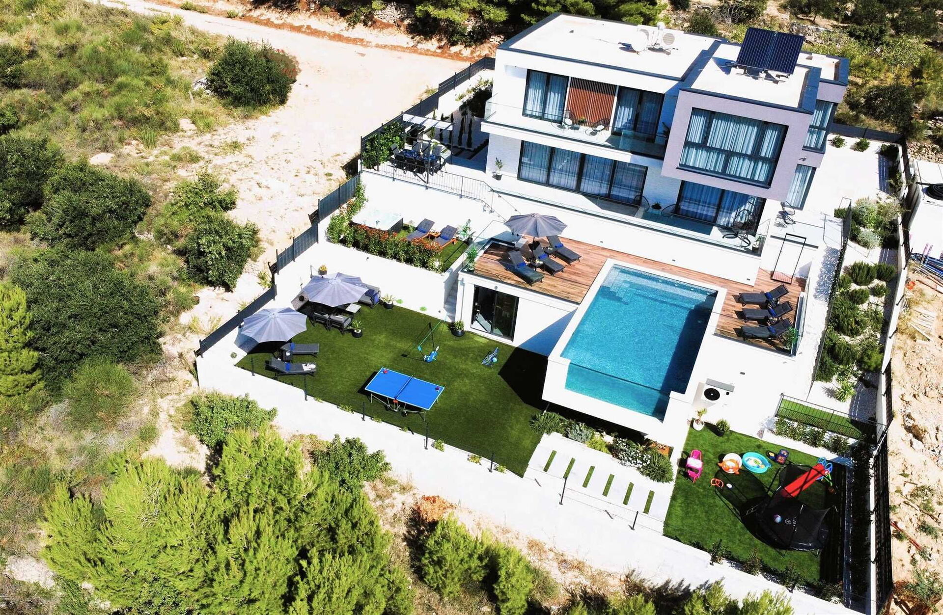 Villa Nikta ist sowohl im Innen- als auch im Außenbereich in mehrere Etagen unterteilt. Die Villa erstreckt sich über 2 Etagen mit 5 Schlafzimmern und 5 Bädern und bietet Platz für bis zu 10 Personen; Der terrassenförmig angelegte und auf mehreren Ebenen angelegte Garten bietet einen Bereich mit einer Hydromassagewanne, ein spektakuläres Schwimmbad und einen Kinderspielbereich mit Trampolin und Tischtennisplatte.
