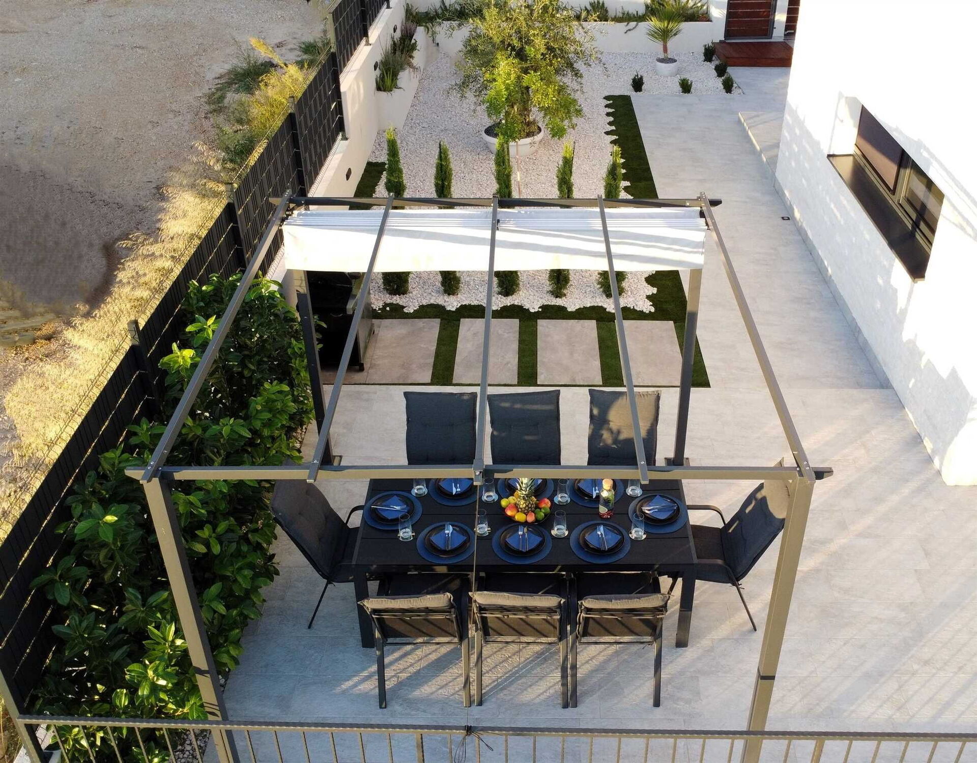 - große Terrasse mit Pavillon mit Tisch und Stühlen