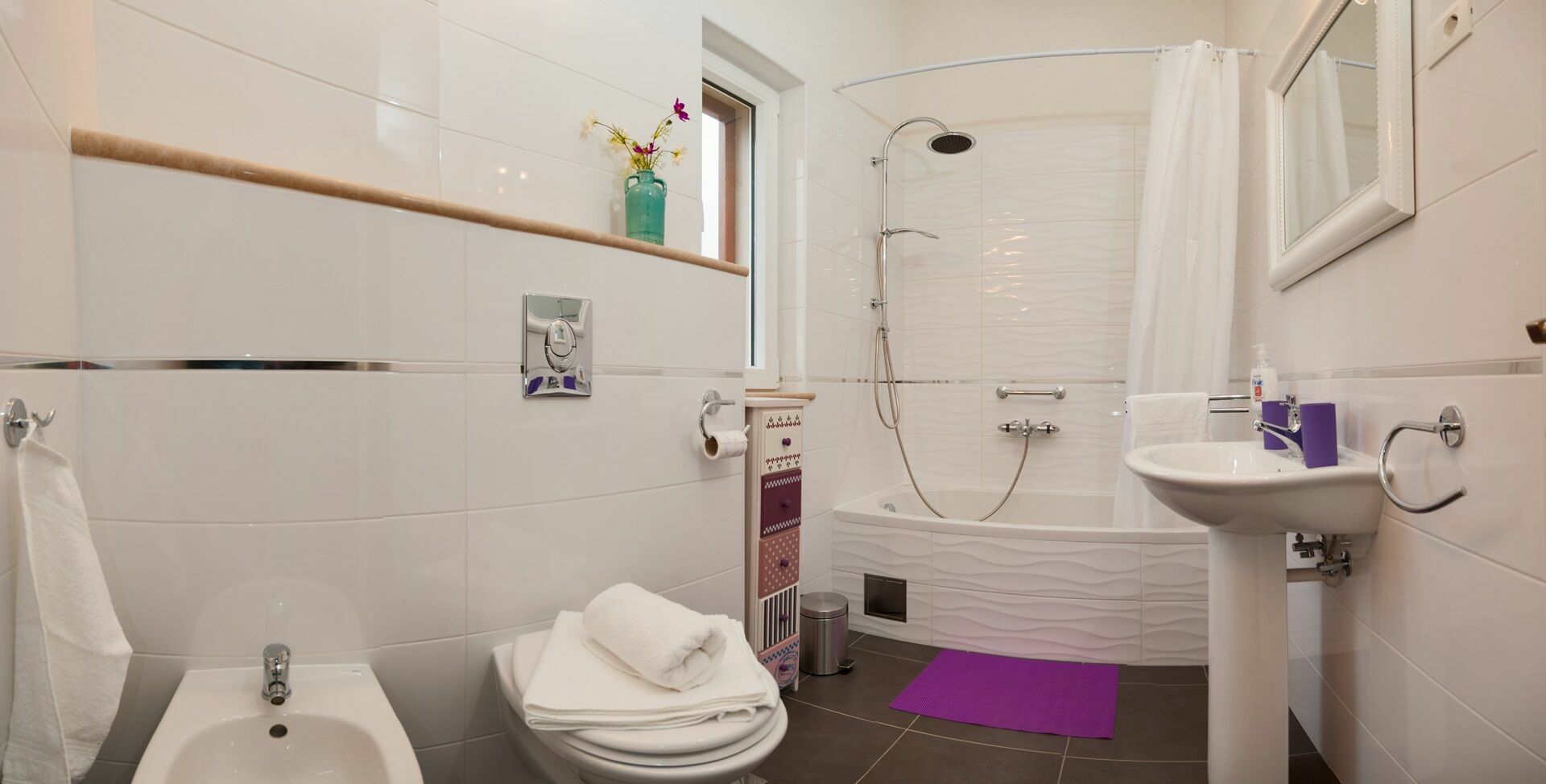 Wohnzimmer mit Essbereich und Küche, 2 Doppelzimmer jeweils mit Ehebett und jeweils mit privatem Bad mit Dusche, Zweibettzimmer mit privatem Bad mit Badewanne.