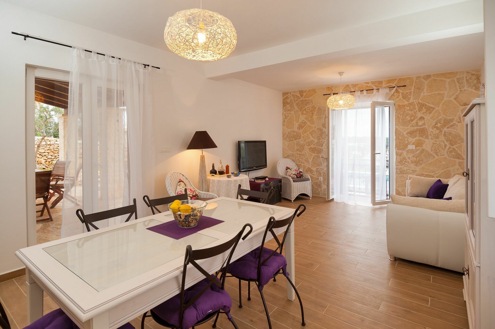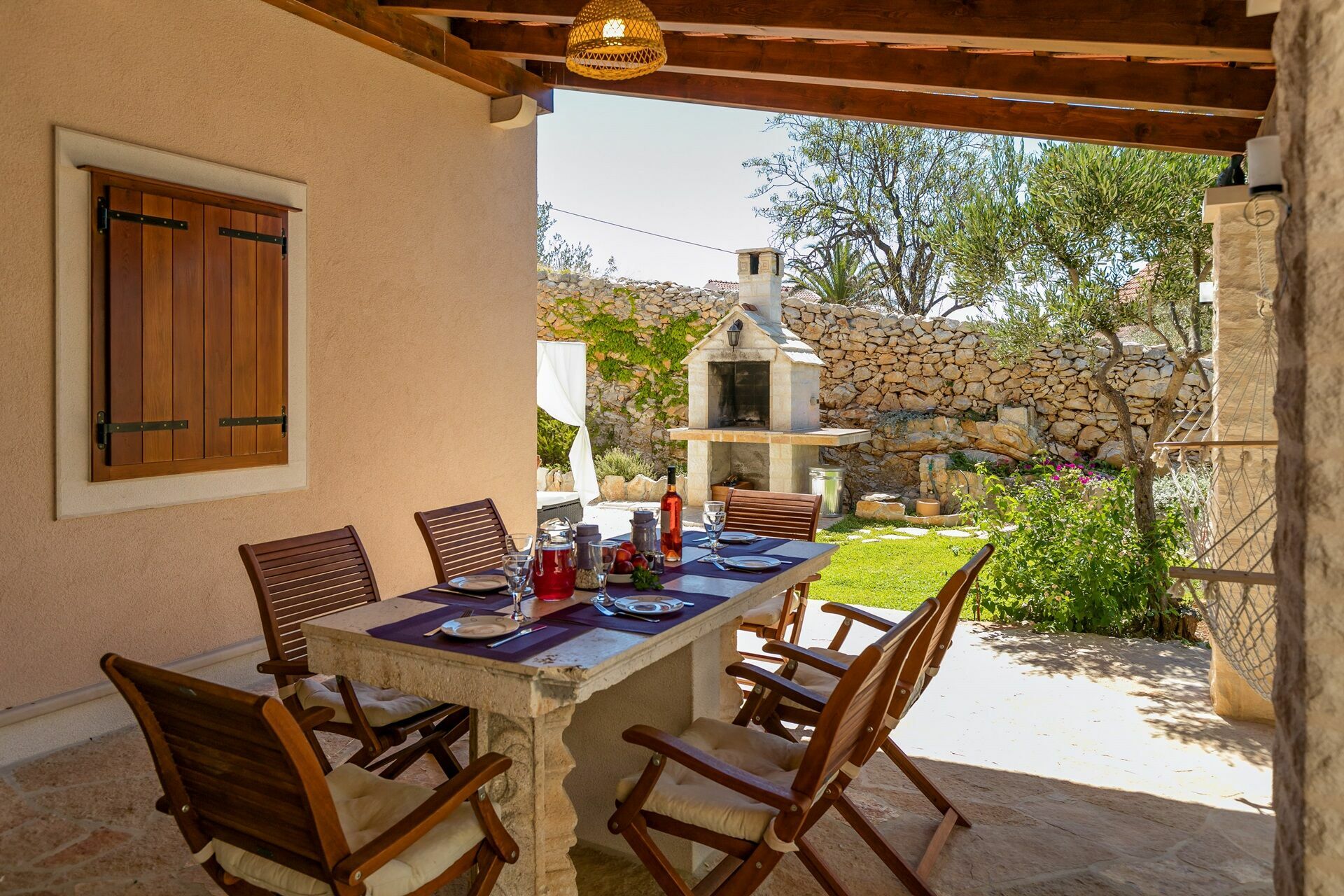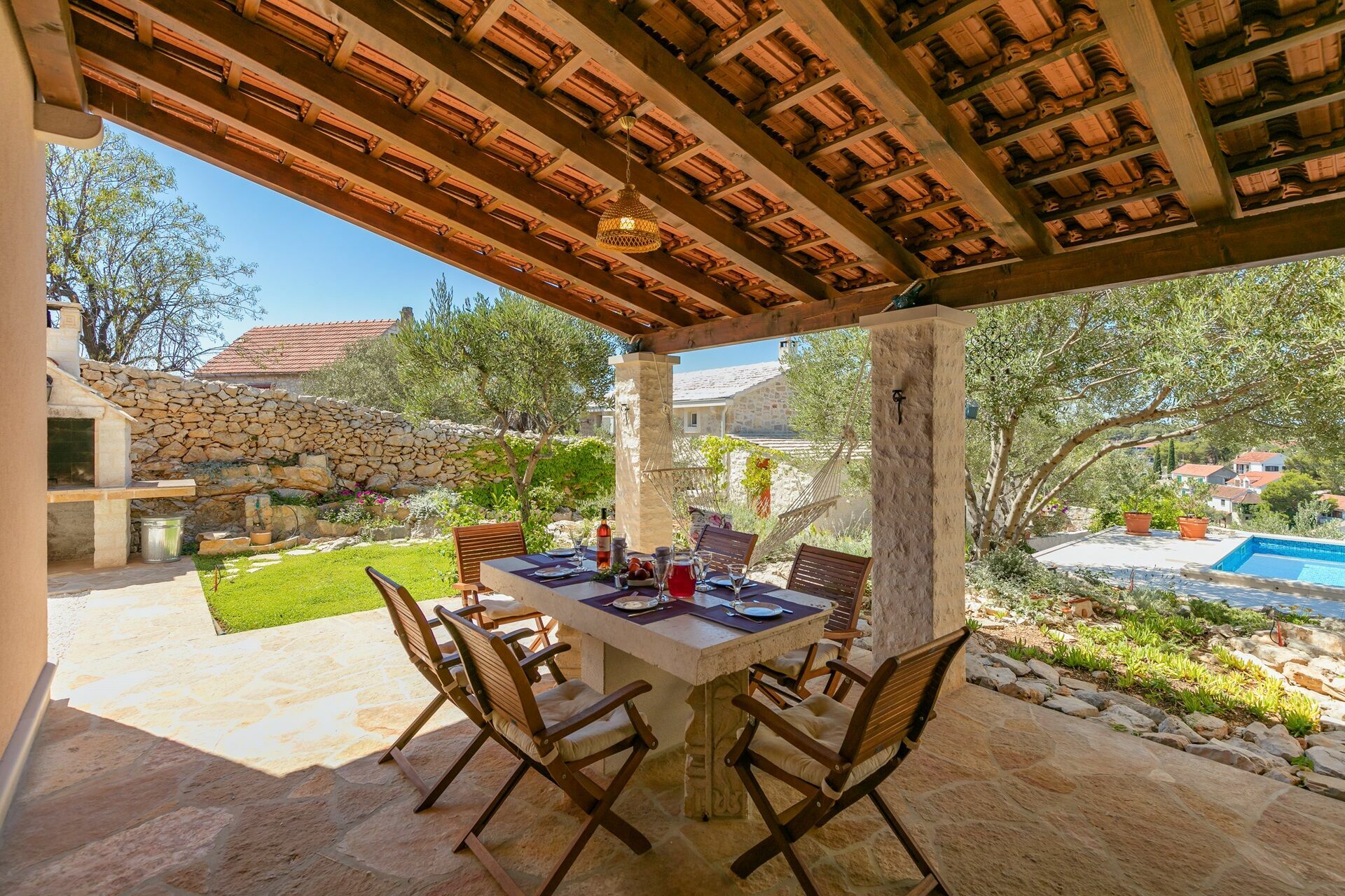 Ein Essbereich unter der Veranda des Hauses macht es den Gästen möglich, Mahlzeiten im Freien zu organisieren und einen atemberaubenden Panoramablick über die Bucht von Milna zu genießen.