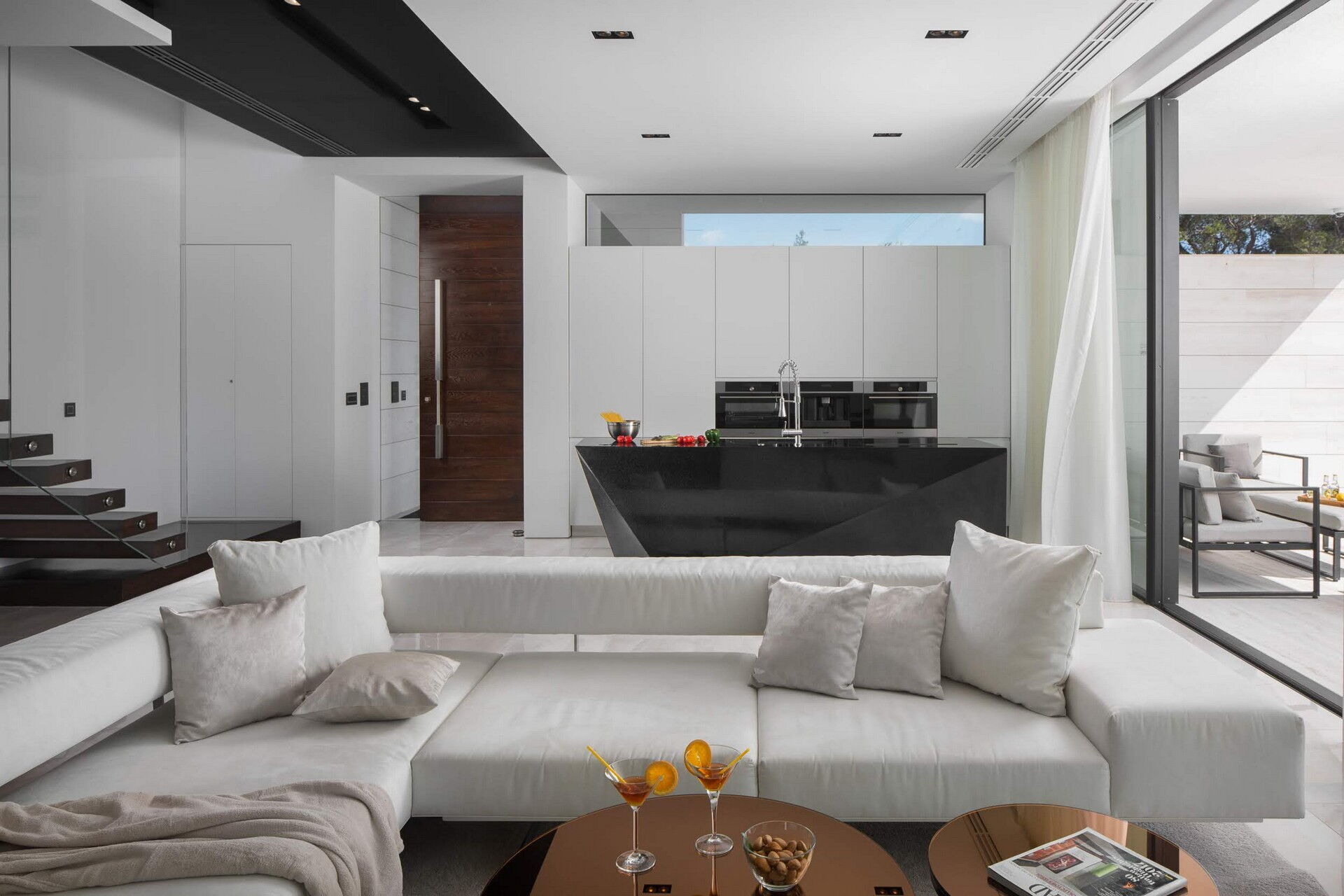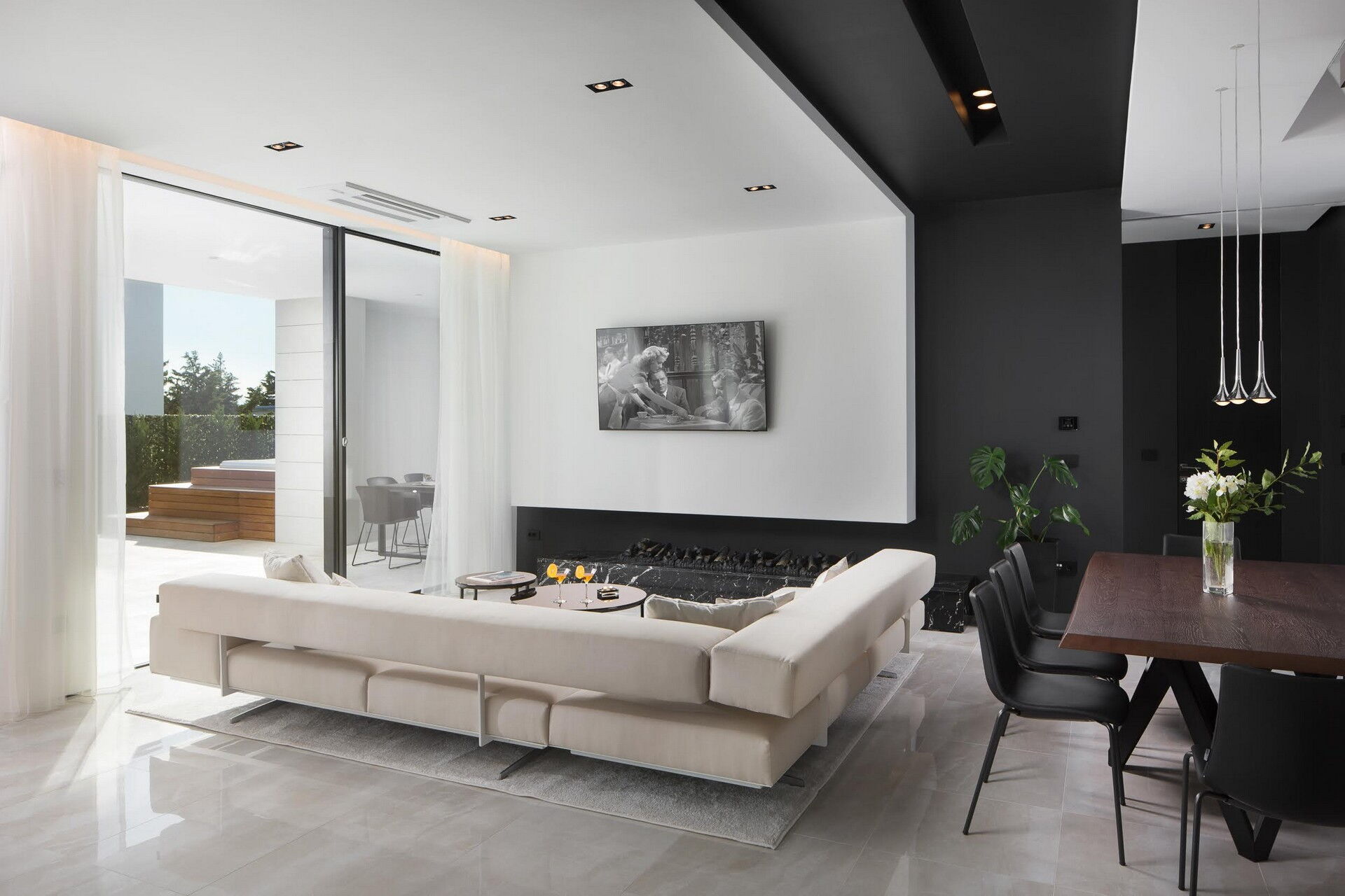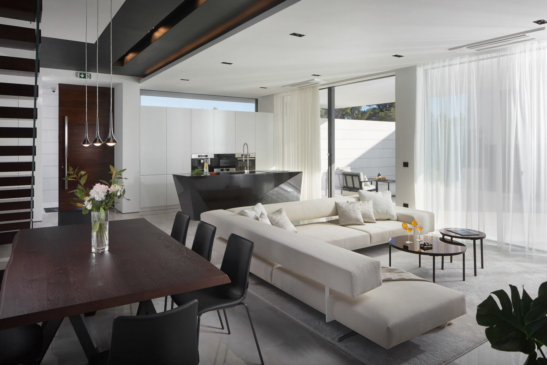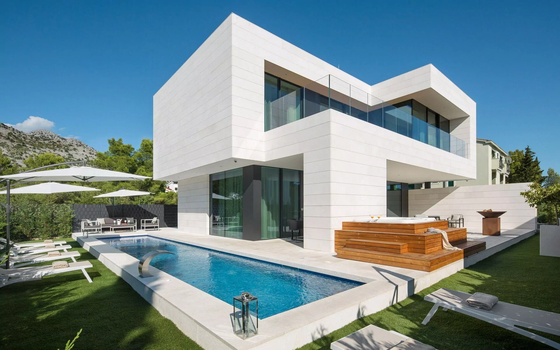 Die innovative Architektur des Bauwerks spiegelt sich auch im Aussenbereich in der besonderen Lage und Form des Schwimmbades (auf Anfrage und gegen einen Preis pro Verbrauch beheizbar), des Whirlpools (ebenfalls beheizbar, aber ohne zusätzliche Kosten) und des Grills wider; Außerdem bietet die Villa eine große überdachte Veranda mit Essbereich und Ruhebereich.