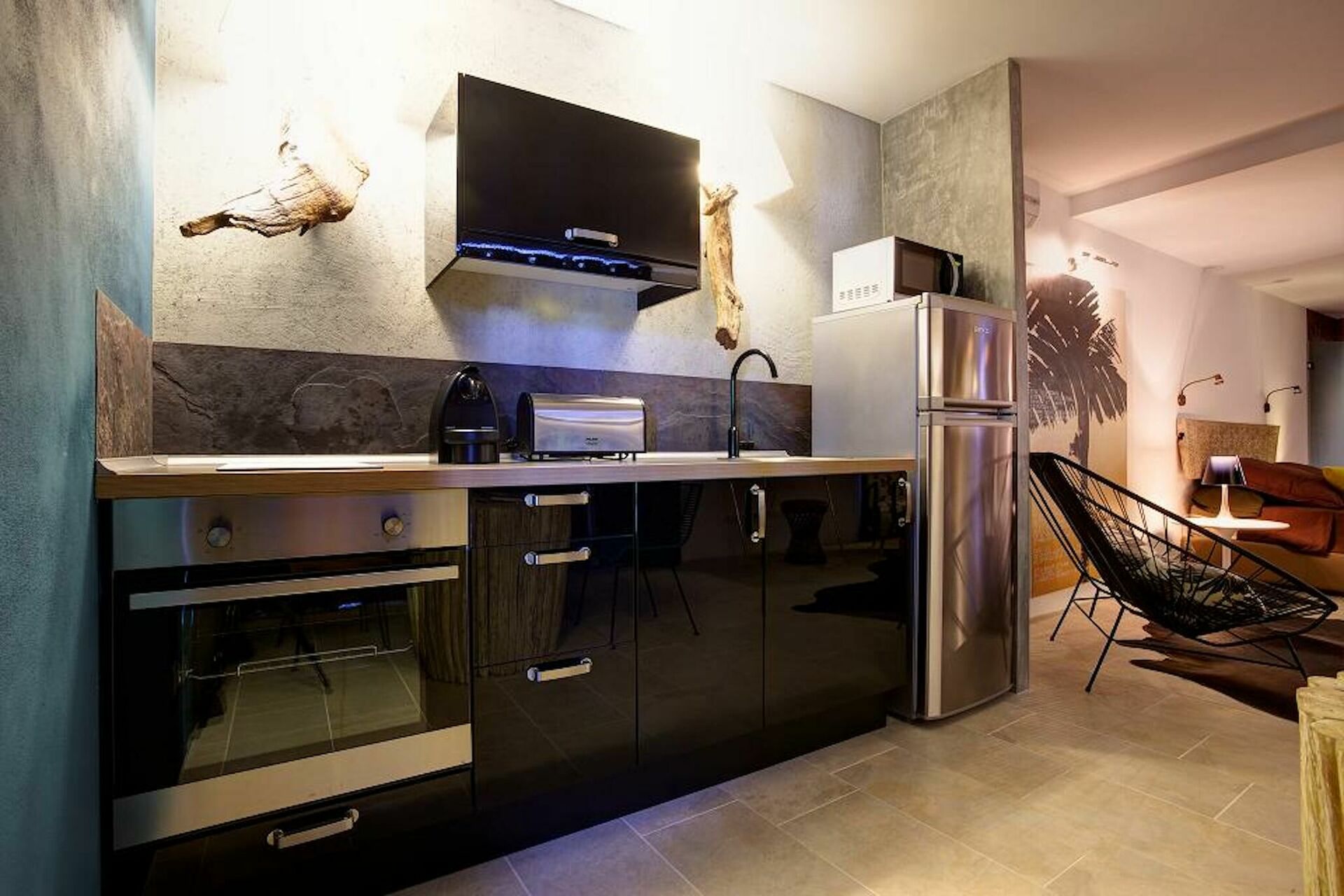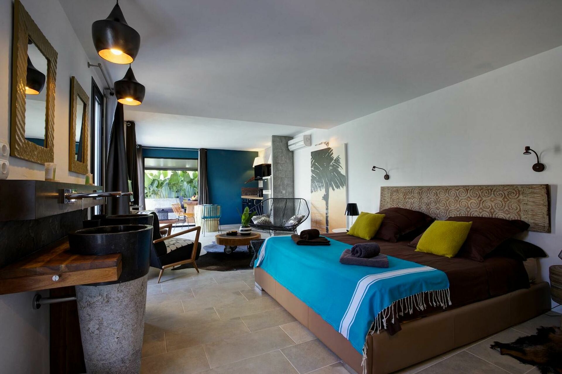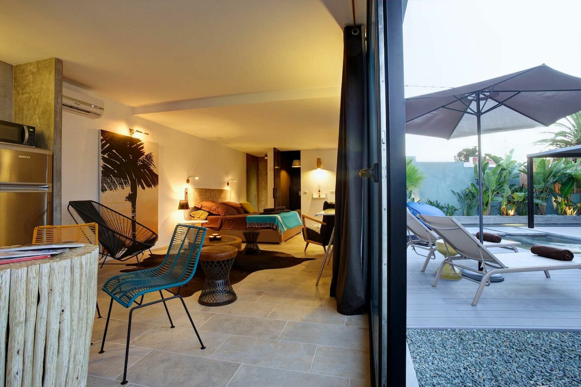 Wohnzimmer, Essbereich und gut ausgestattete Küche, Doppelzimmer mit privatem Bad mit Badewanne und Dusche und Zugang zu privatem, ausgestatteten Aussenbereich.